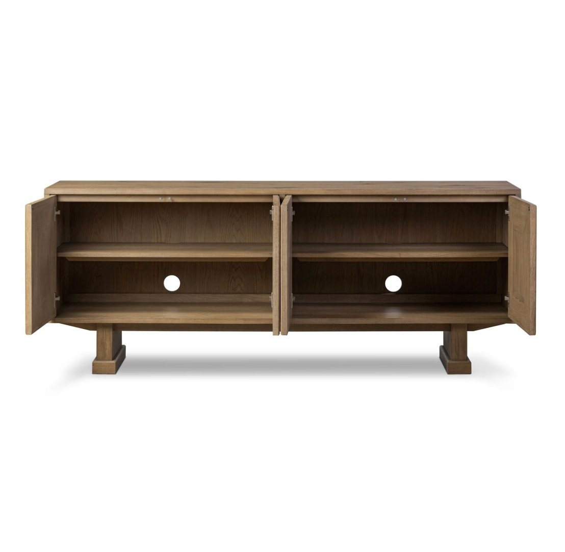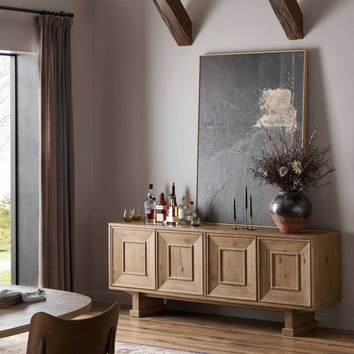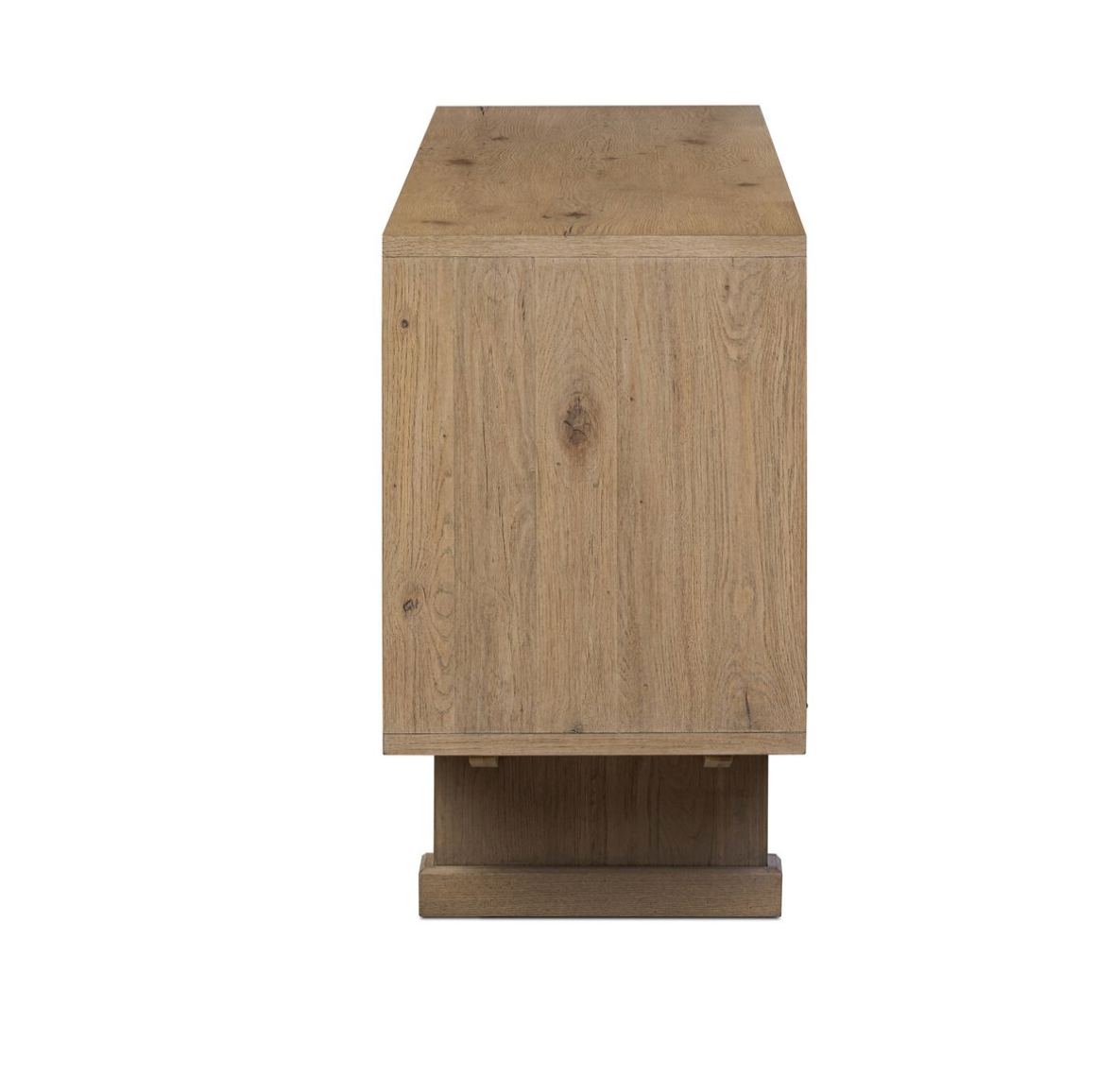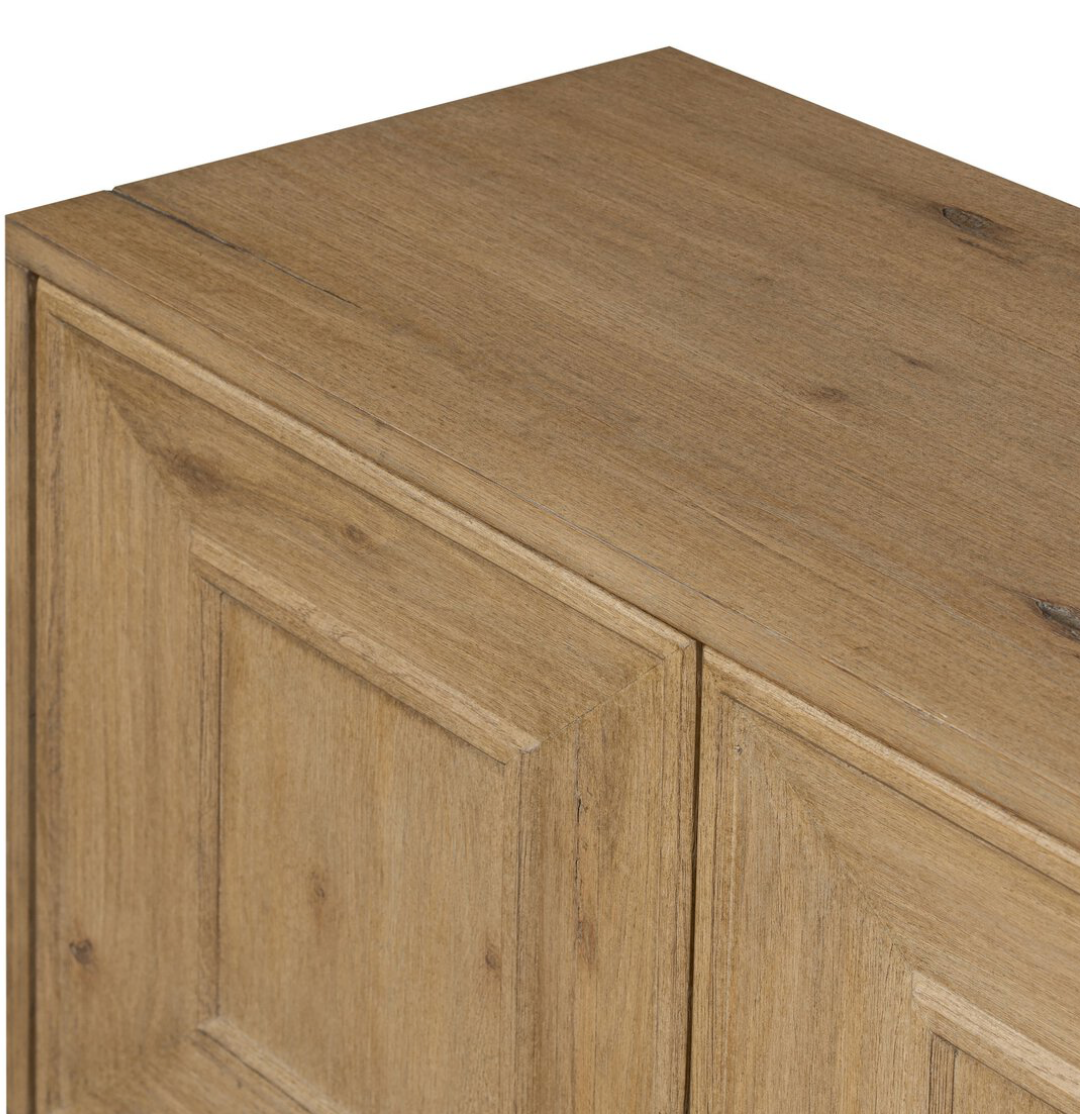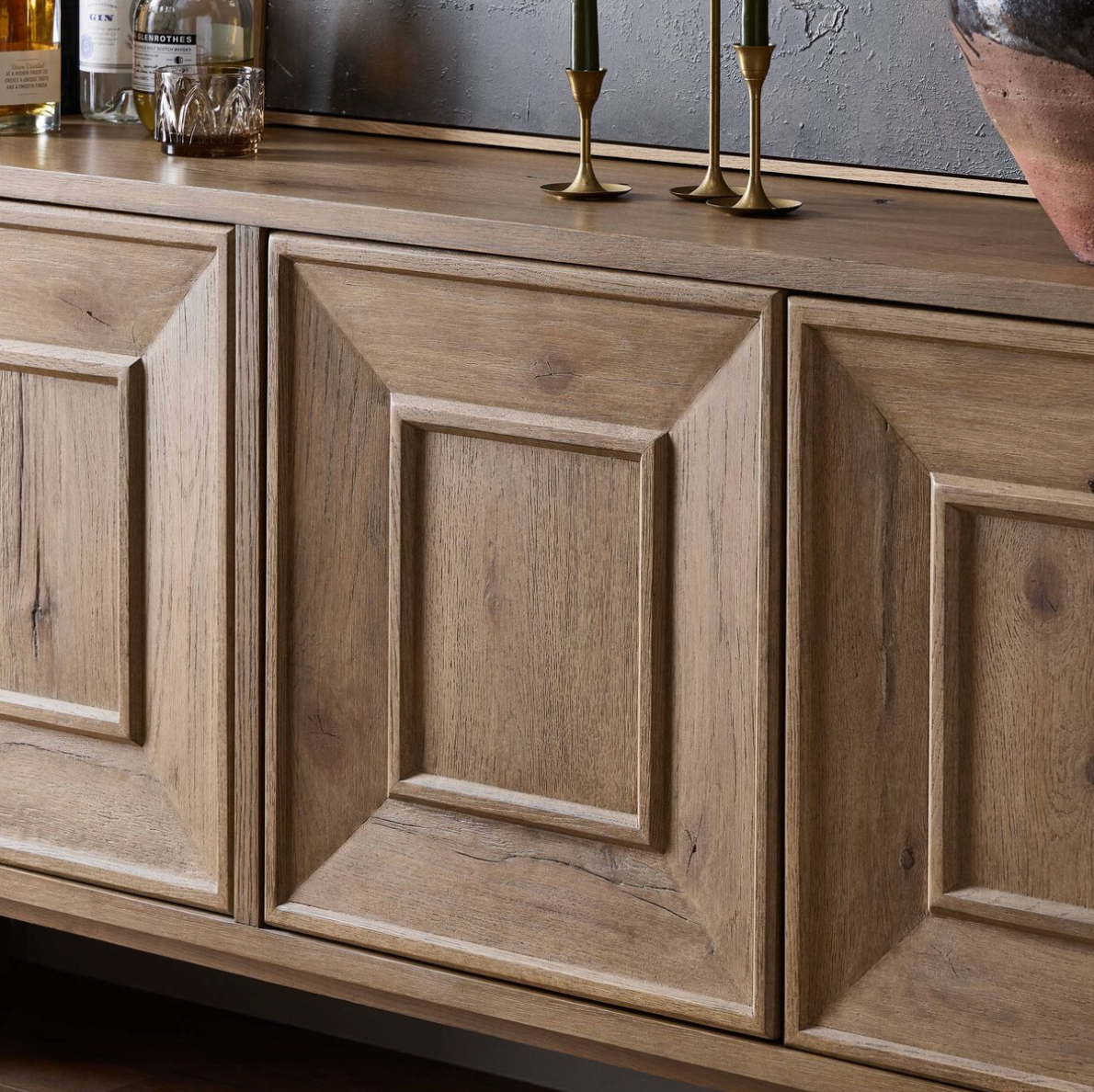 Store favorite dinnerware, table linens and more in this modernized Deco sideboard, with inverted chamfered framing and molding around the doors. Made from solid oak with a light, drifted finish and ski-style legs that elevate the whole piece.