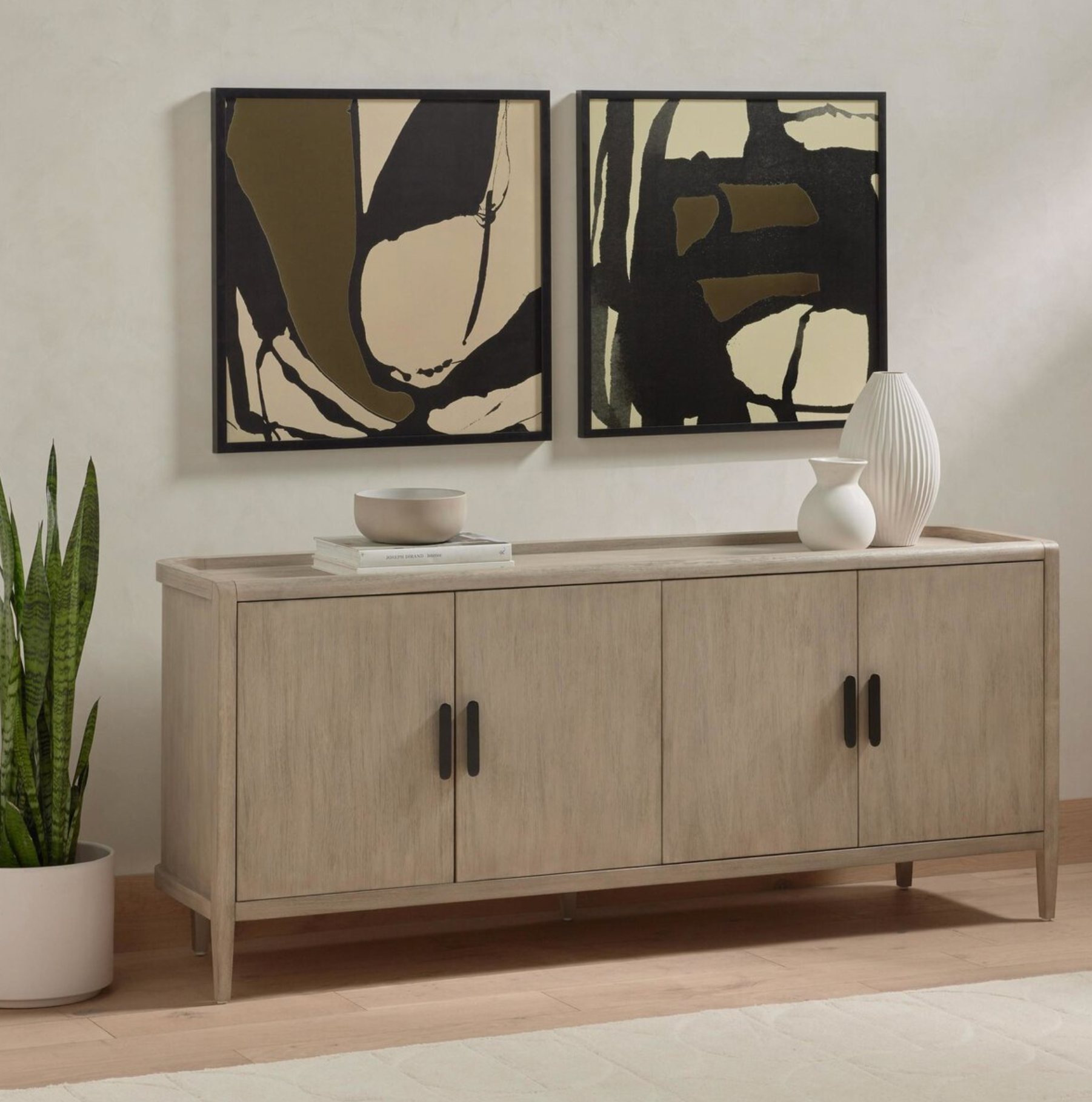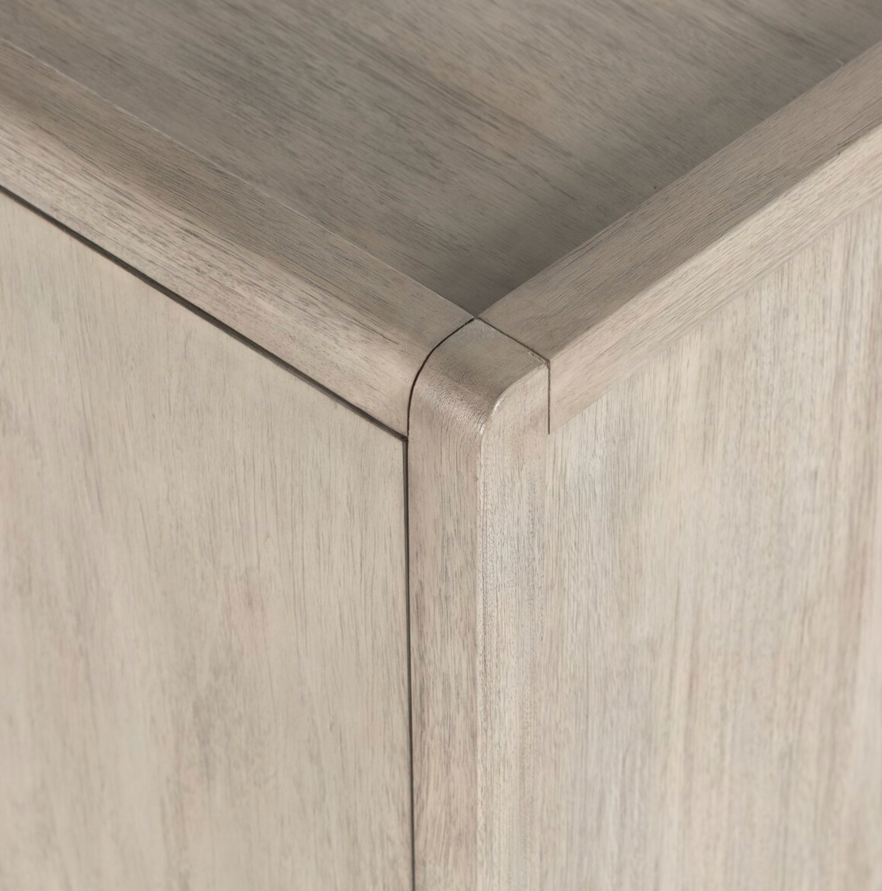 Made from solid mahogany and finished in a versatile white-grey, a spacious sideboard with adjustable interior shelving and a tray-style top awaits storage of serving ware, table linens and more. Black aluminum hardware crafts a linear look with cool contrast, while rear cutouts keep cords out of sight.