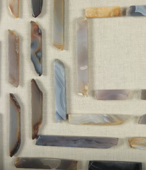 Wood-framed wall art featuring agate stones, perfectly placed to create a series of dashed lines in rectangular "c" formations.