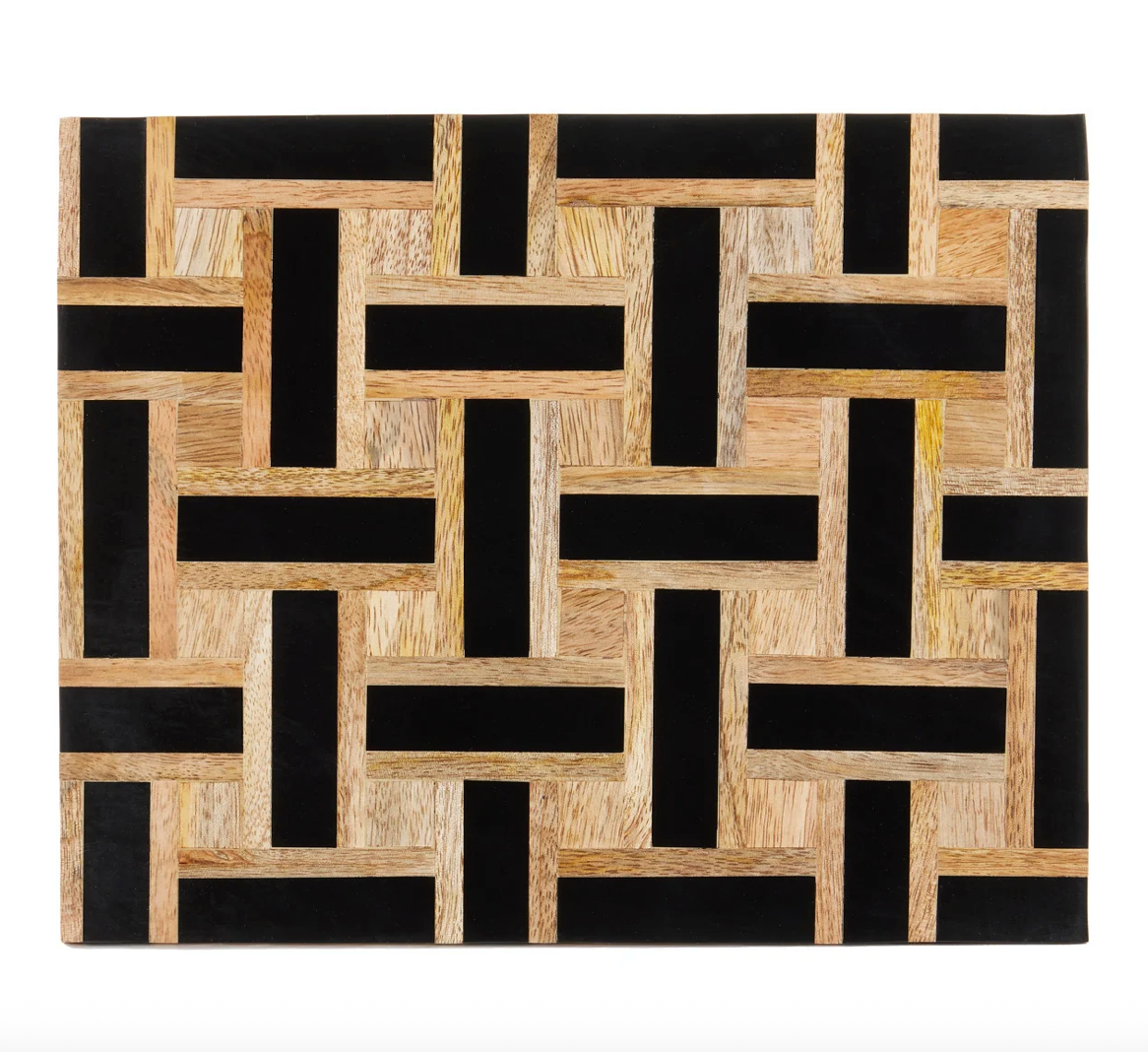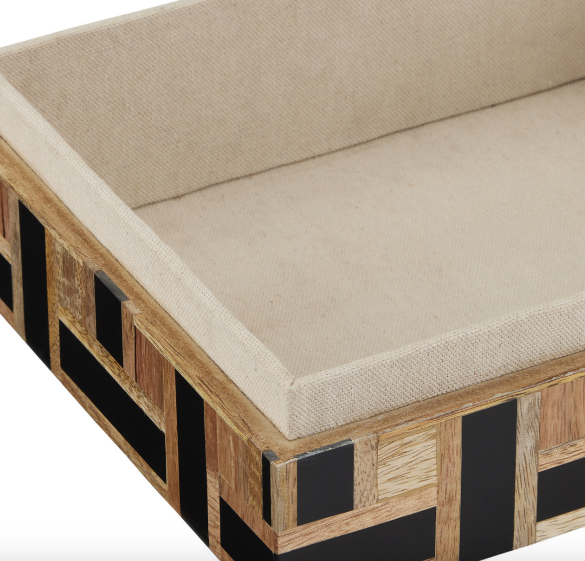 The Aran Black Box Set with its basket-weave pattern is made of pieces of wood interspersed with strips of black composite. The contrast of the textural woodgrains and the sleek composite creates such an interesting aspect to this design, as does the angular lines of the overall rectangular shapes that echo the elongated pieces on their surfaces. The interiors of the boxes are covered in white linen.