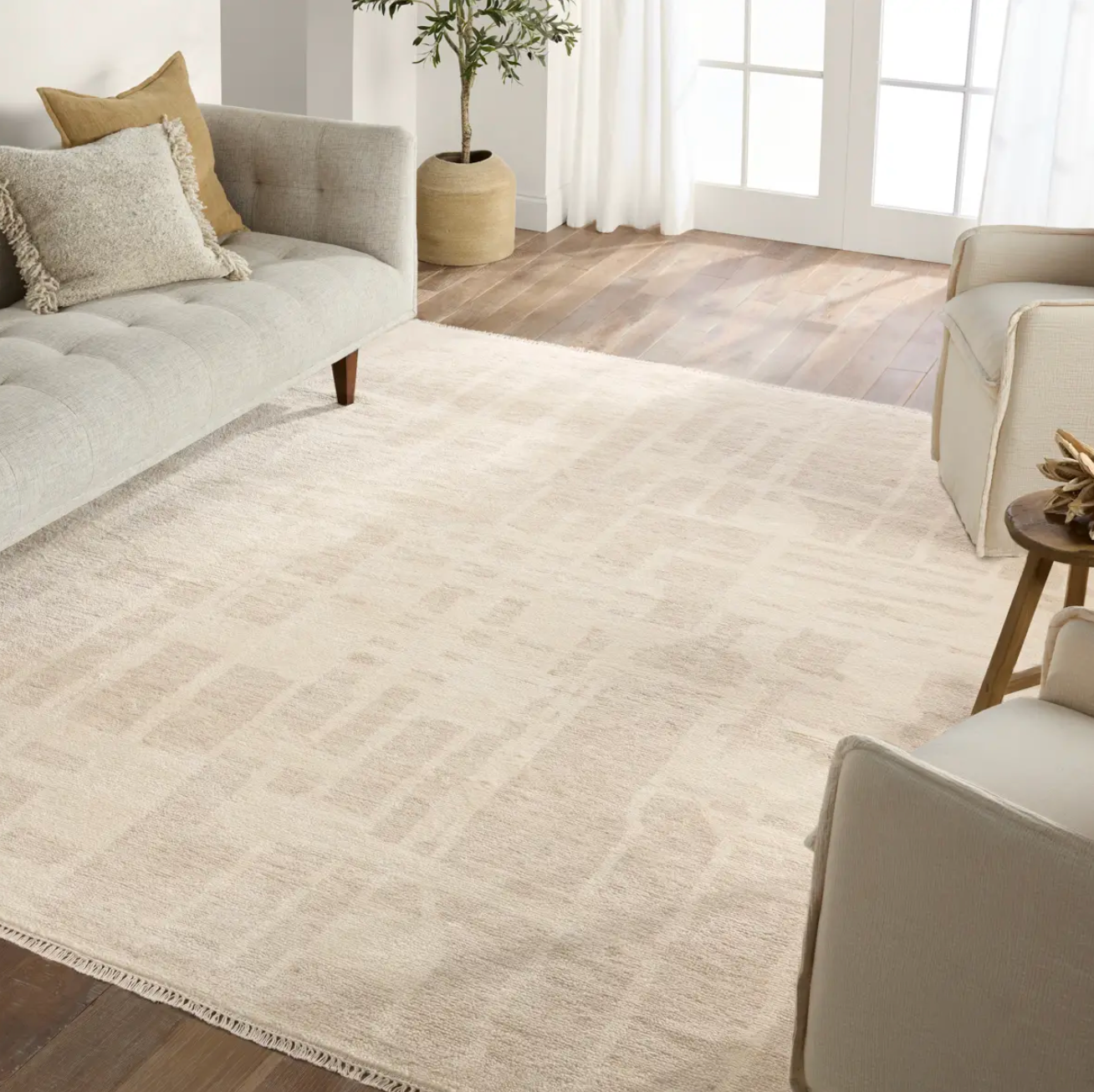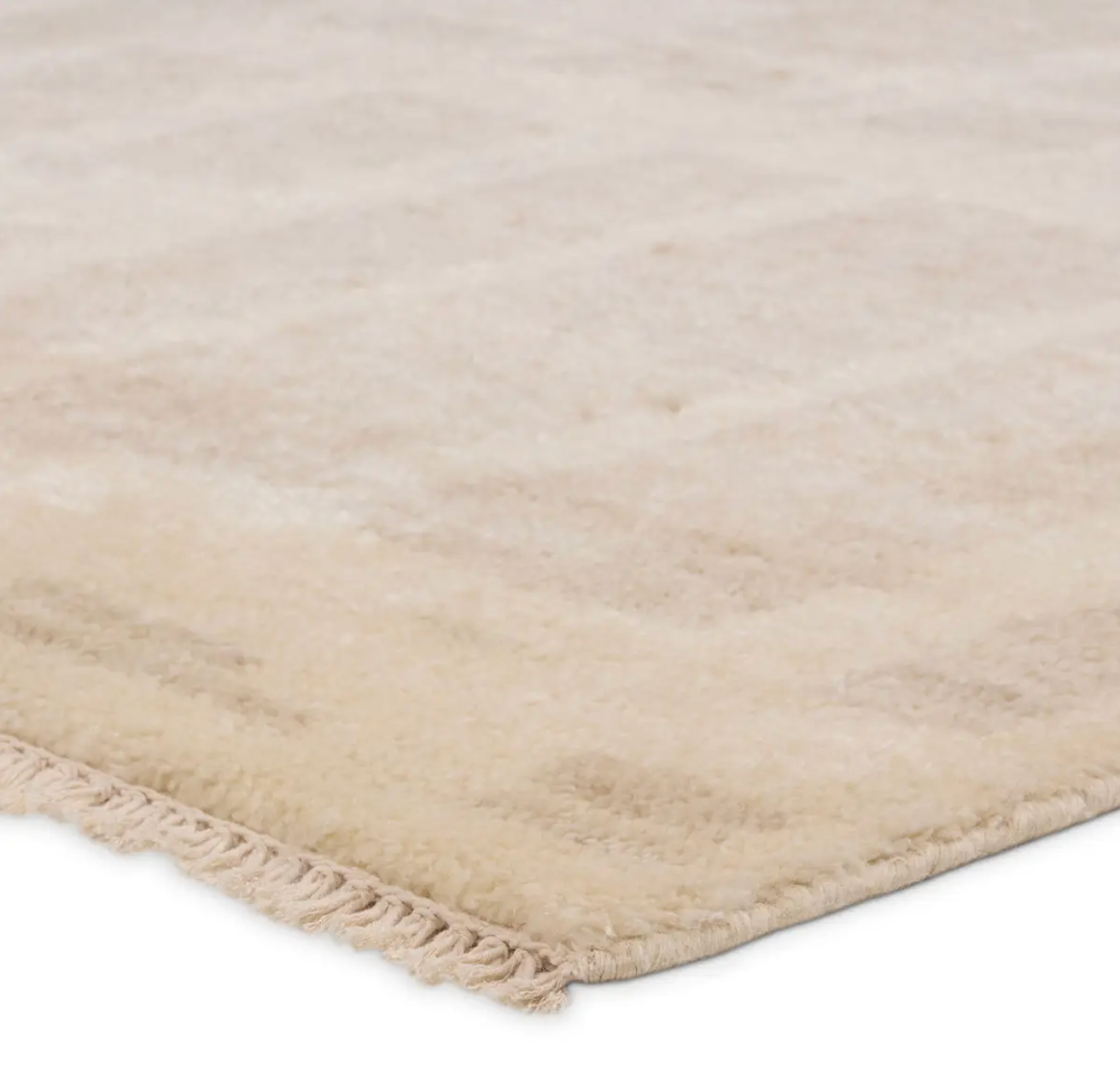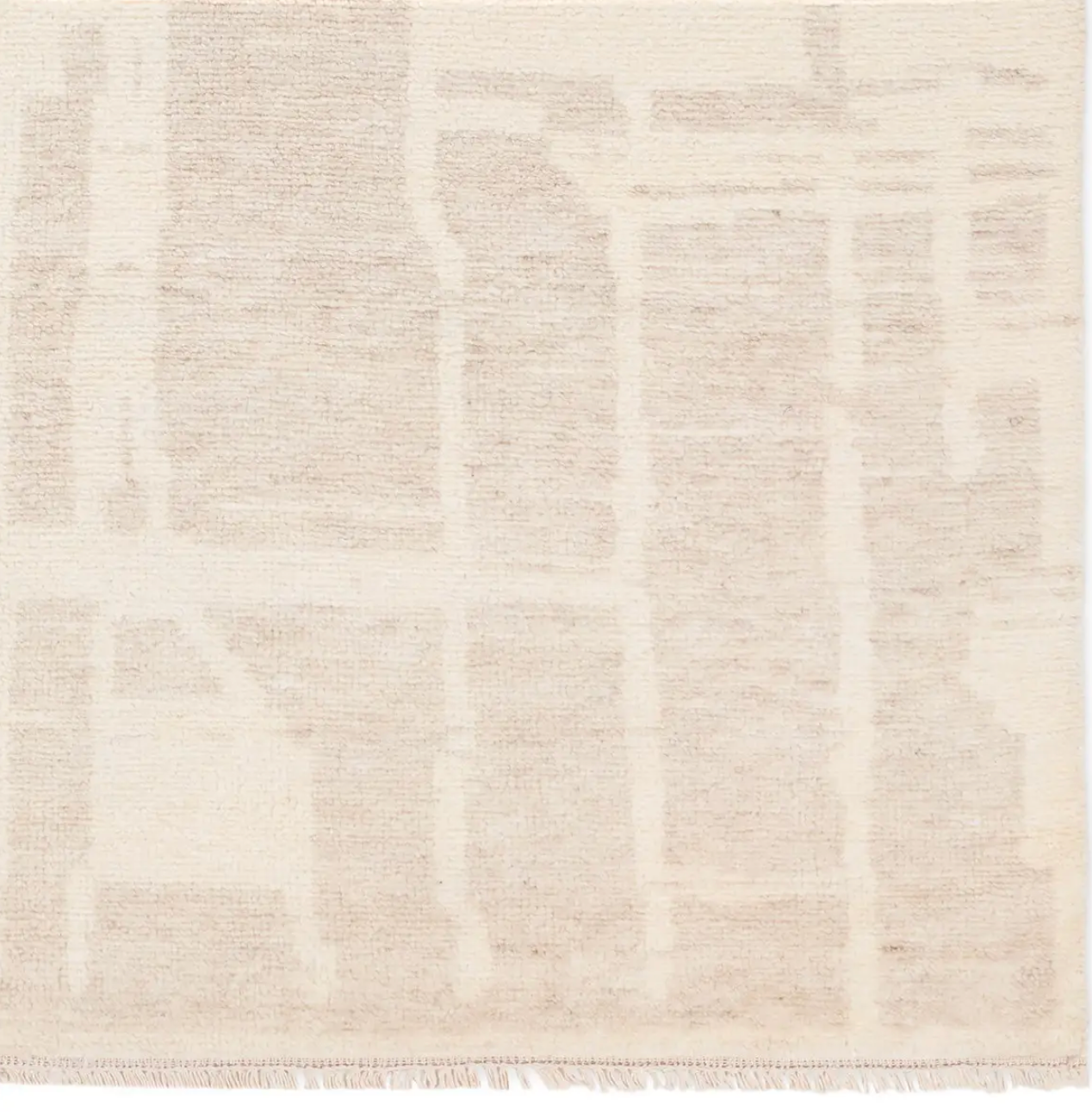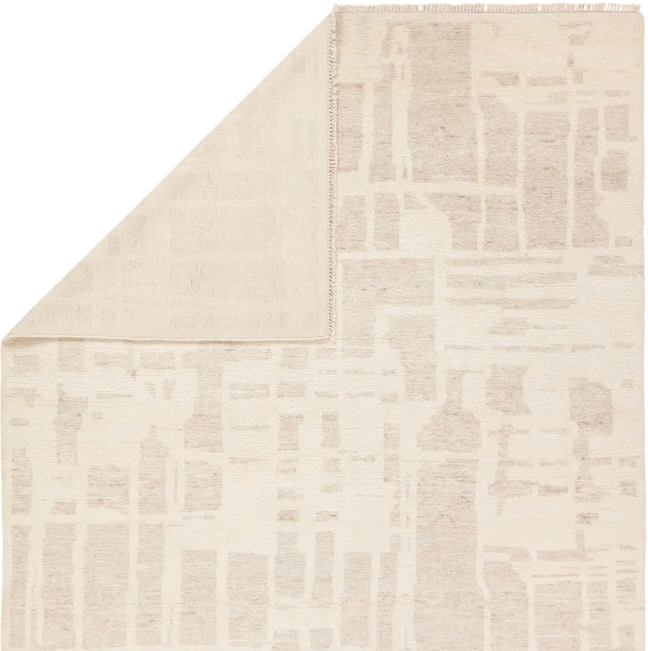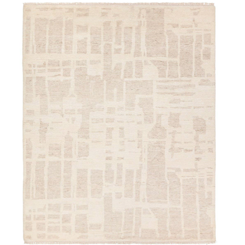 Hand carded wool, soft Tencel, and a neutral color palette define the handknotted Ashend collection. The Airme rug showcases a Moroccan-inspired abstract motif in a neutral, cream, taupe, and beige colorway. Short, cream fringe adds to the global charm while the lustrous sheen establishes an elevated look. This accent piece provides comfort underfoot while adding texture to low traffic spaces of the home such as bedrooms, formal living areas, formal dining areas, and sitting rooms. Expertly handcrafted in India, this rug is certified by both Nest and RugMark, assuring ethical luxury.