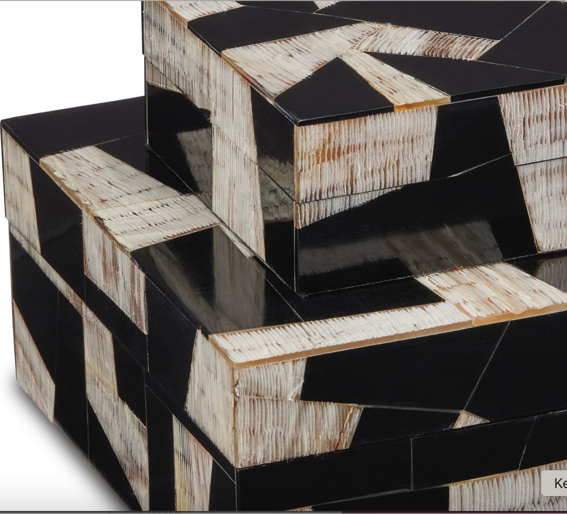 The Bandera Box Set is a modernist-inspired accent for any space. Made of pieces of black composite and buffalo horn, which is chiseled to bring the surface added texture, the ivory and black decorative boxes make a statement wherever they are placed. The interiors are lined with linen, and both large and small boxes have a felt bottom to complete the feeling of fine detailing.