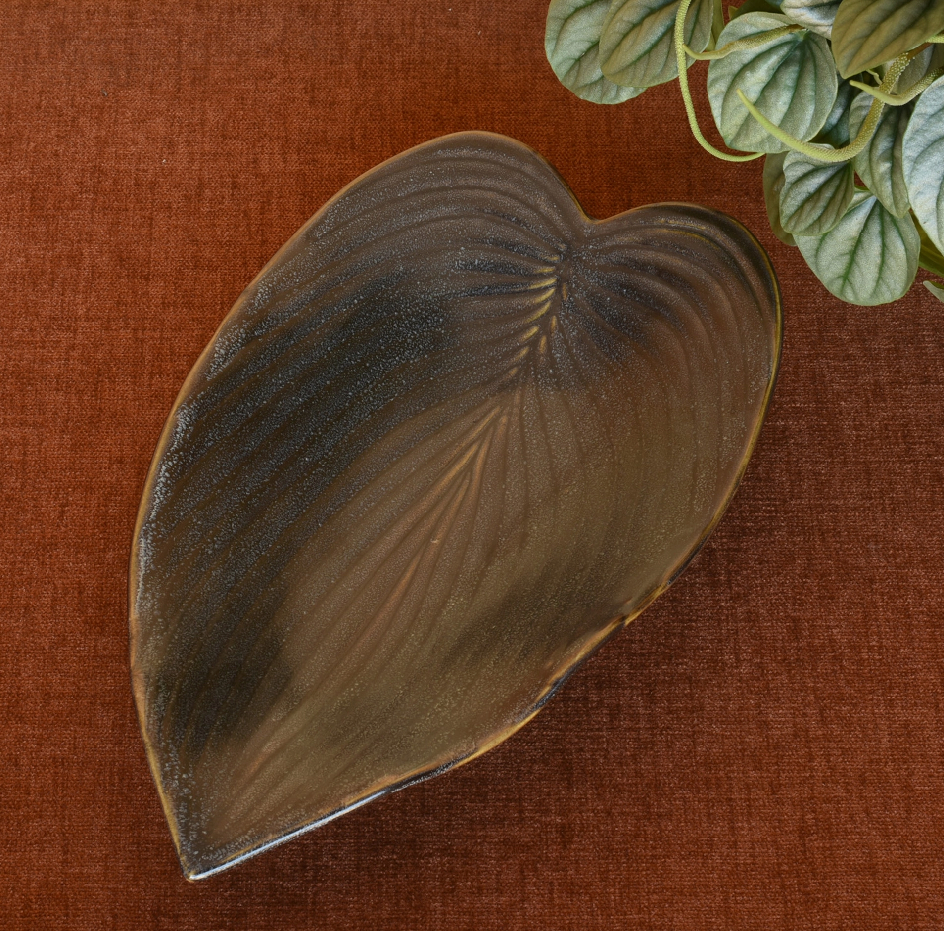 A lustrous bronze glaze with subtle green specks adds further depth to the sculpted leaf shape of this unique tray, suitable as a jewelry catch-all or as a statement appetizer plate. Food and dishwasher safe.