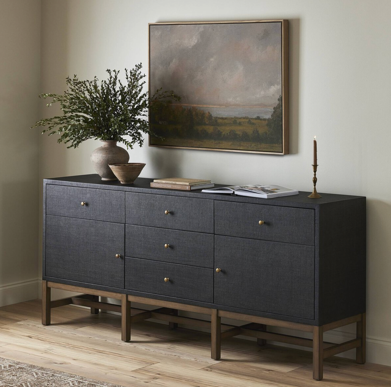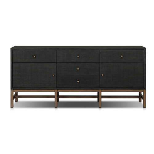 Woven black raffia places a texture-driven twist on sideboard storage. Five roomy drawers and two cabinets feature simple hardware finished in an antique brass, all supported by an open, airy base of solid mahogany.