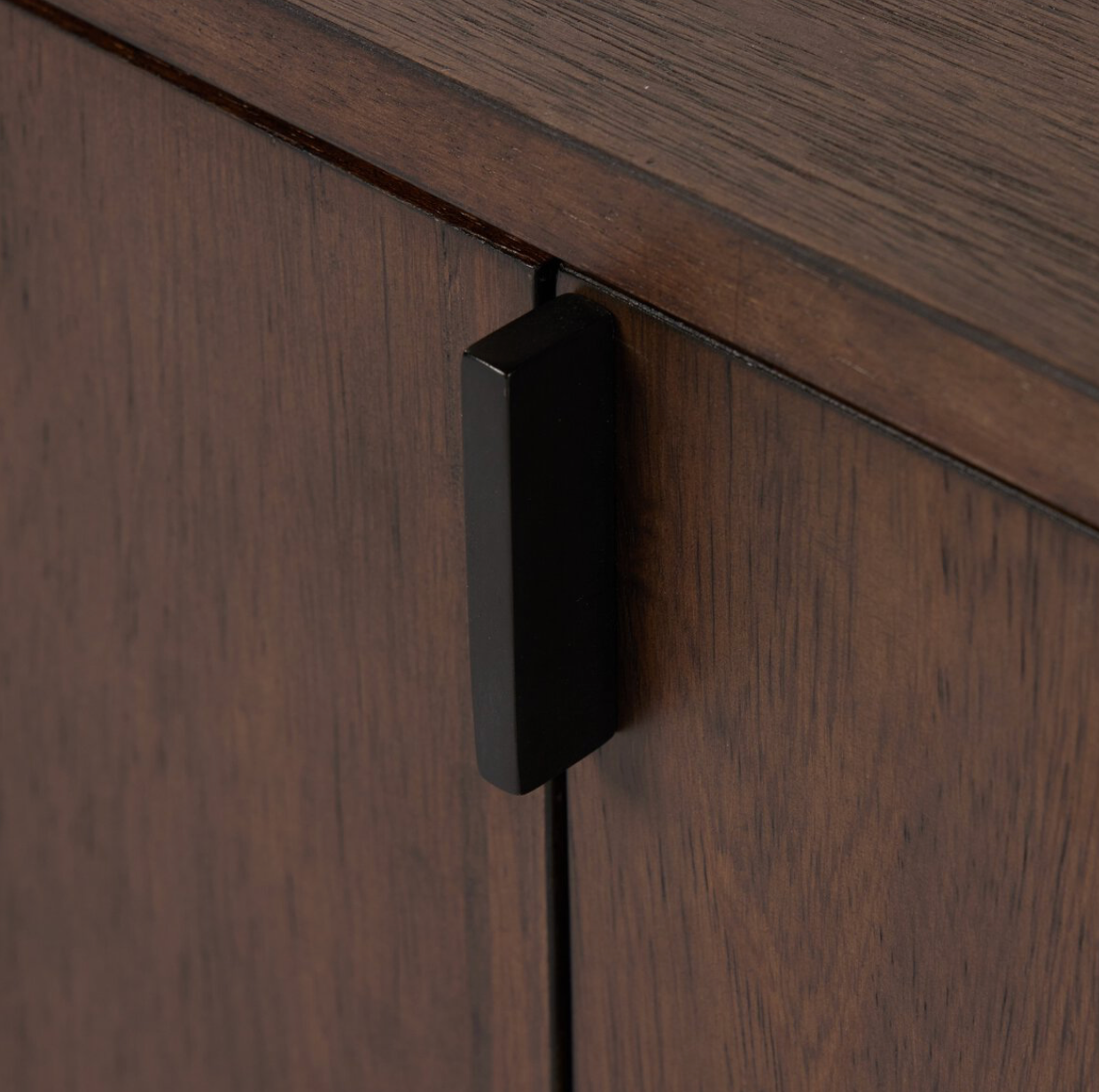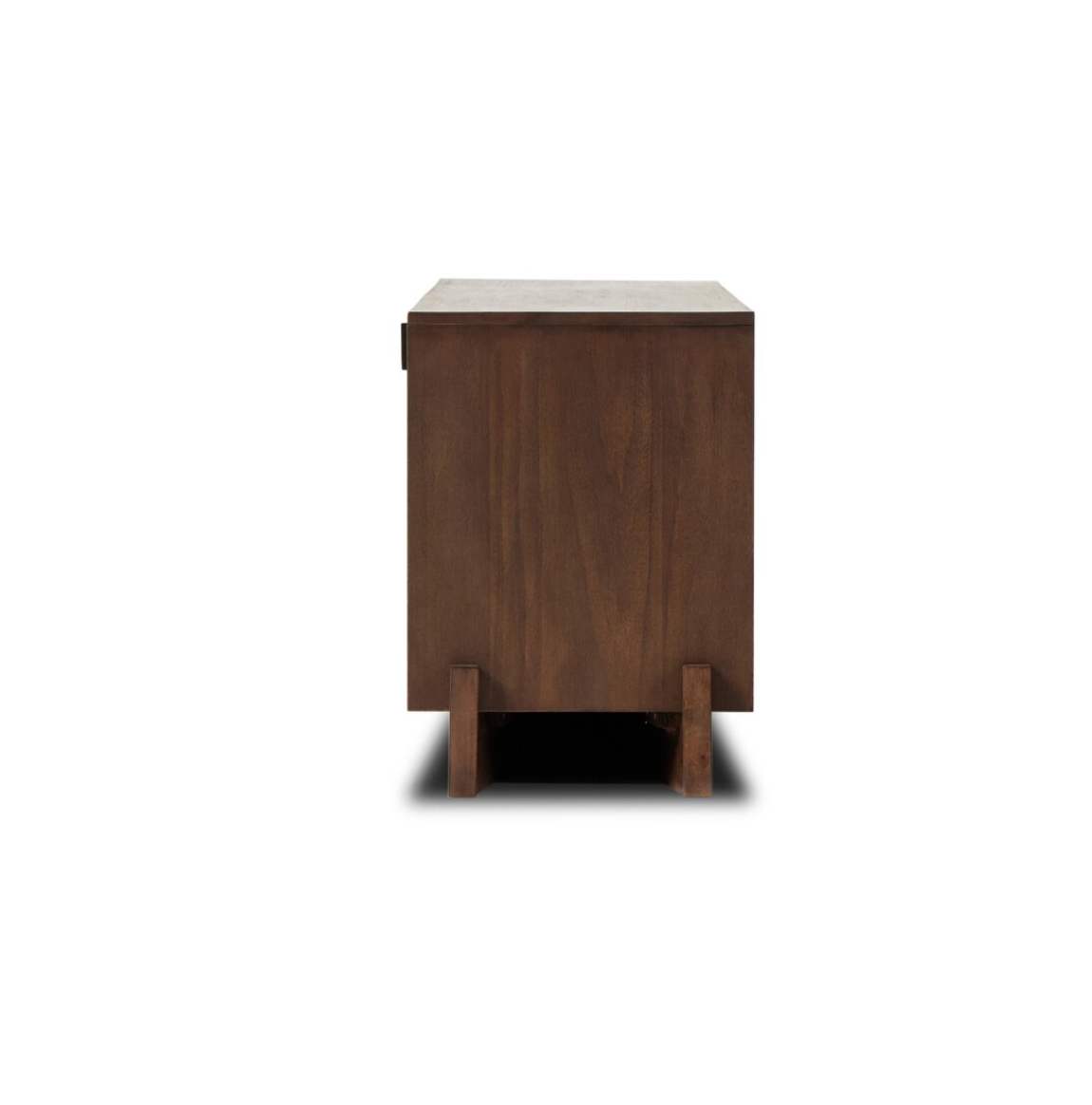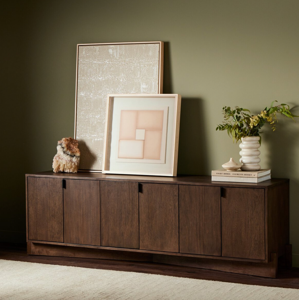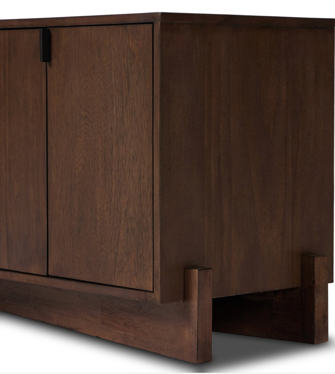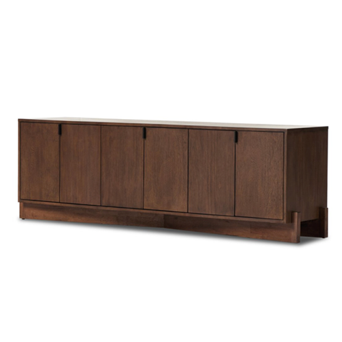 Made from solid parawood and rubberwood veneer, a chestnut finish brings warmth to this transitional media console, with a spacious interior and cradled X base. Rear cutouts for cord management.
