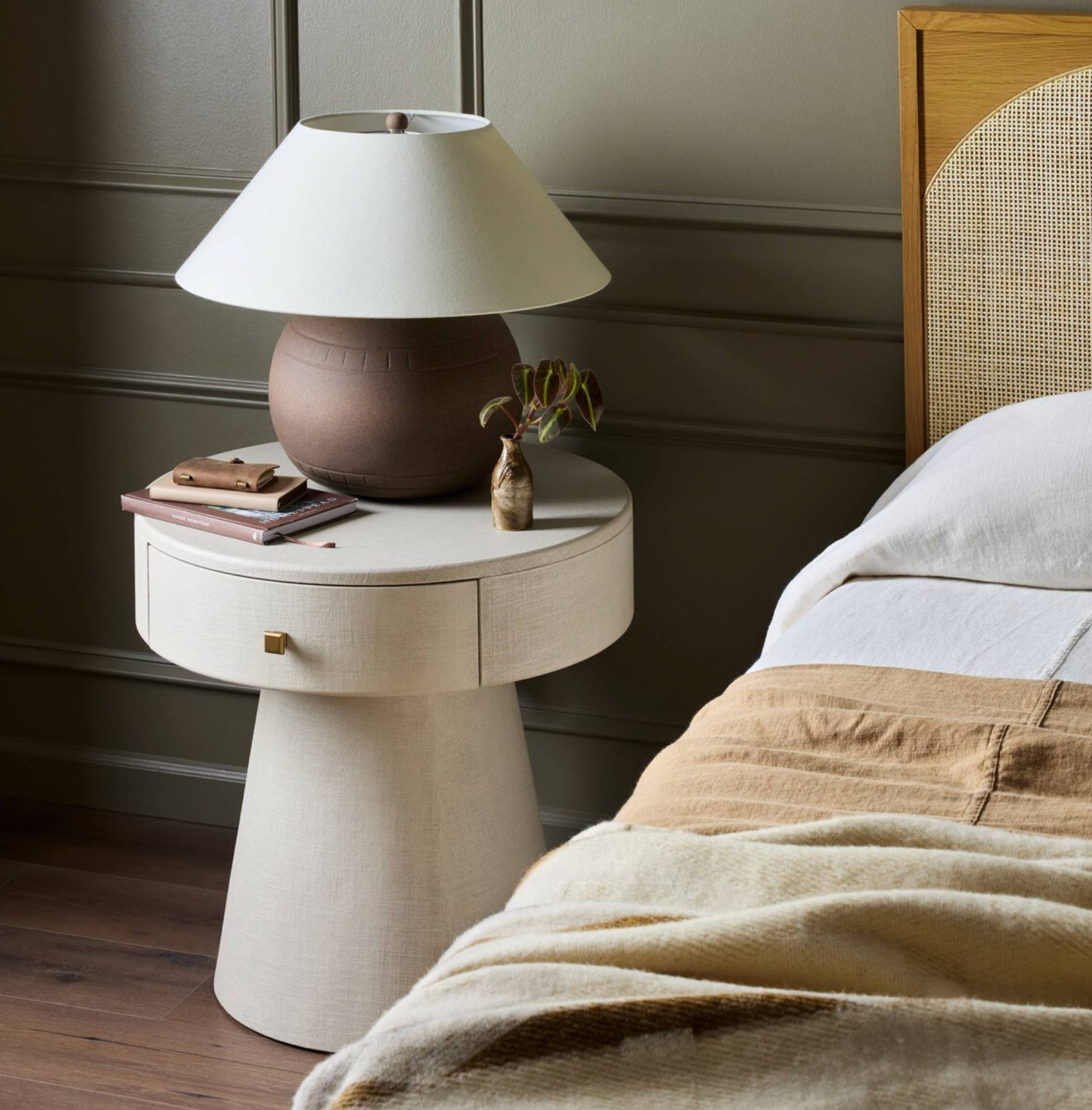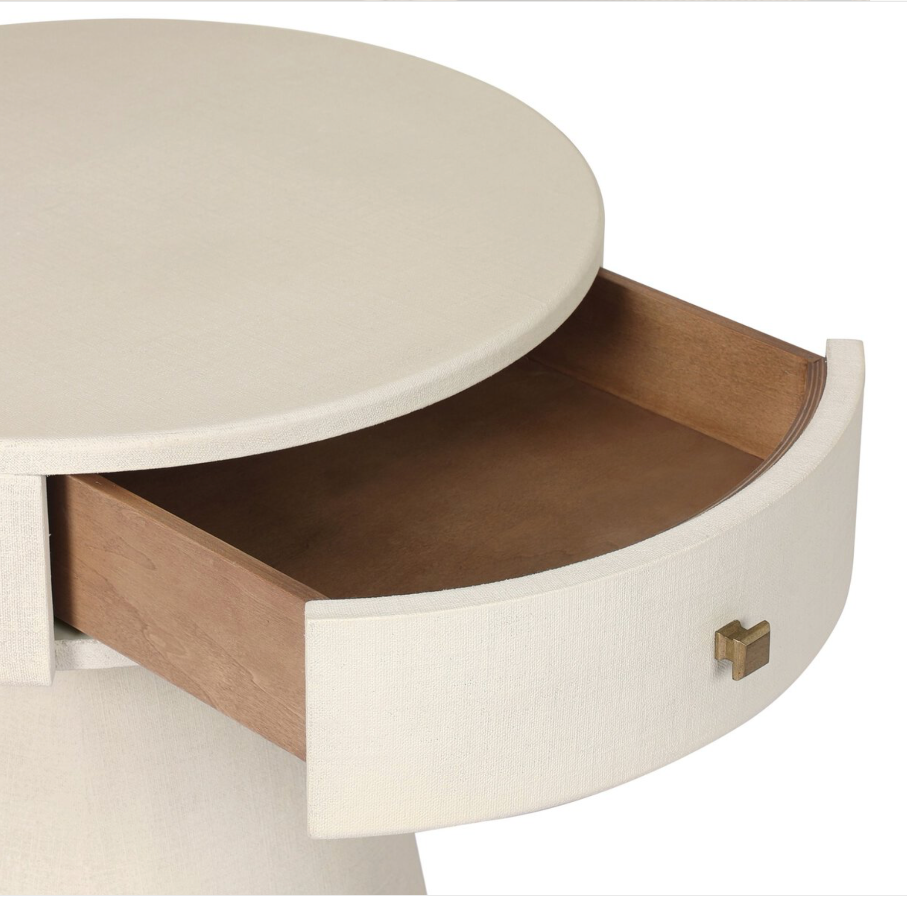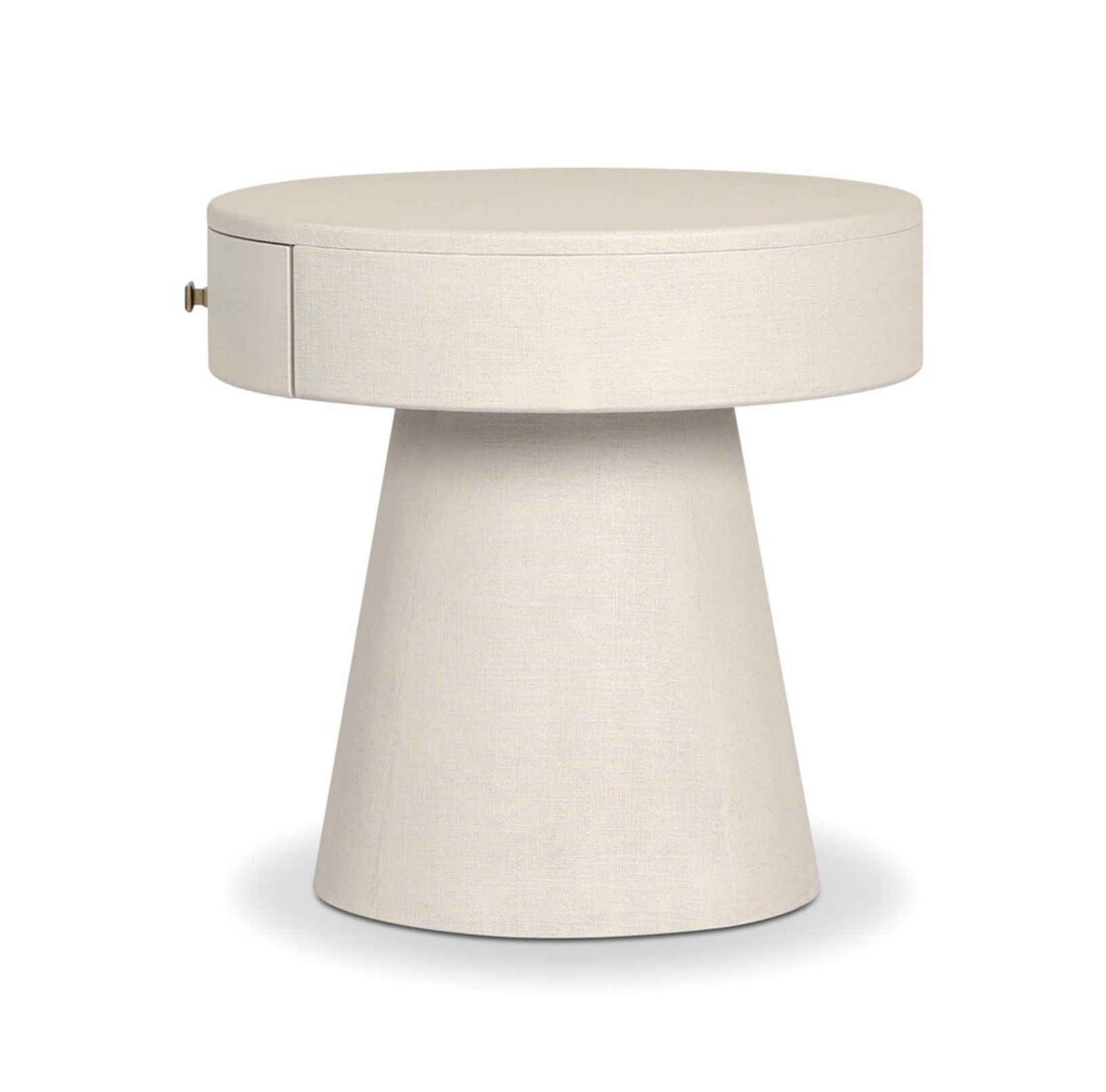 Wrapped in ivory painted linen, a rounded nightstand features a single drawer and tapered pedestal base, bringing crisp texture plus storage to the bedside.