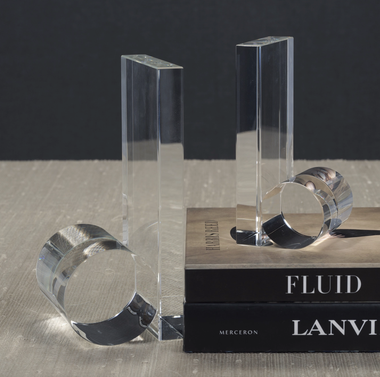 Add a touch of sophistication to any space with these rolled crystal bookends, where artistry meets function. These bookends feature a sleek, rolled design that creates an elegant interplay of light and transparency. Whether displaying a cherished book collection or as a stylish statement piece, they elevate the look of any bookshelf, desk, or home office. Perfect for those who appreciate refined design, these bookends offer secure book support while acting as a striking decor element. Their versatile aesthetic complements a variety of interior styles, from modern minimalism to timeless classics.
