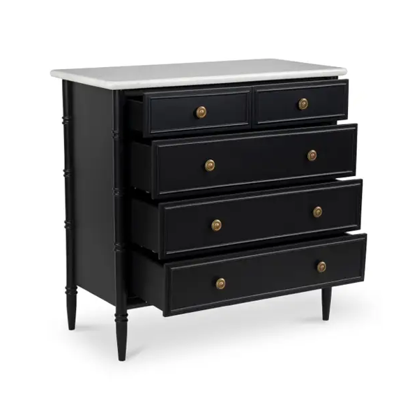 Inspired by the everyday grace of Provence style, the Eleanor 5-drawer chest showcases a classically graceful profile with distinctive turned details. Crafted from Mango wood, this piece is crowned with an expressive marble top and finished with solid antique finished brass finish handles, adding a touch of timeless sophistication and natural beauty.
