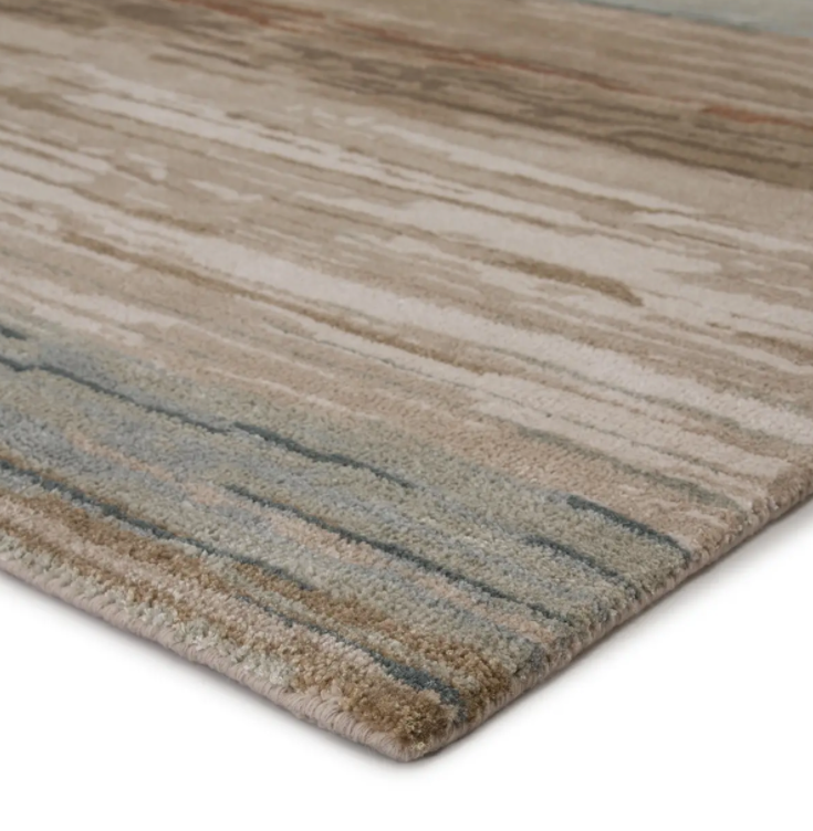 With a whimsical spirit and sophisticated flair, the Genesis collection features an assortment of hand-tufted rugs sure to liven any contemporary home. Painterly perfection describes this beautiful rug. A linear abstract design in earthy, neutral tones of tan, gray, and taupe recall organic textures, highlighted in lustrous viscose and plush wool.