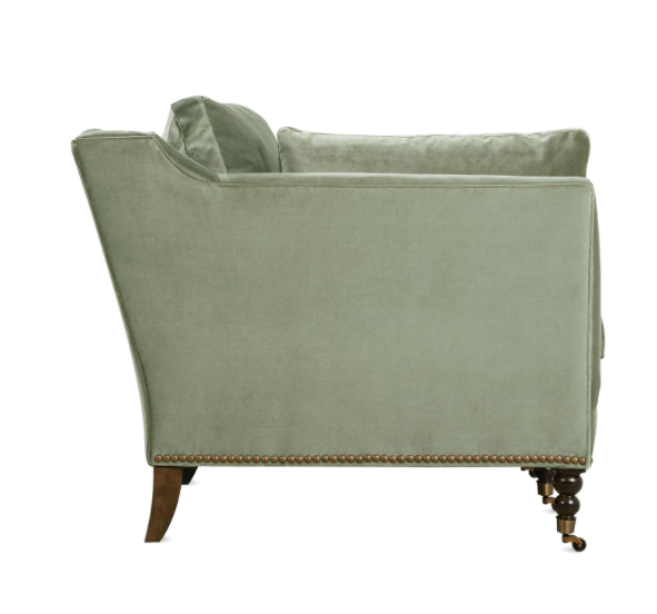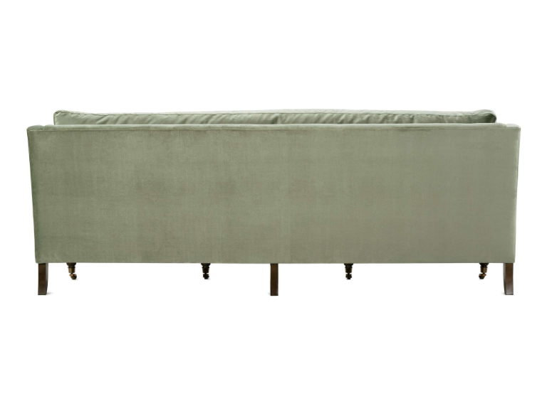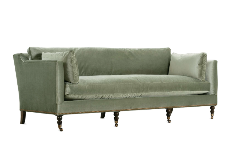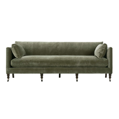The Madeline Sofa is designed for comfort, with transitional, elegant styling. Features include lush green velvet and stylish spool legs with pewter casters.