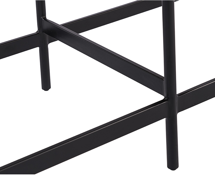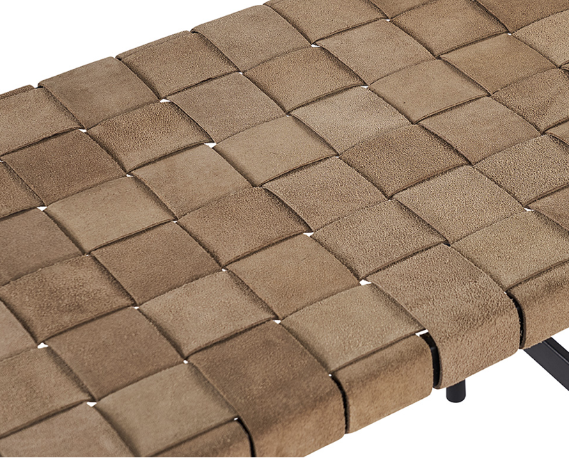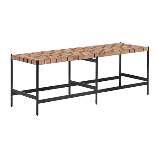 This elevated bench offers ample seating and unique style. Features a weaved seat in light tan leather with a suede-like texture and finished with a black iron base.