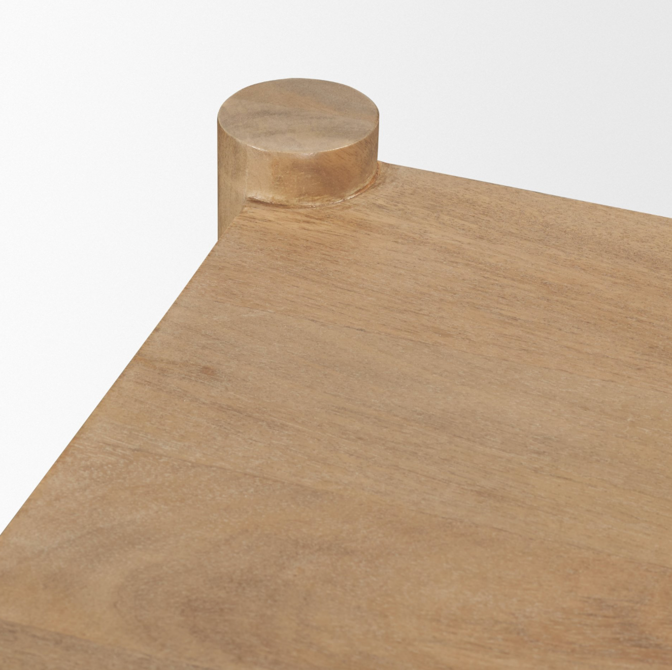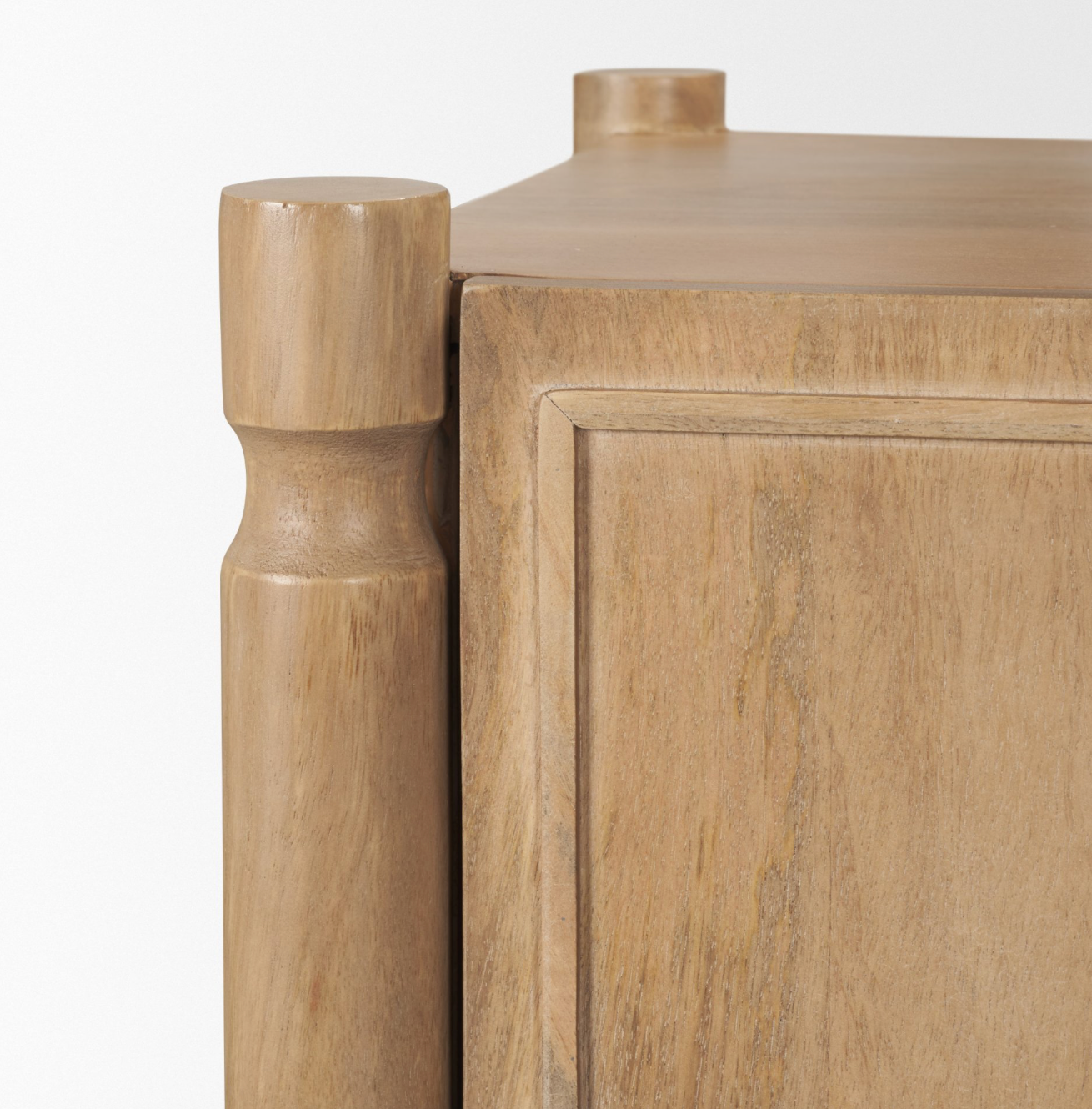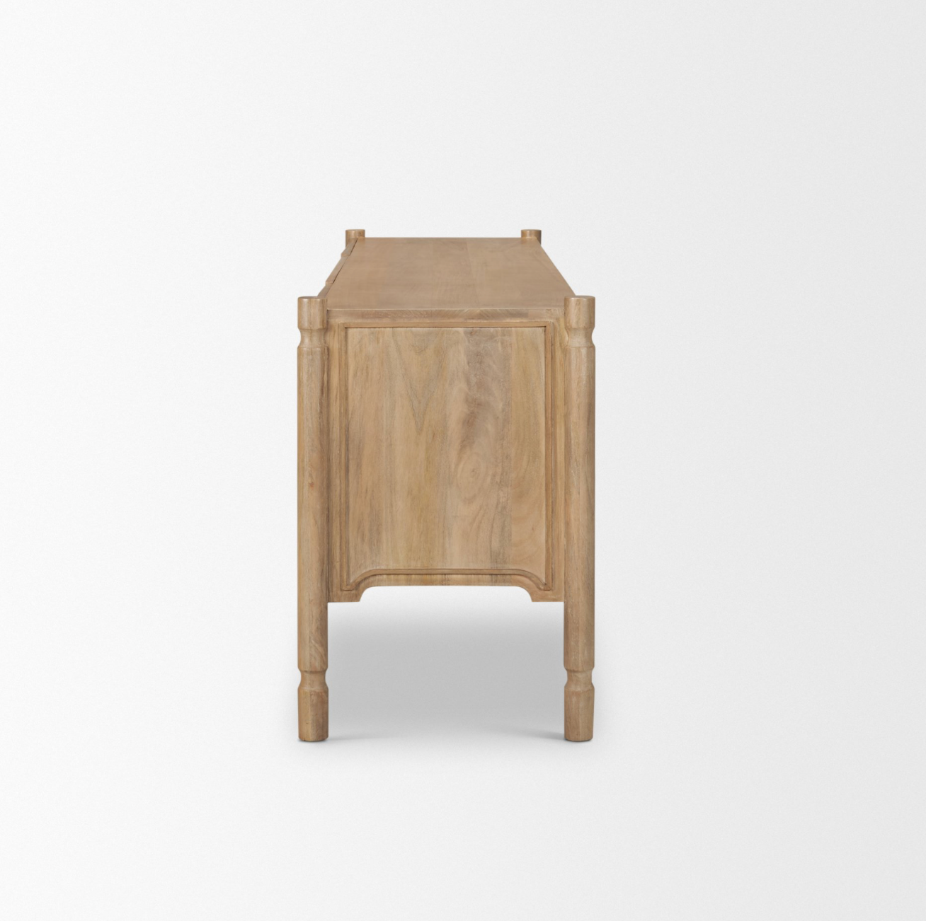 Philippe is a smooth, dark brown solid wood media console with two doors and a central bank of two drawers, adorned with dark aged brass knobs.