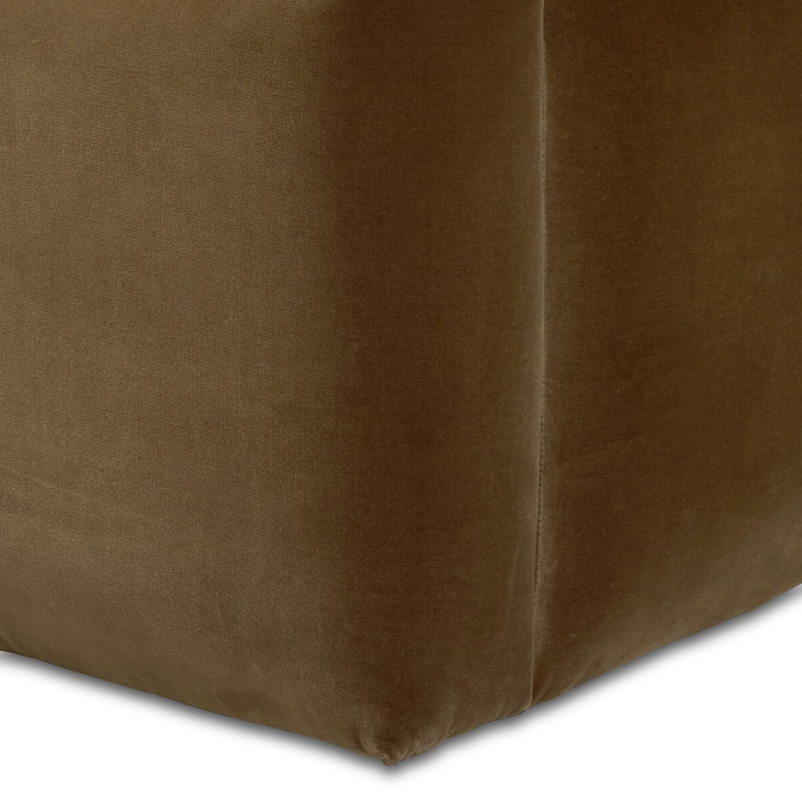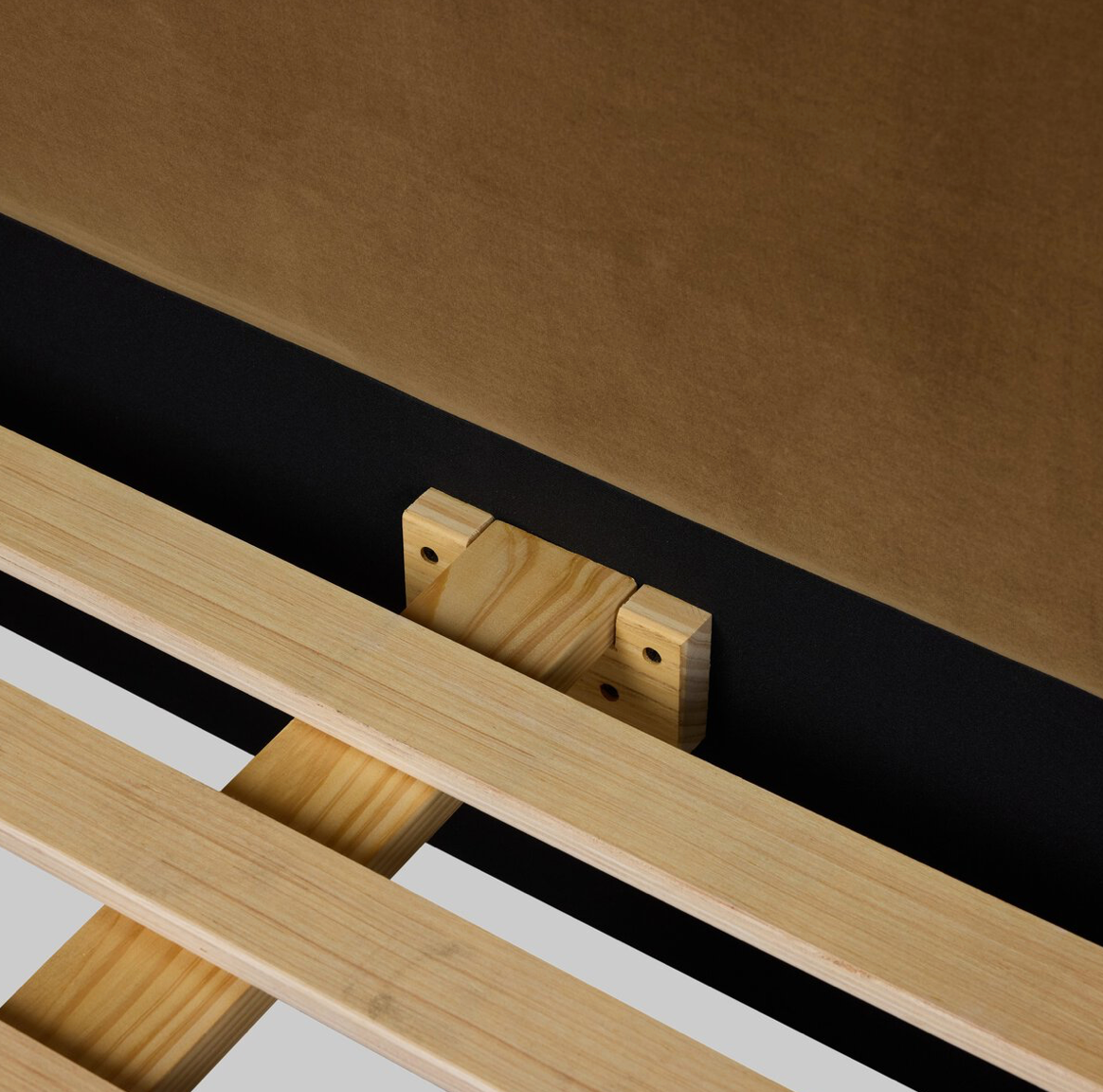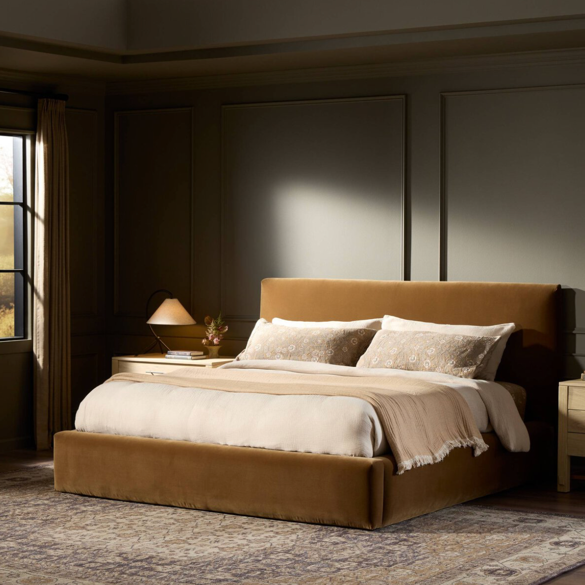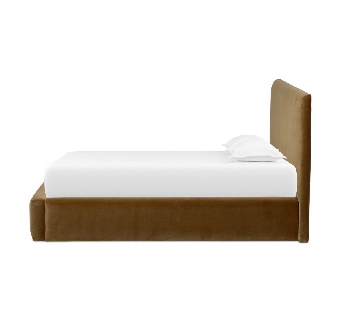 Modern, clean shaping meets inflated comfort with this padded, upholstered bed frame in a luxurious velvet.