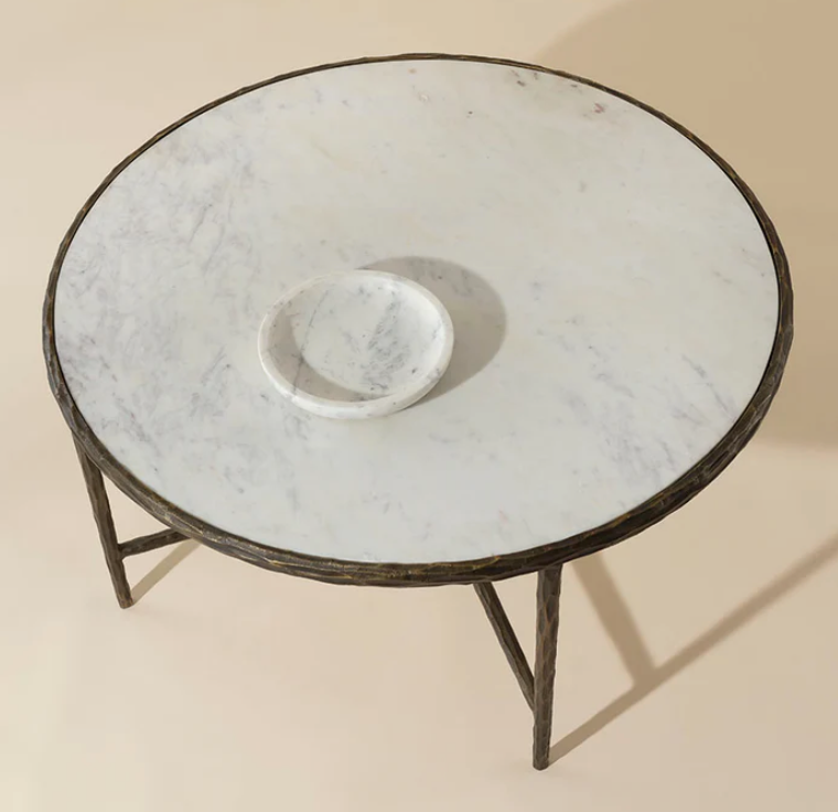 Refined white Banswara marble balanced with the artful look of hand-hammered metal elevates the traditional style of the Raya Coffee Table. Its rounded shape and complimentary tones allow this coffee table to enhance any living space.