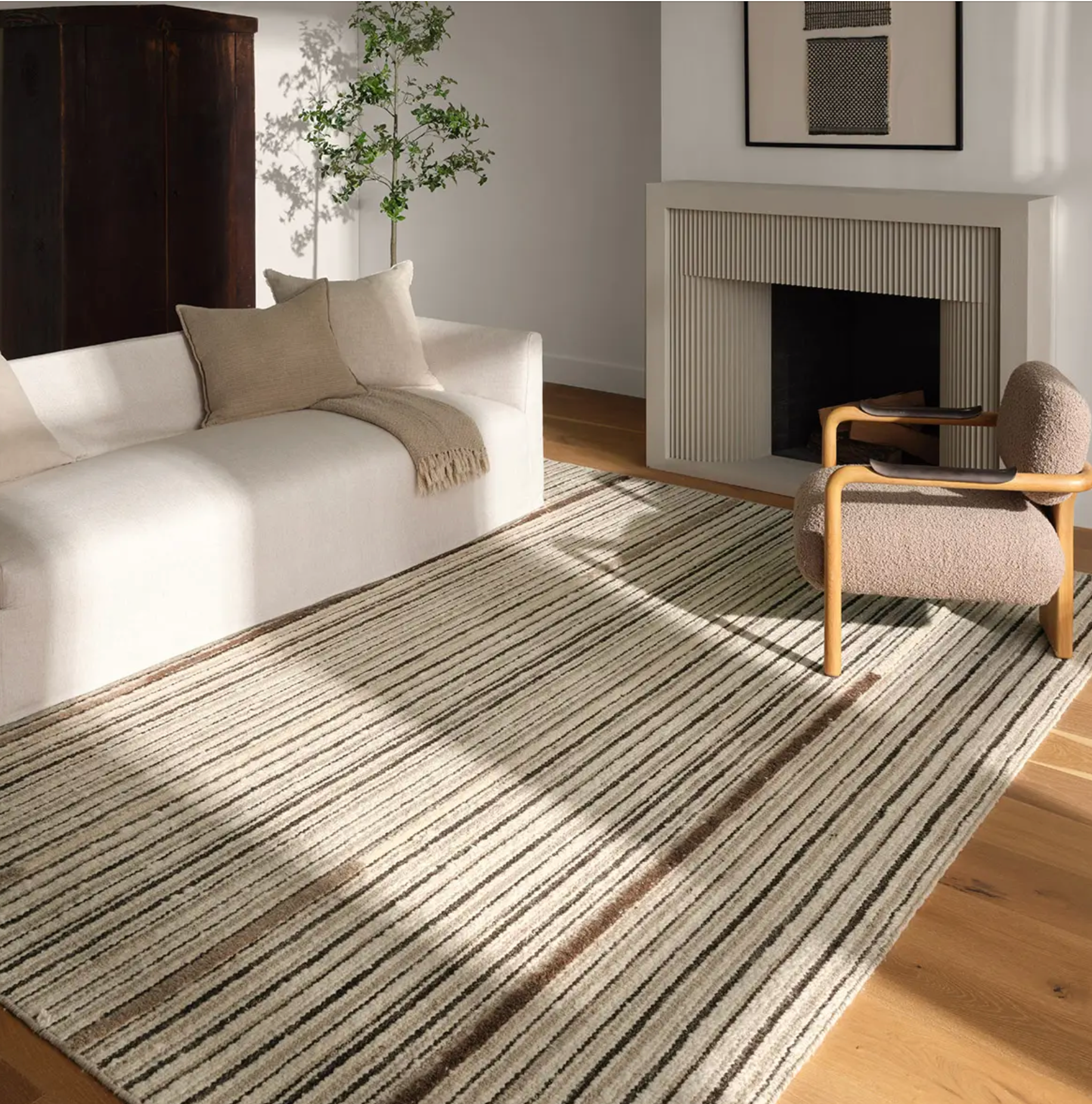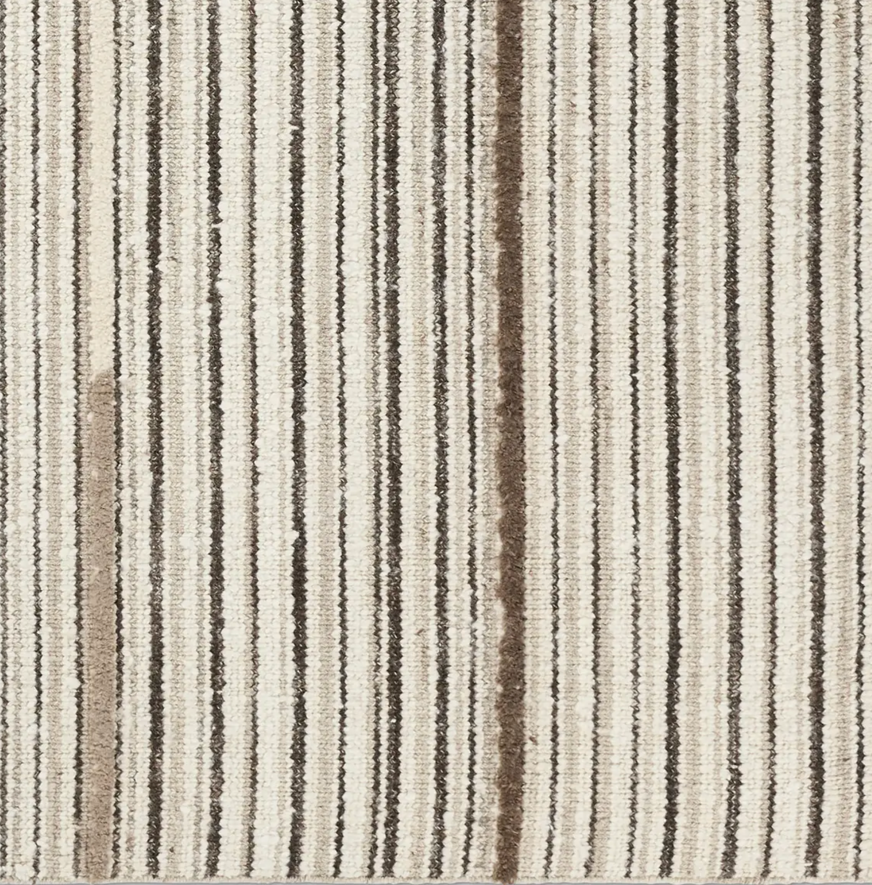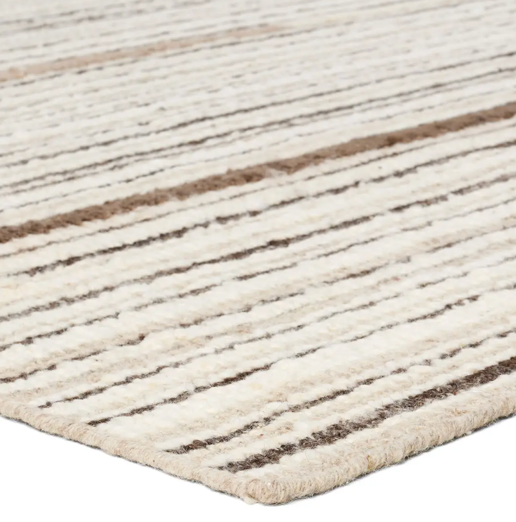 Earthy tan, beige, and brown tones come together in a mesmerizing linear design, infusing the Quaint rug with contemporary elegance. Handwoven from a luxe wool pile, its luminous sheen highlights every intricate detail.