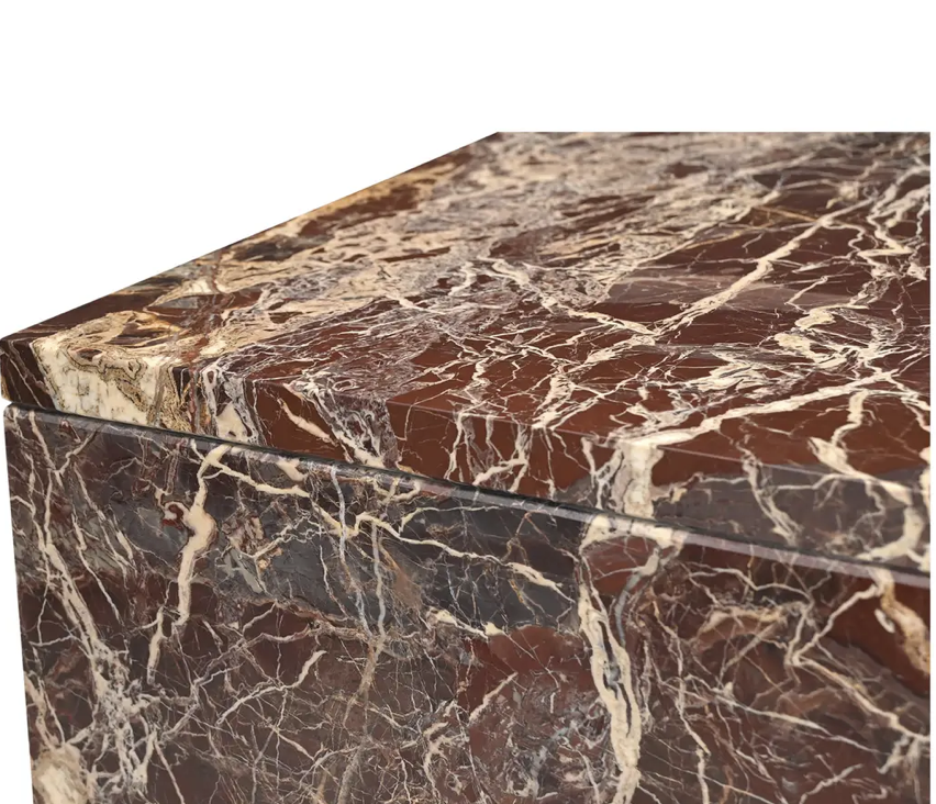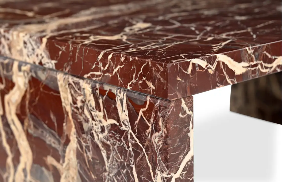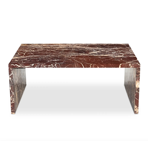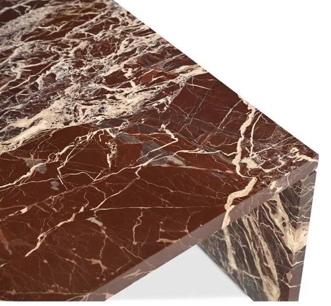 The bold simplicity of the waterfall design speaks volumes with the Rosa coffee table's versatility. Crafted from beautiful Rosso Levanto marble, renowned for its vibrant red hue and striking gold veining, each piece is singularly impactful. This piece commands attention as a statement of natural elegance.
