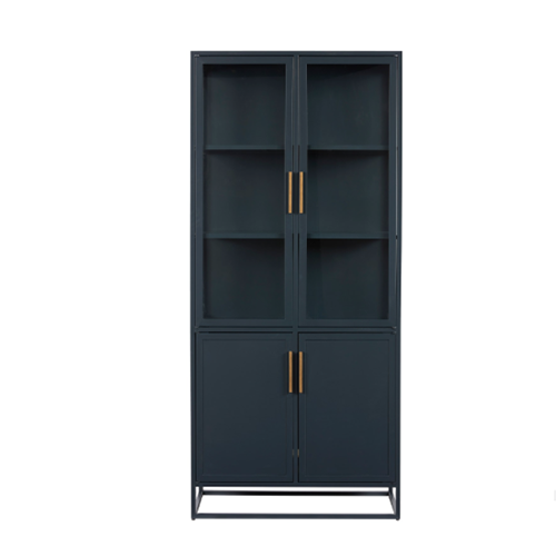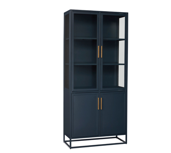 Add vertical storage to living areas with the Sandalwood Tall Metal Kitchen Cabinet, a serenely confident piece in a deep blue finish with clear glass doors and sleek gold bar hardware.