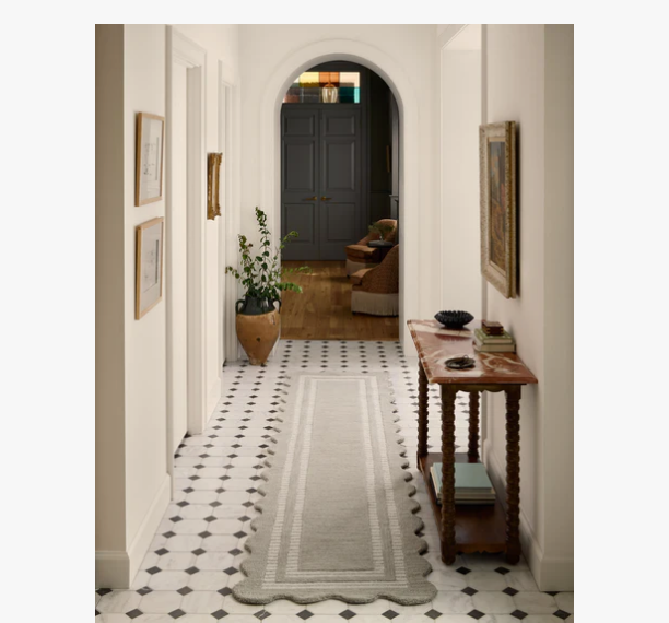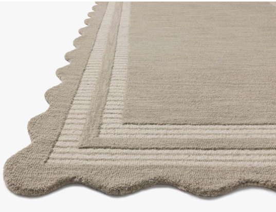 The Scottie Collection from Chris Loves Julia x Loloi is a hand-tufted wool area rug with a playful scalloped edge and lower-pile, striped border for a touch of structure. The rugs overall pile is thick and plush, available in easygoing earth tones and neutral colorways. This collection is hand-tufted of 100% wool in India and Goodweave-certified, ensuring our commitment to ethical production and the support of weavers communities. Some shedding is expected and a natural characteristic of wool rugs; we recommend vacuuming frequently without a beater bar.
