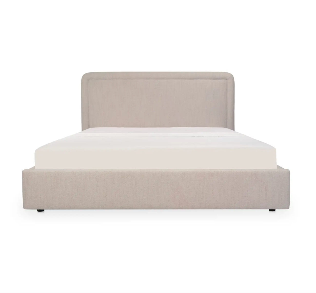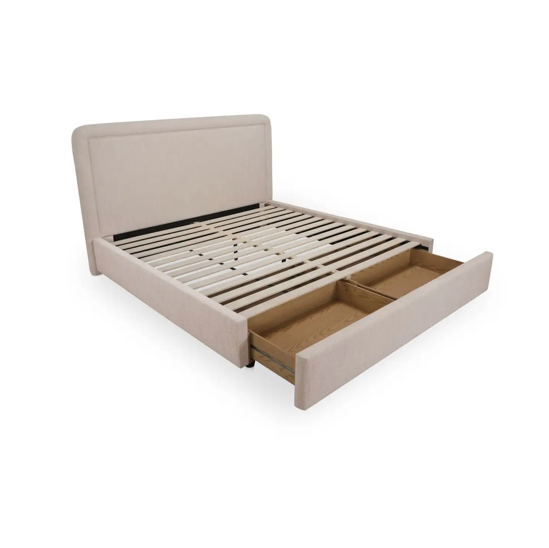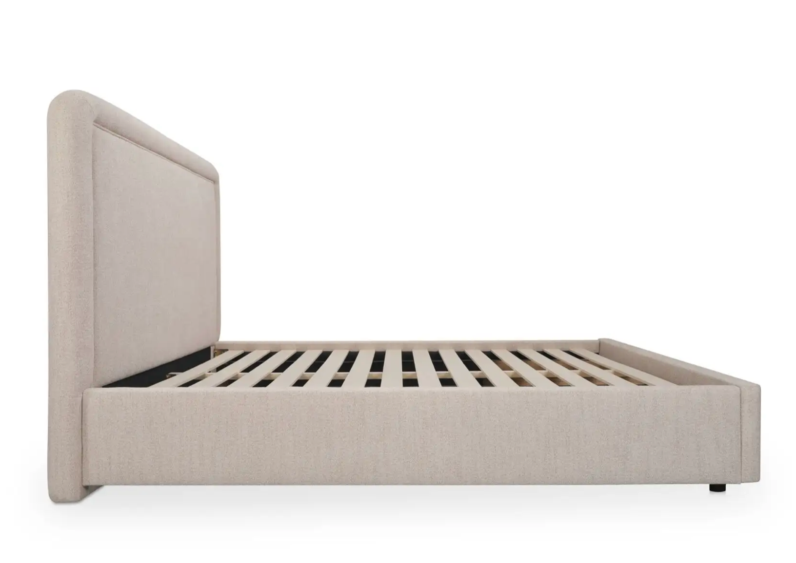 A bed with a hidden trick. The Simone Bed features a rounded silhouette with piped detailing, upholstered in flecked beige polyester for softness and durability. The full footboard pulls forward to reveal storage divided into two panels, keeping essentials organized without clutter. Built with engineered wood, solid wood, and MDF, Simone turns practical storage into part of the design story.