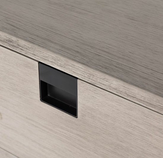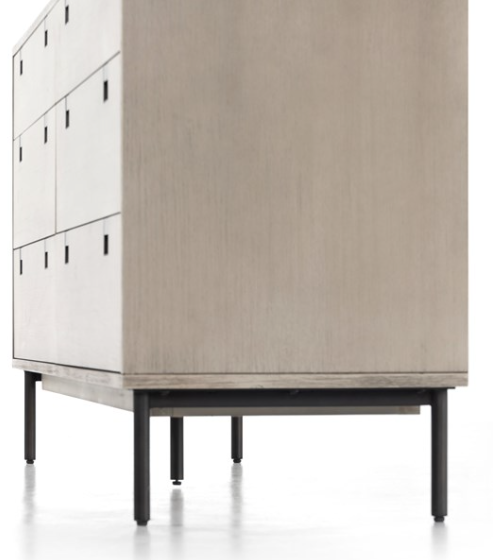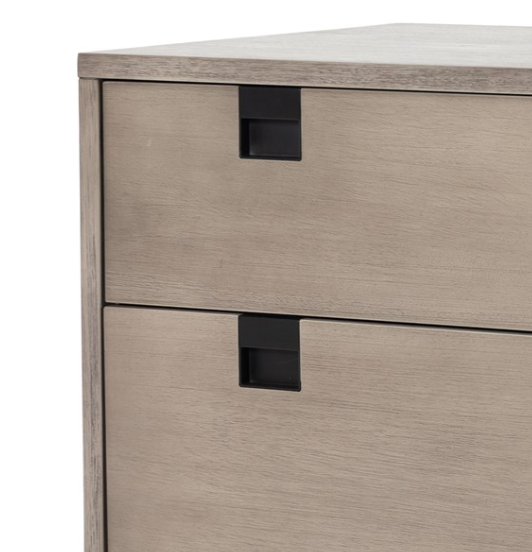 Clean, streamlined shaping brings a structured-yet-light look to bedroom storage, with six spacious drawers of grey-washed acacia veneer perched atop iron legs finished in an antique bronze.