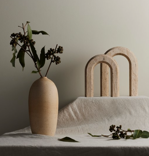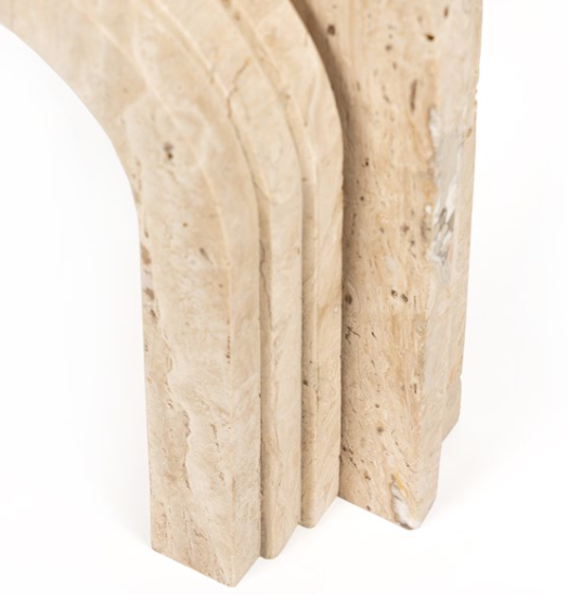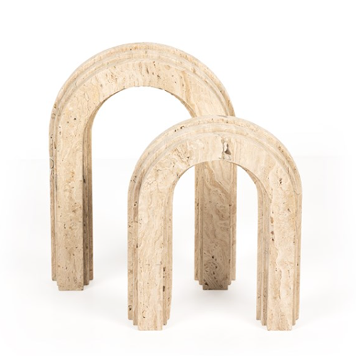 Understated sculptural forms. Solid travertine is shaped to form two minimal arches. Varied heights make for a wider variety of styling options, whether placing together or apart.
