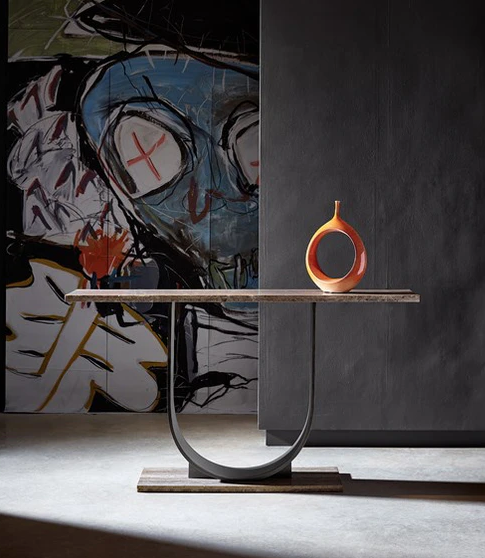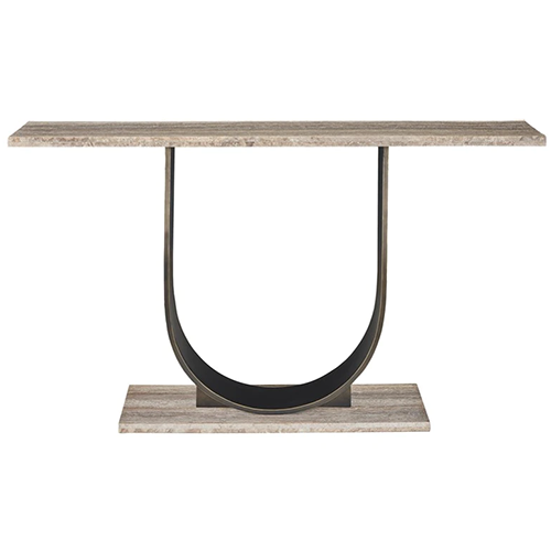 Boasting an artful connection of curves and angles, the Equilibrium Console finds ideal aesthetic balance with a bronzed, bold U-shaped body offset by a top and base featuring a modern, grainy finish.