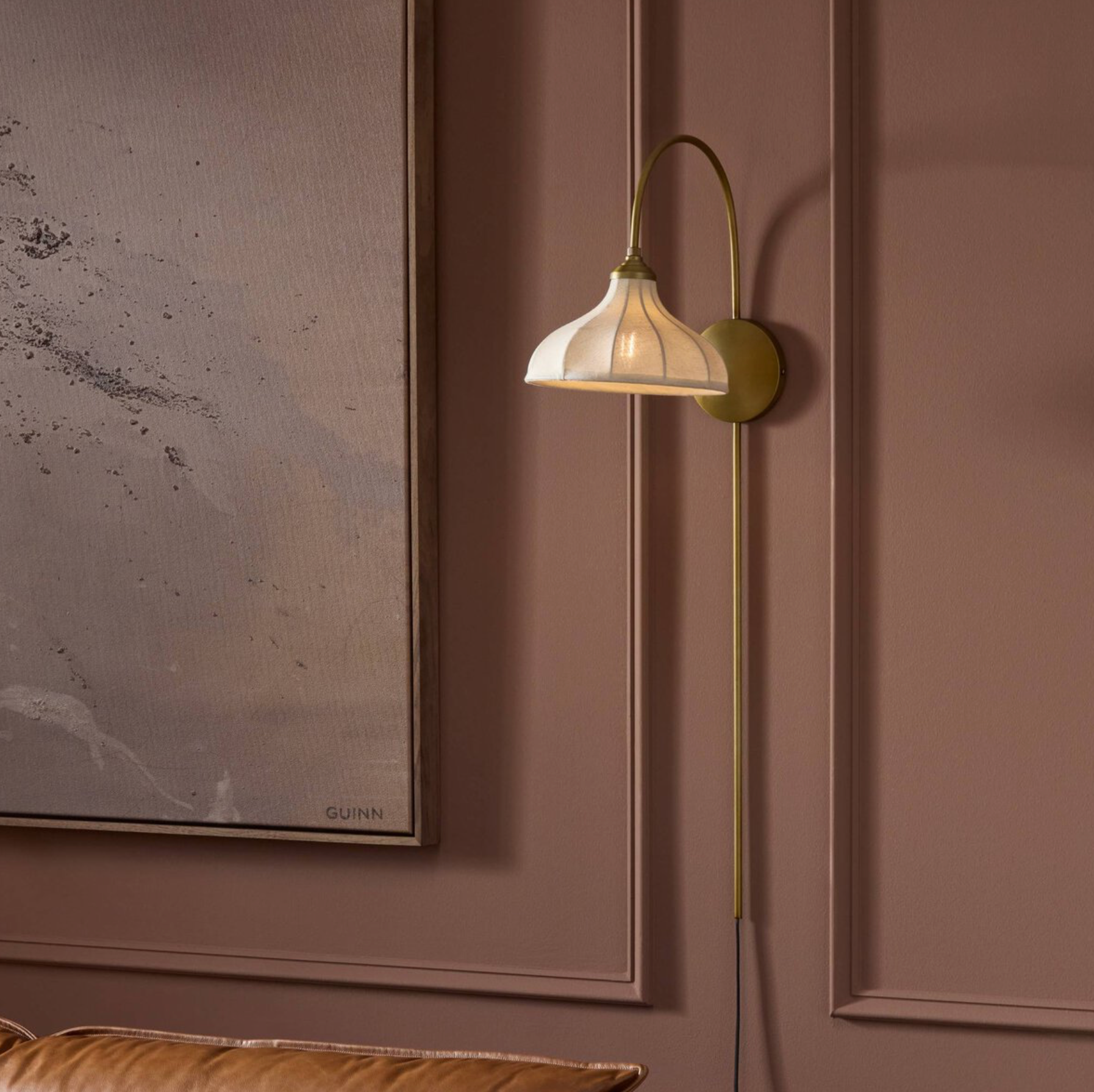 Slim and curved, a swan-neck arm supports a bell-shaped linen shade with brass boning, updating a traditional lighting look. This plug-in sconce design brings warm illumination to any space while discreet cord management keeps the look polished. Ideal for crafting warm, inviting reading corners or bedside ambiance.