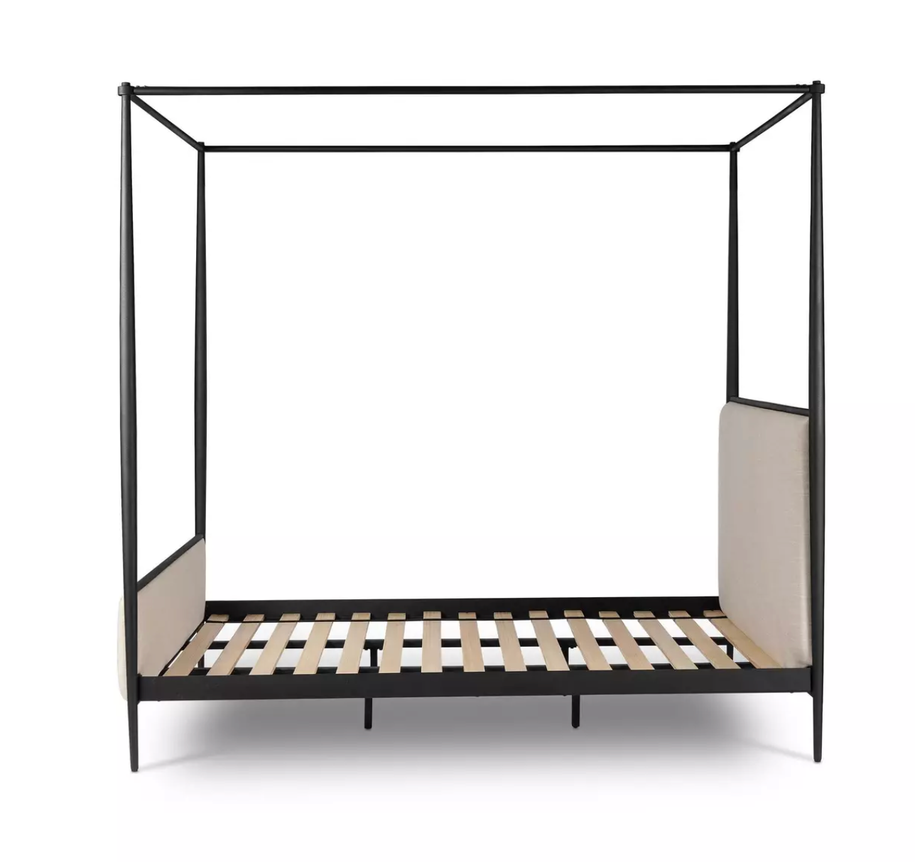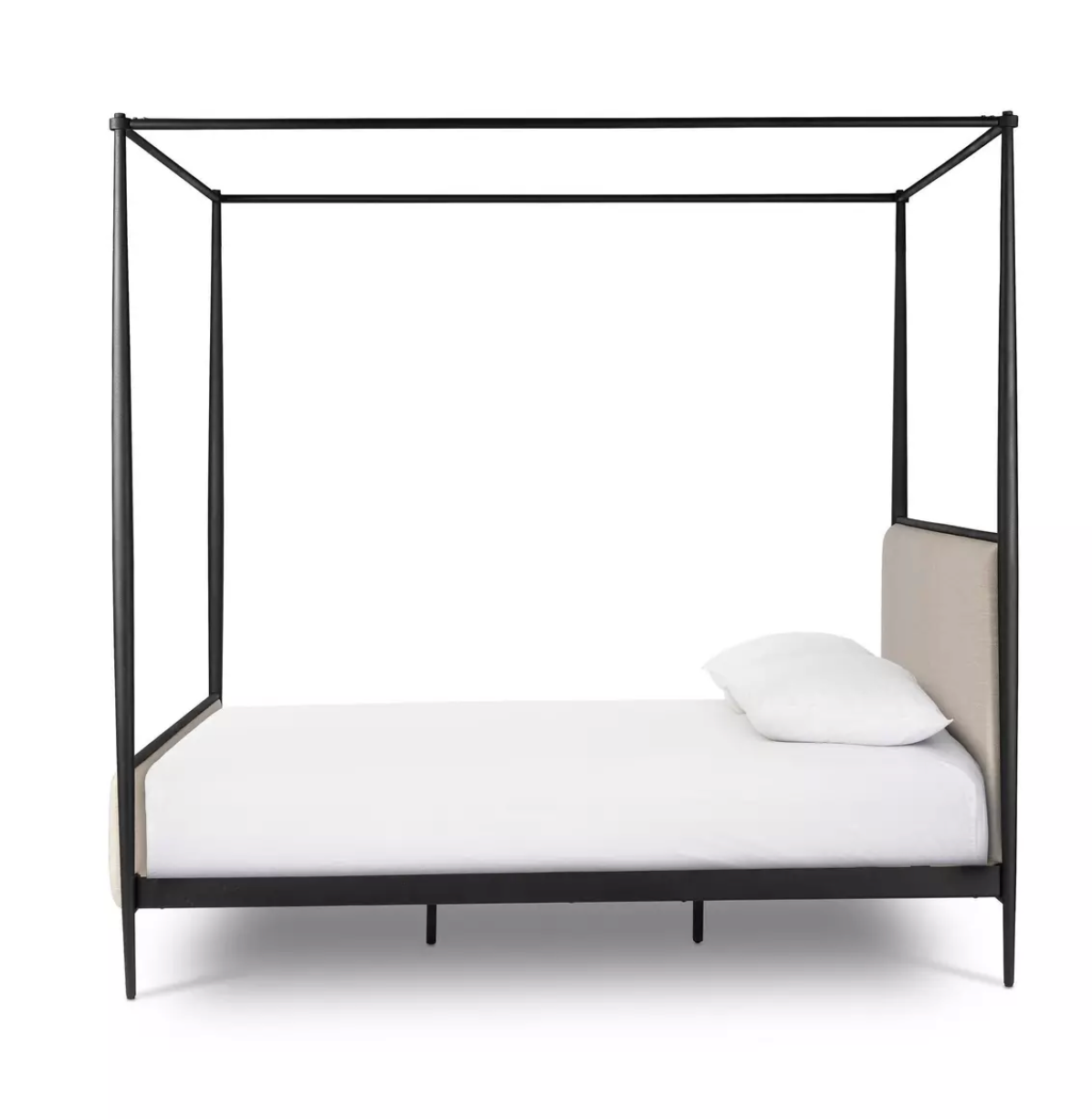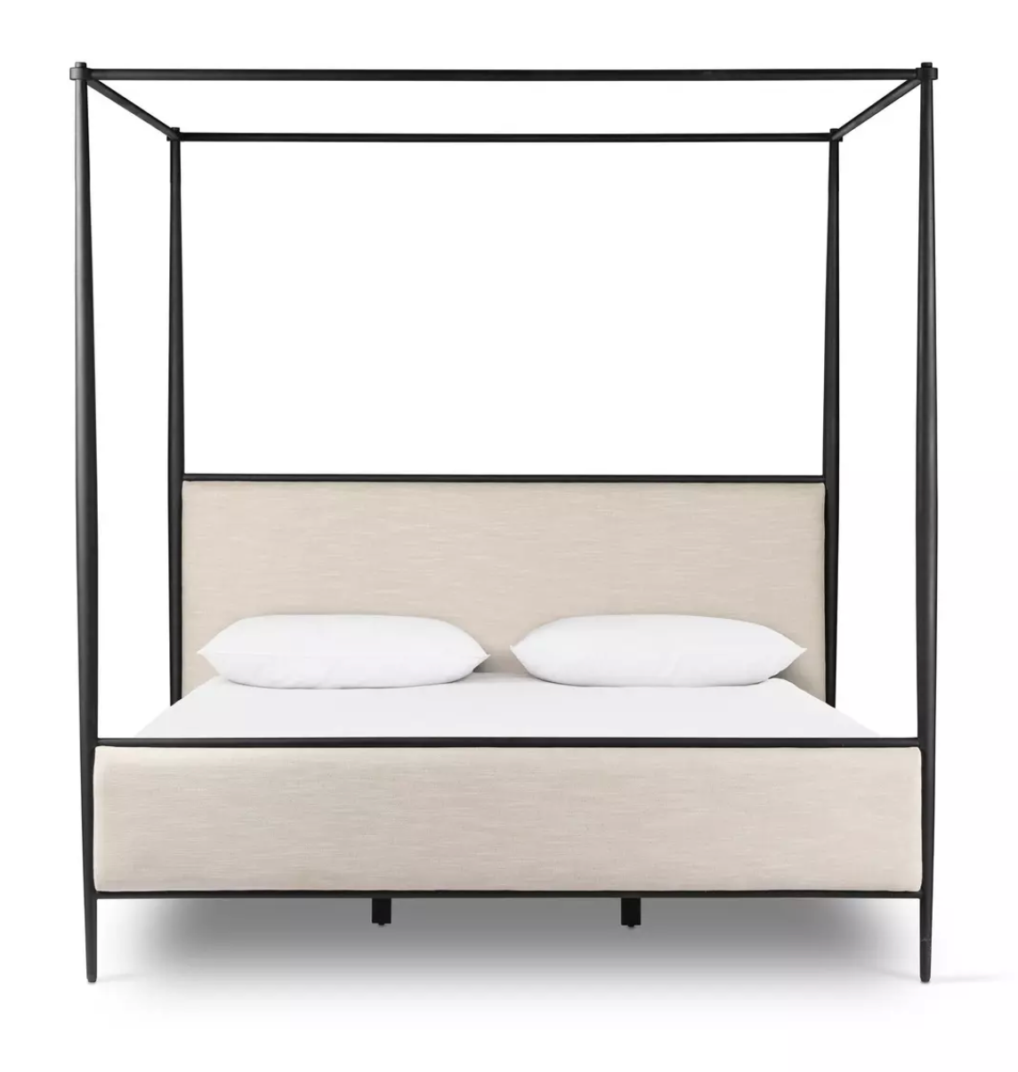 Streamlined and refined. Tapered at the top and bottom, this textured black iron canopy bed fashions a comfortable headboard upholstered in a classic cream hue for contrast.