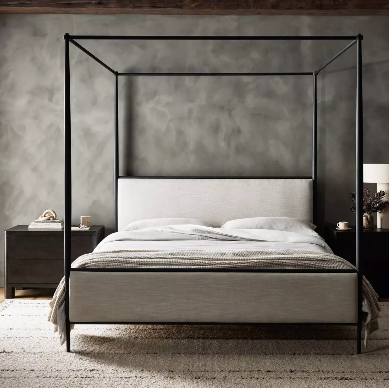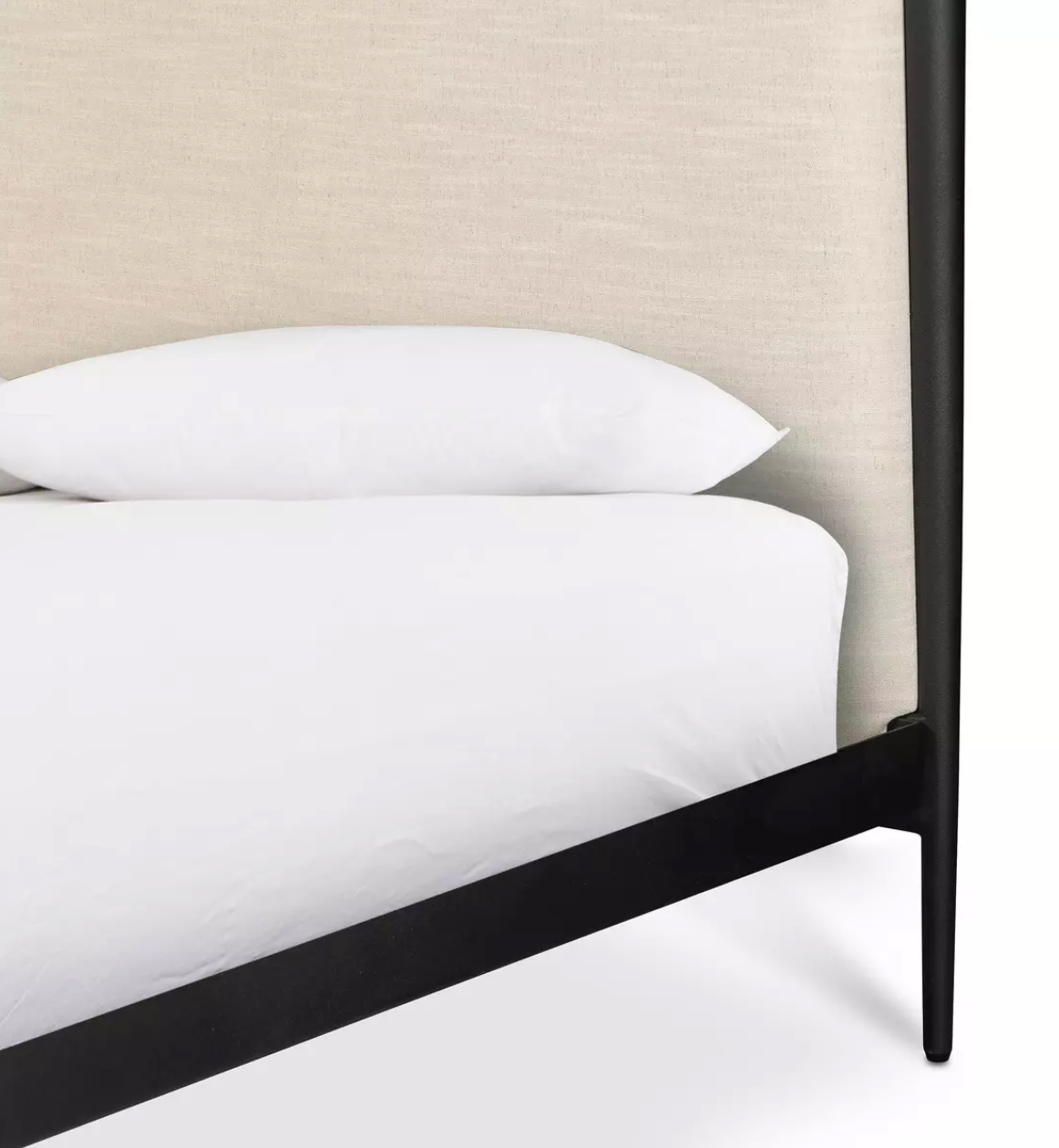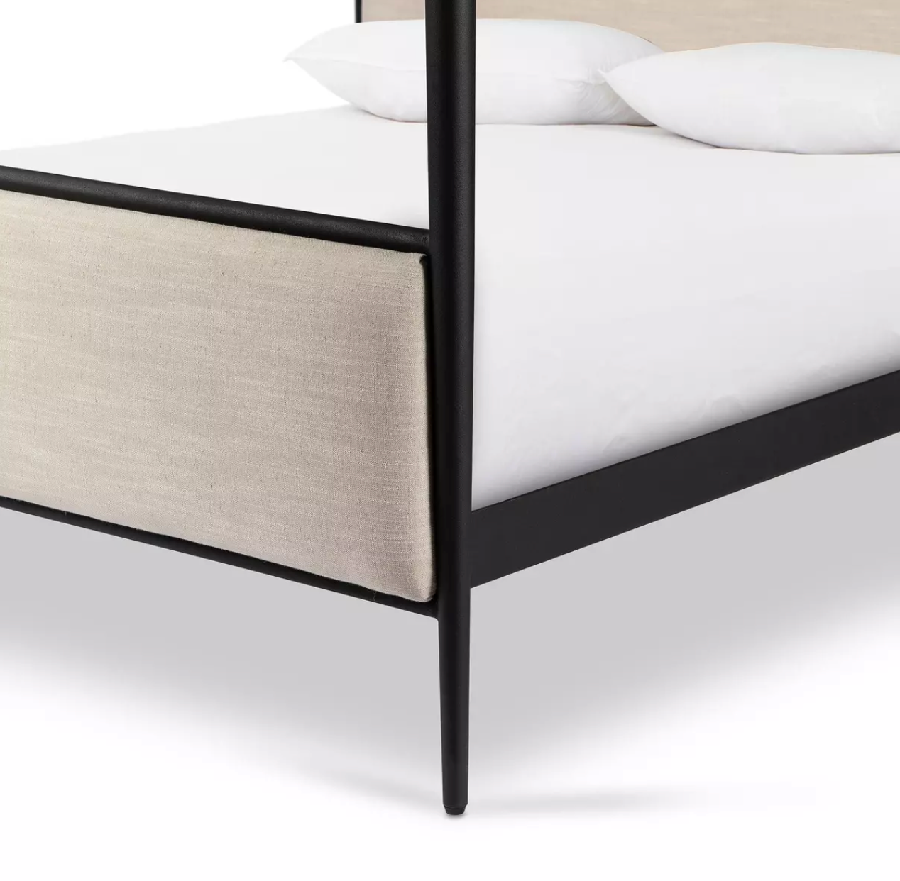 Streamlined and refined. Tapered at the top and bottom, this textured black iron canopy bed fashions a comfortable headboard upholstered in a classic cream hue for contrast.