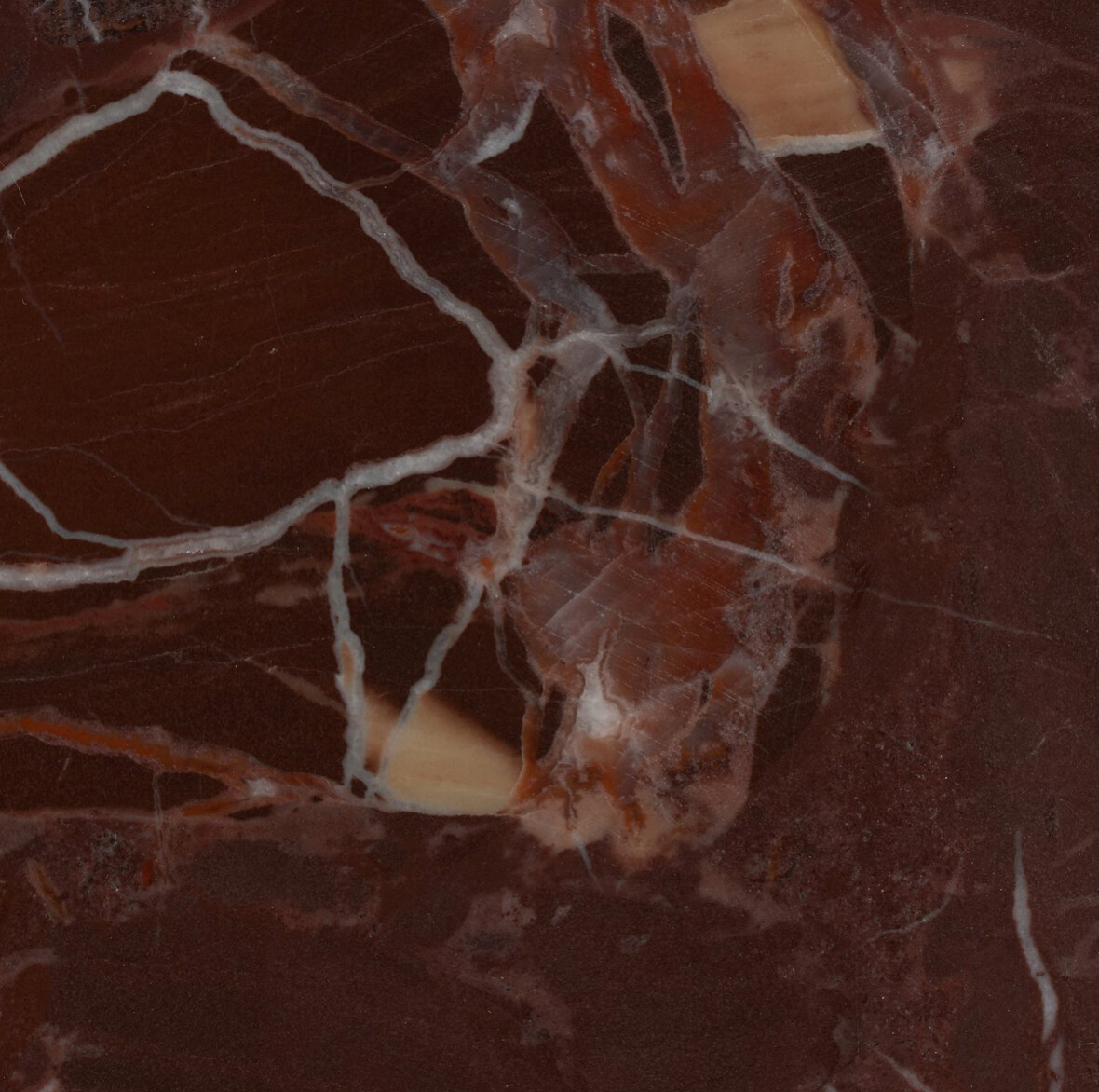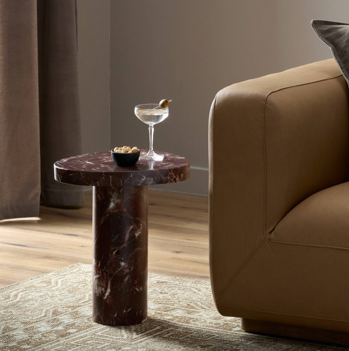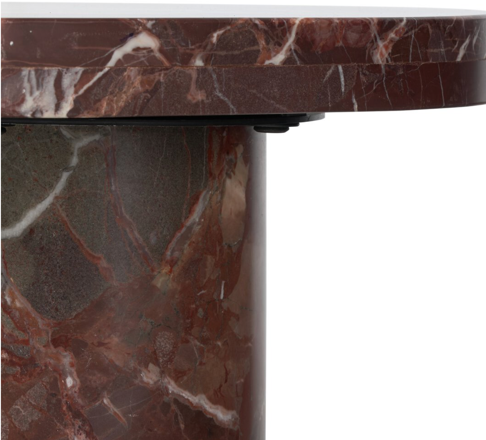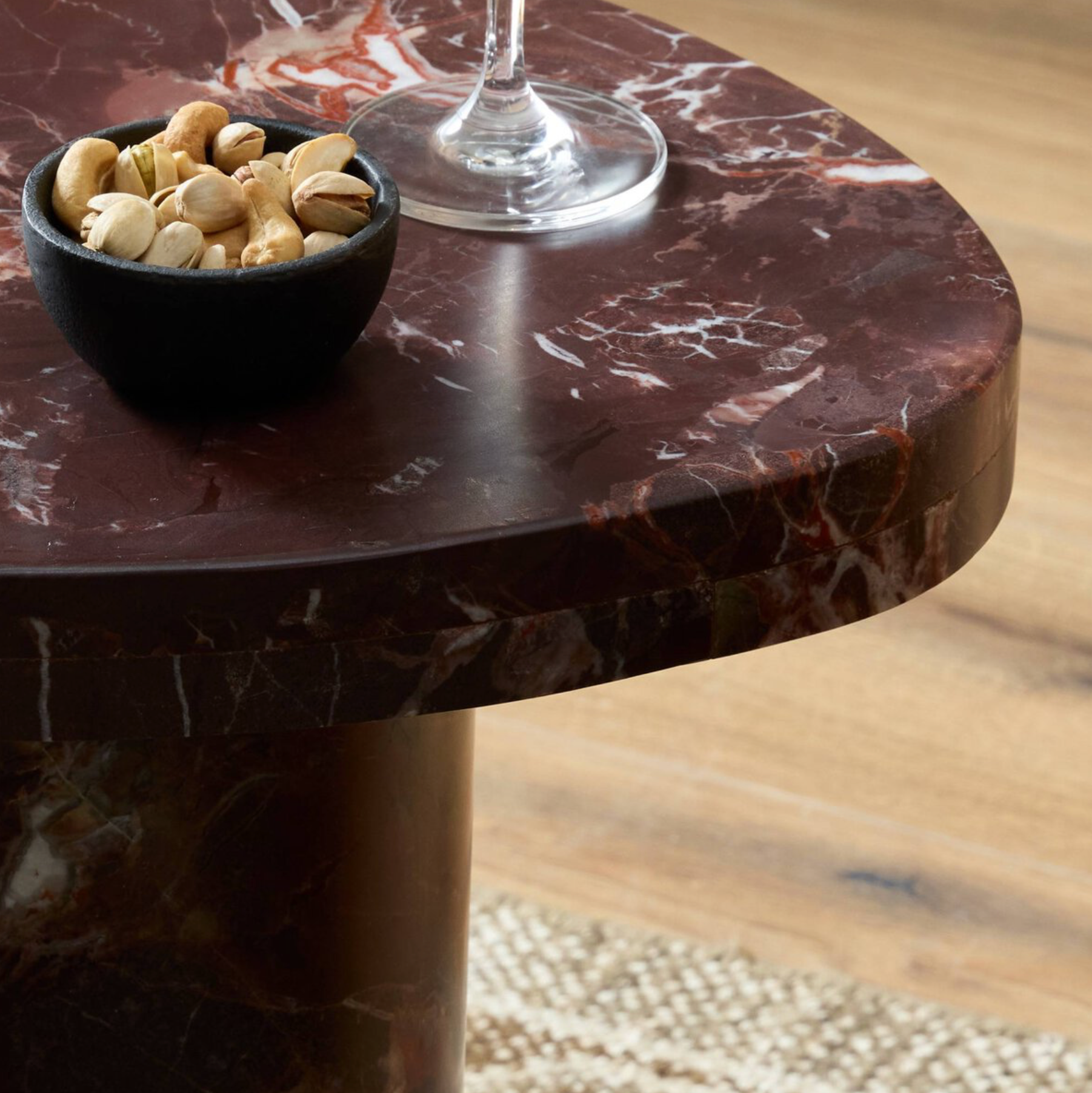 Shape and material share the spotlight in this pedestal-style end table of solid marble finished in a rich merlot with natural veining.