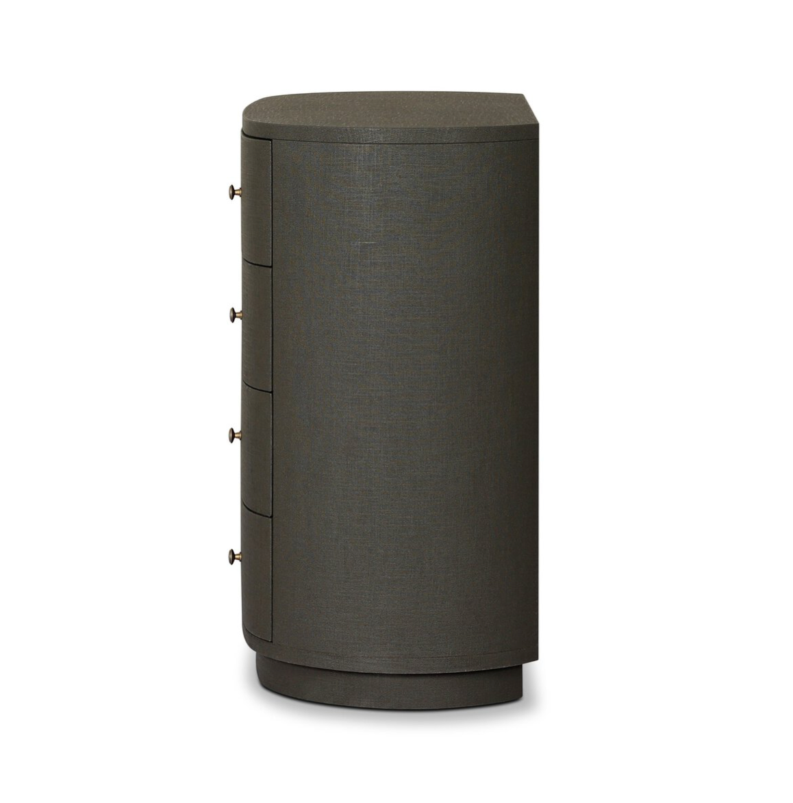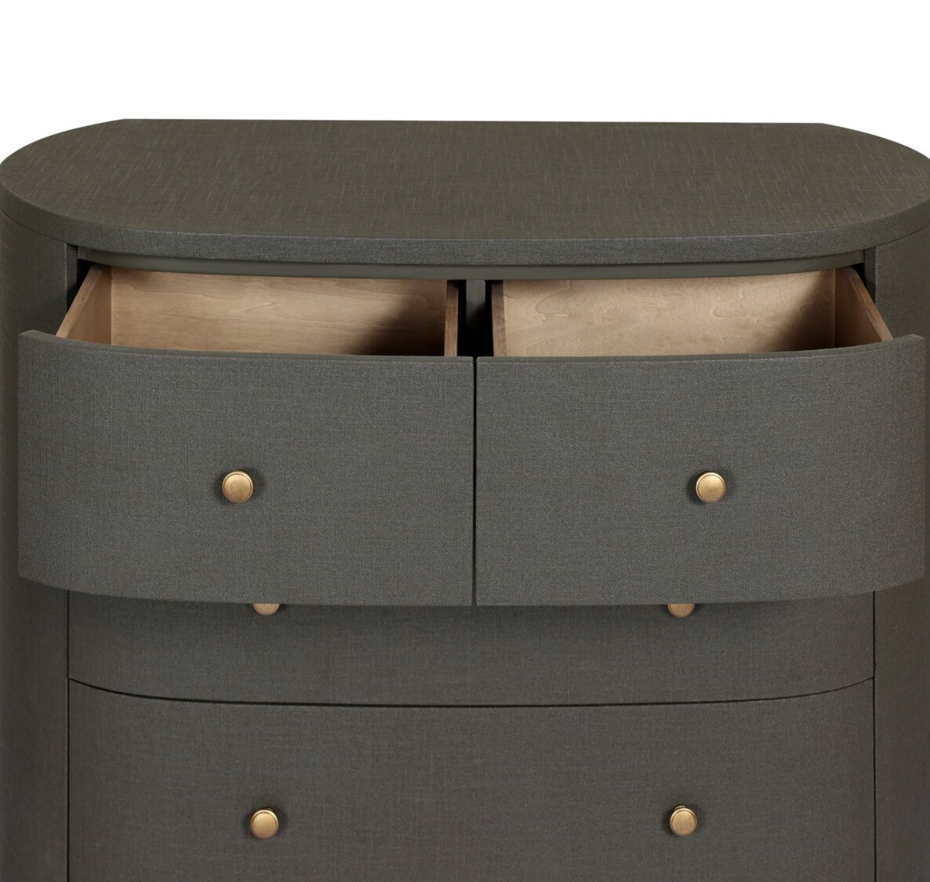 Uniquely made from dark green-painted linen, a beautifully curved drawer chest gives shape to generous storage for clothes, accessories and more.