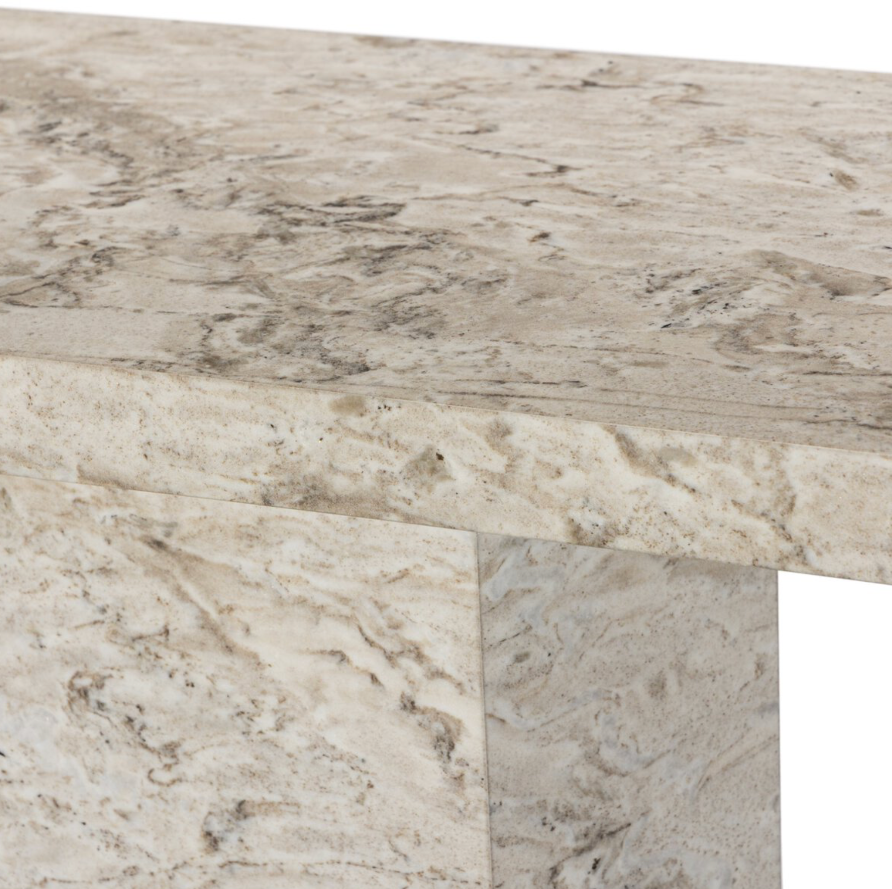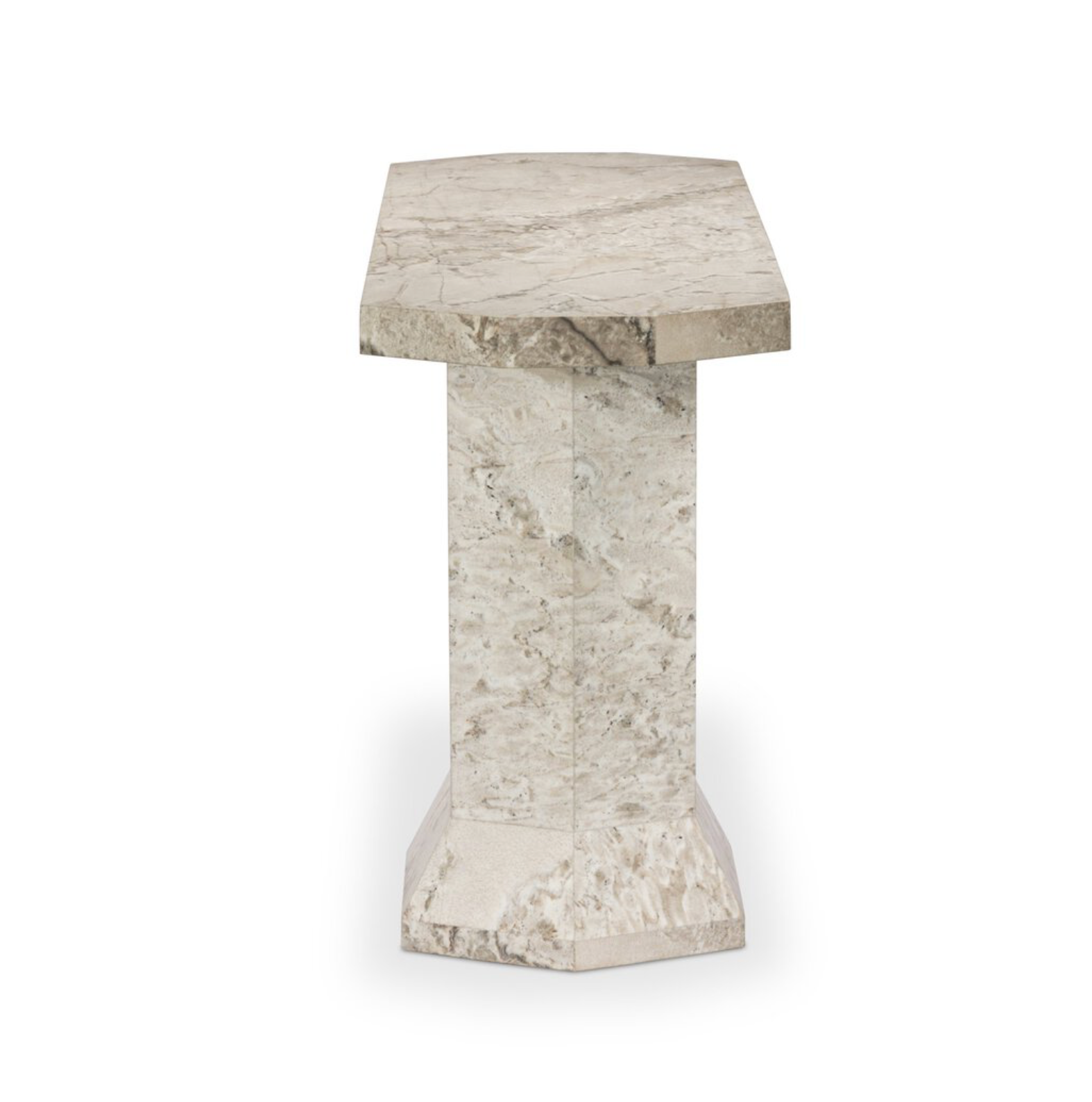 Monolithic and bold, this pedestal-style console table is constructed of precisely cut, creamy brown marble. Angular edges and cut corners bring smooth surface transitions for subtle visual and geometric intrigue.
