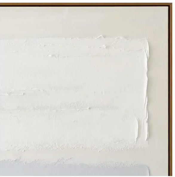 Minimal with movement. Ayre captures the quiet rhythm of a space in transition. Simple linear brushstrokes stretch across the canvas in warm beiges and whites, softened by cool notes of blue that bring just enough contrast. The palette is calm; the texture, deliberate. Framed in a clean, modern profile, it adds warmth and flow to a room without ever demanding attention. It’s minimalism, made to breathe.