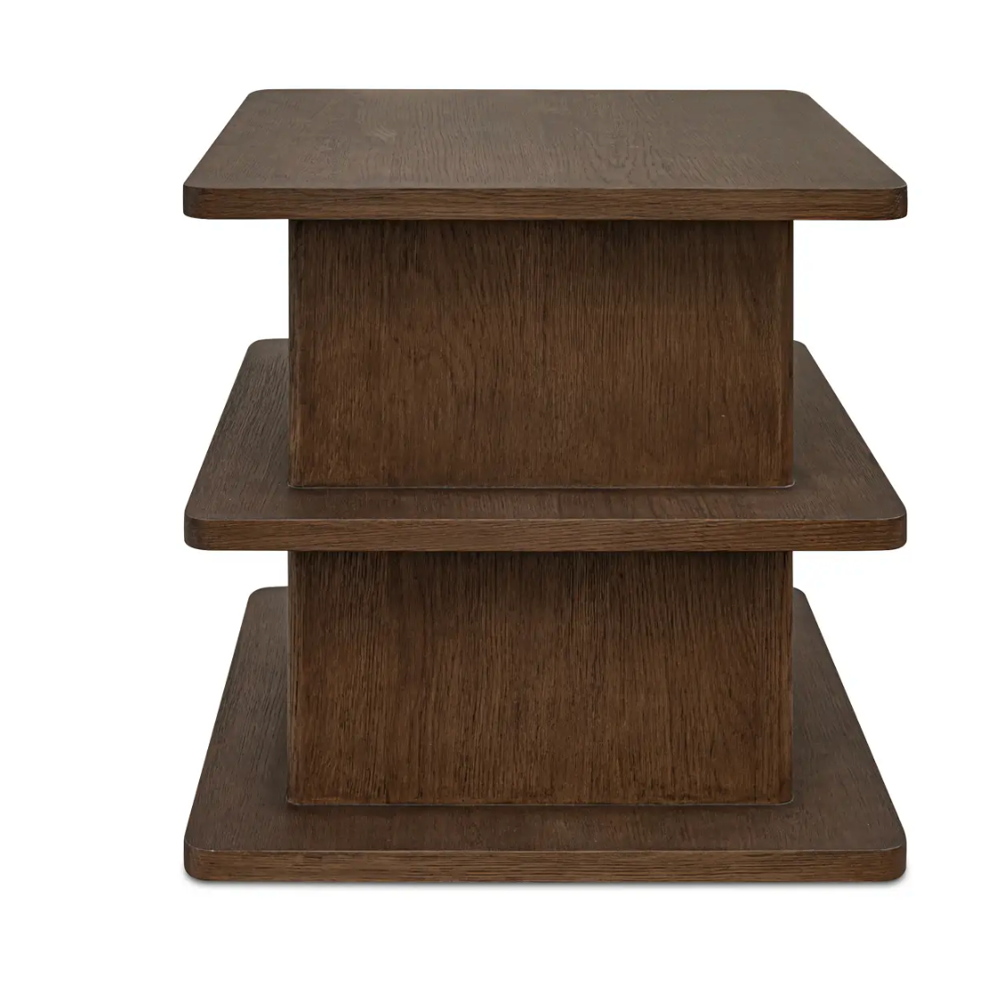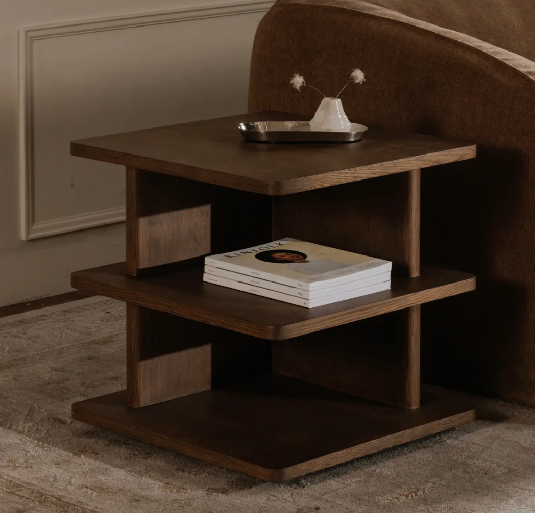 Architectural elegance meets functional versatility in the Casey side table. Its rounded edge tabletop and shelves, and bullnose-edged vertical support create a soft, inviting silhouette. Versatile and beautifully proportioned, the Casey adapts effortlessly to various settings, offering ample storage and timeless appeal also as a nightstand.