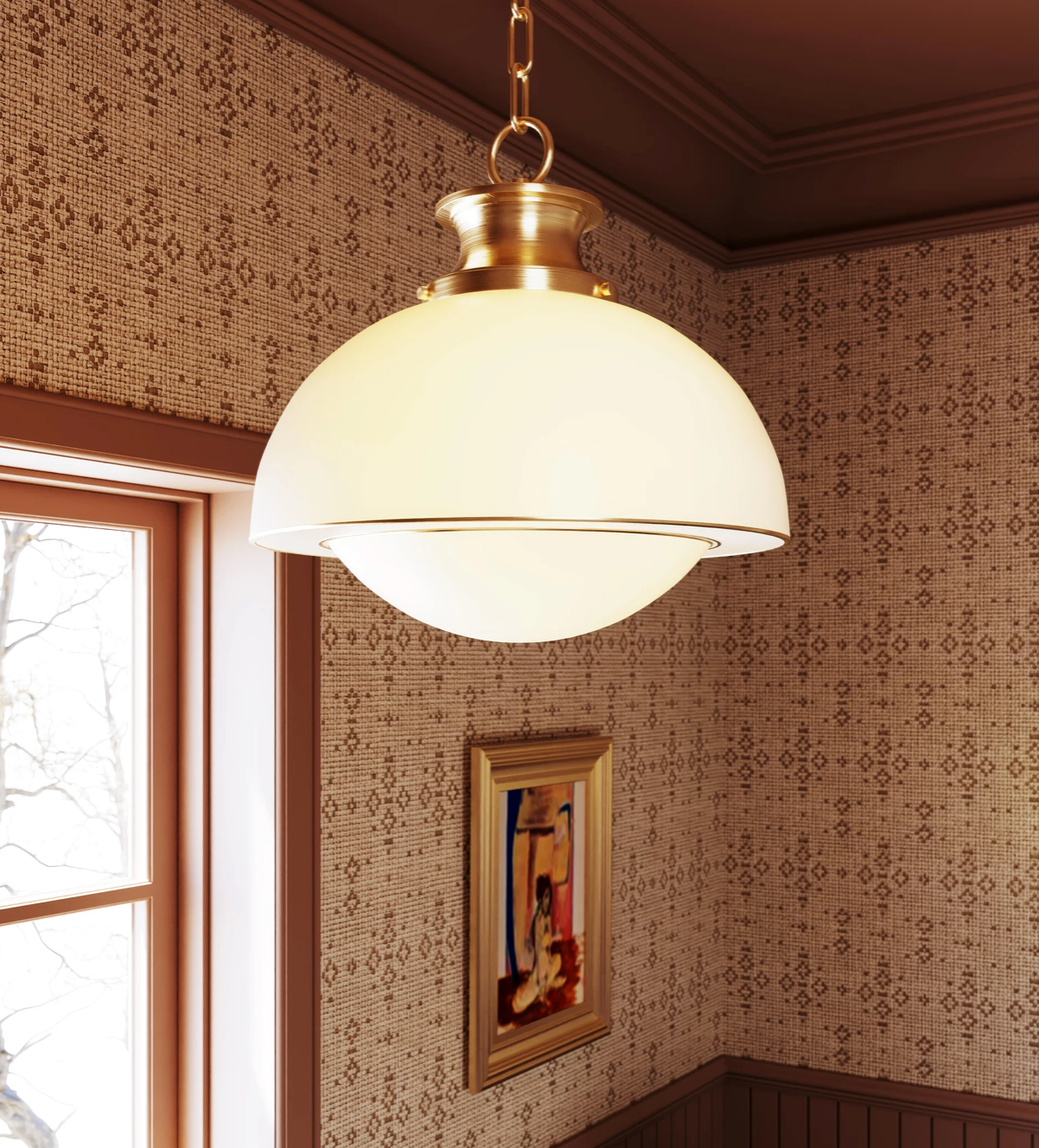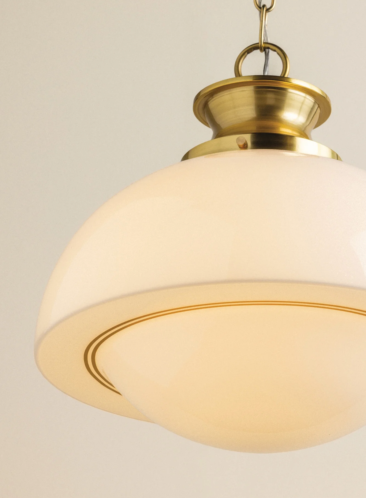 Inspired by retro silhouettes, Celine calls on mid-century style with a twist. The domed spot-plated opal glass shade glows softly, diffusing light evenly throughout the entire form. Thin gold pinstripes trace the shade, giving shape to the edges. This sophisticated everyday staple is available as a 1-light semi-flush and as a pendant.