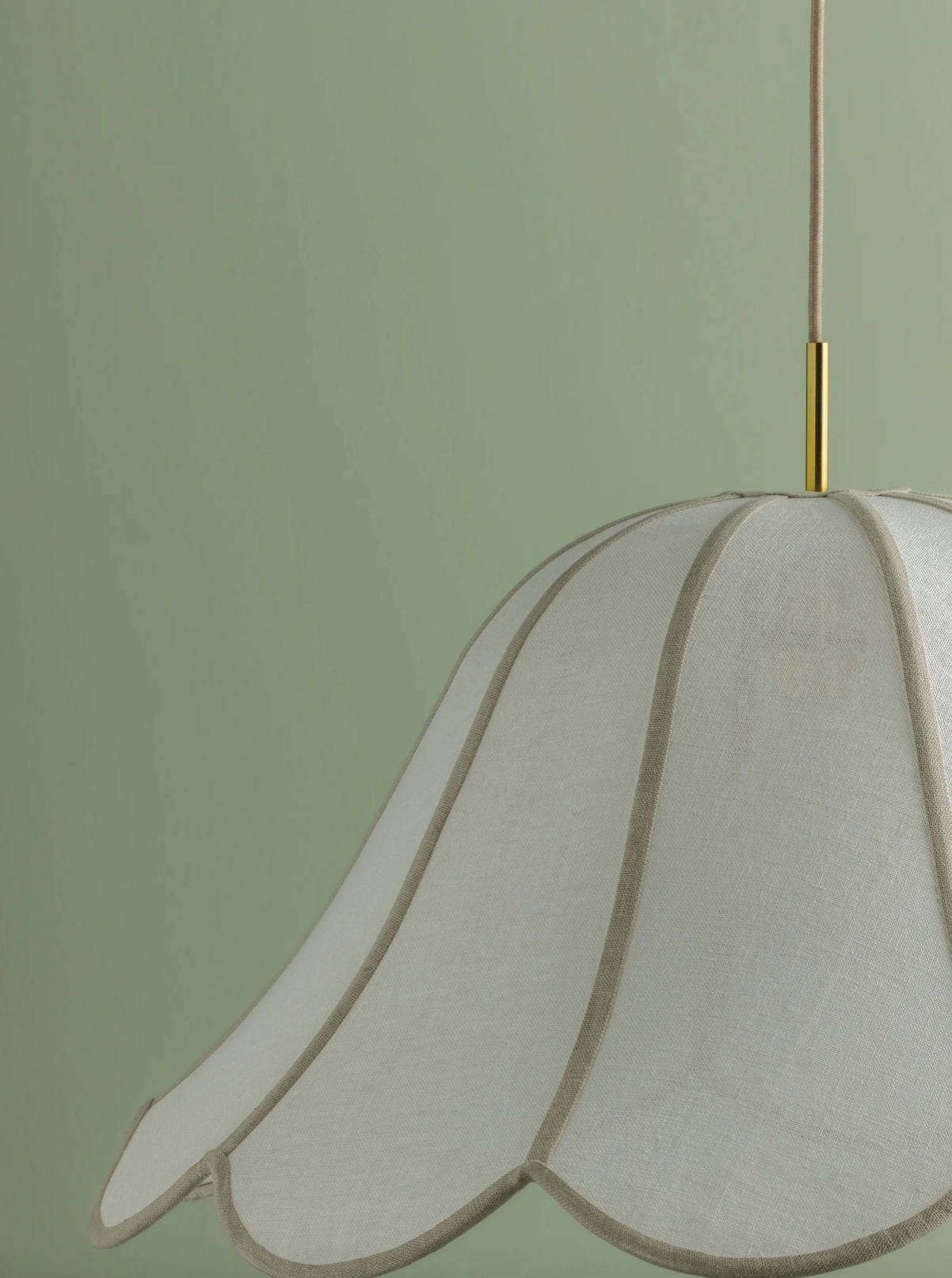 Softly floral, the Darla pendant floats overhead with its pillowy, scalloped silhouette. The voluminous inverted edges that make up the ‘petals’ spread light dynamically around the piece. Natural trim, shade tape, and cord wrap add tonal interest and texture to the crisp white linen. An Aged Brass accent adds a luxurious finishing touch to the romantic form.