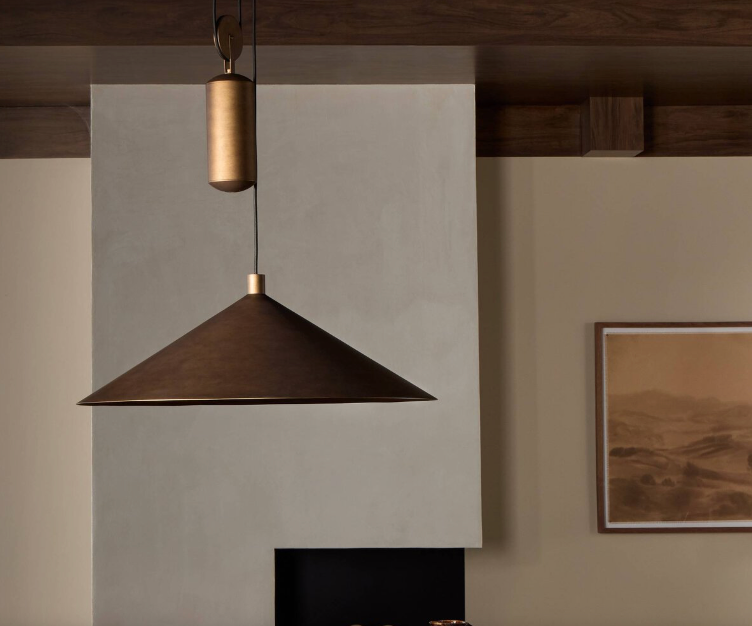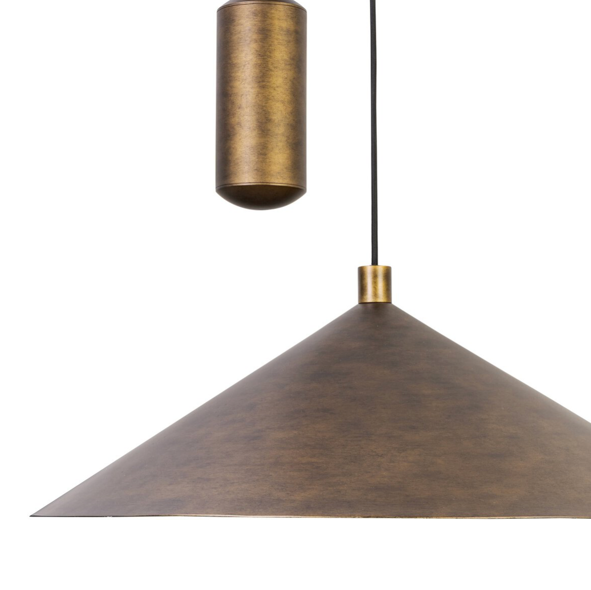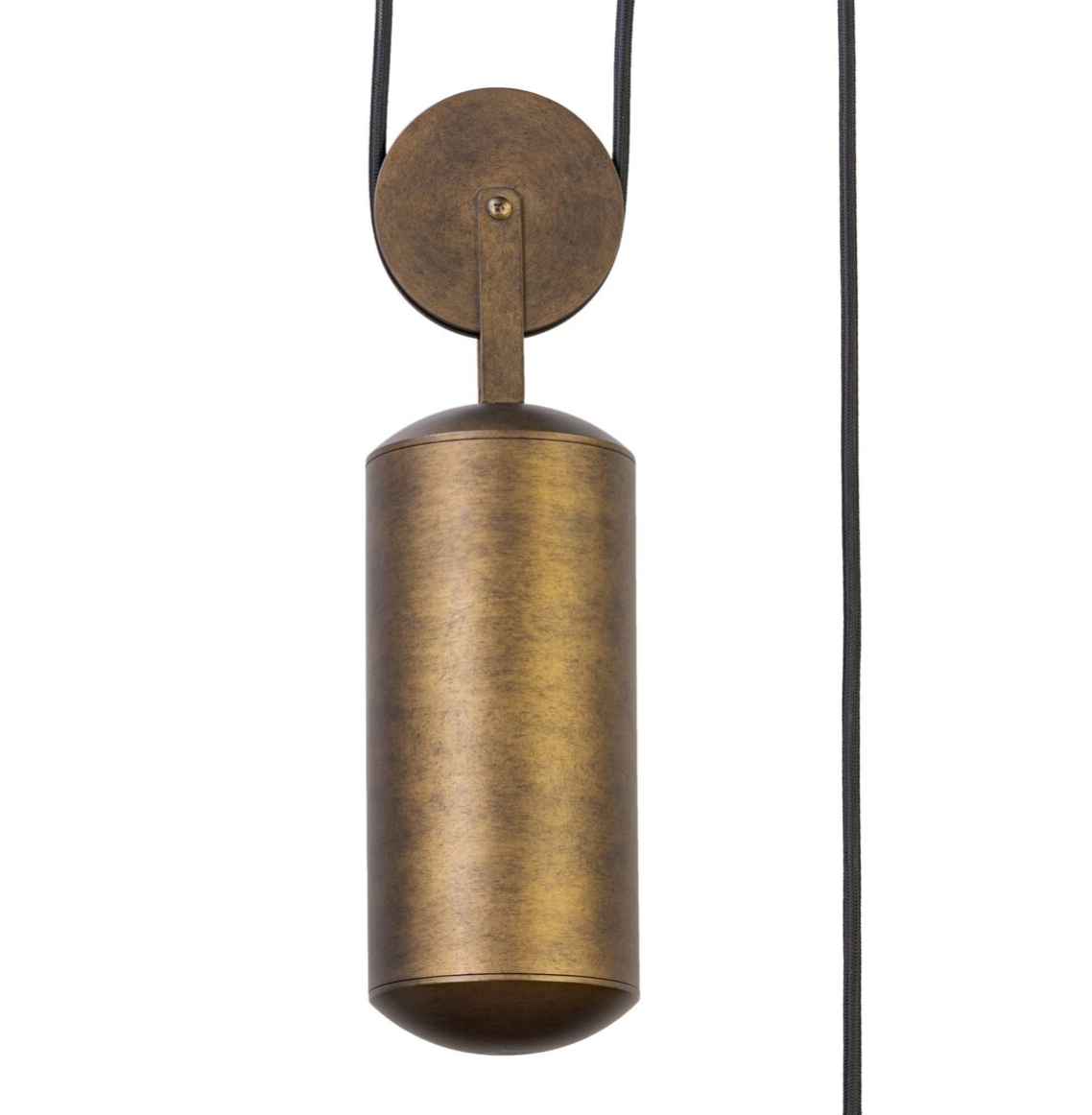 A classic lift for a modern glow. Combining the pulley system with lighting, this coolie shade pendant has an adjustable 13' of cord length, stabilized by a pill-shaped counterweight in burnished brass spun metal.