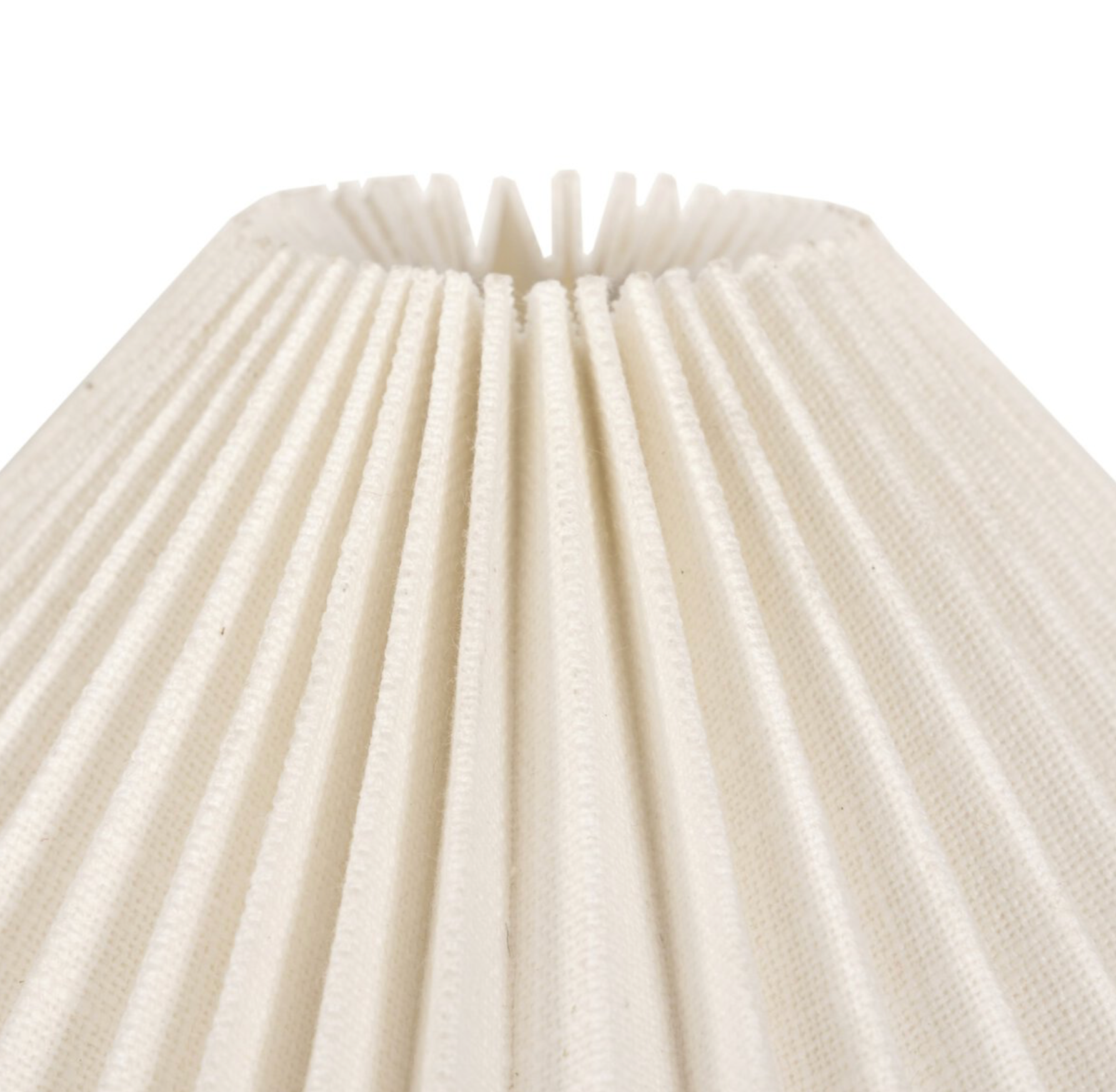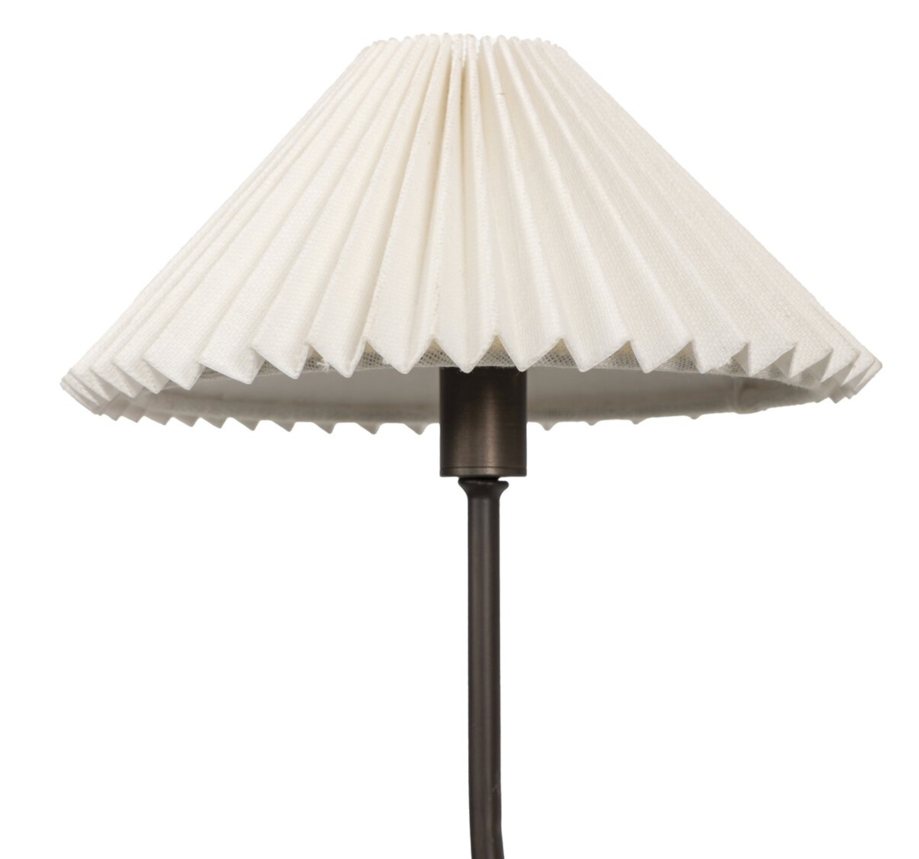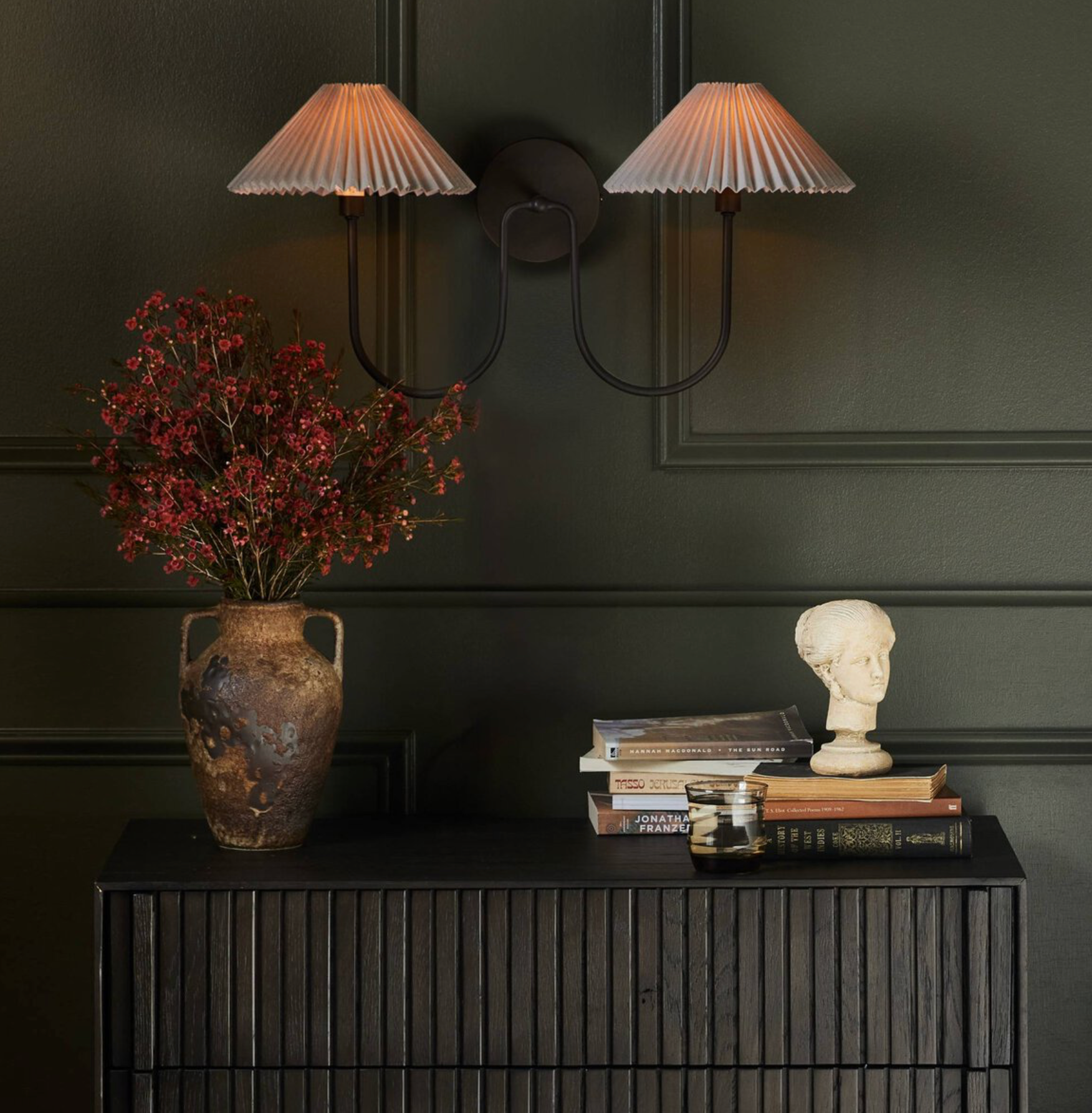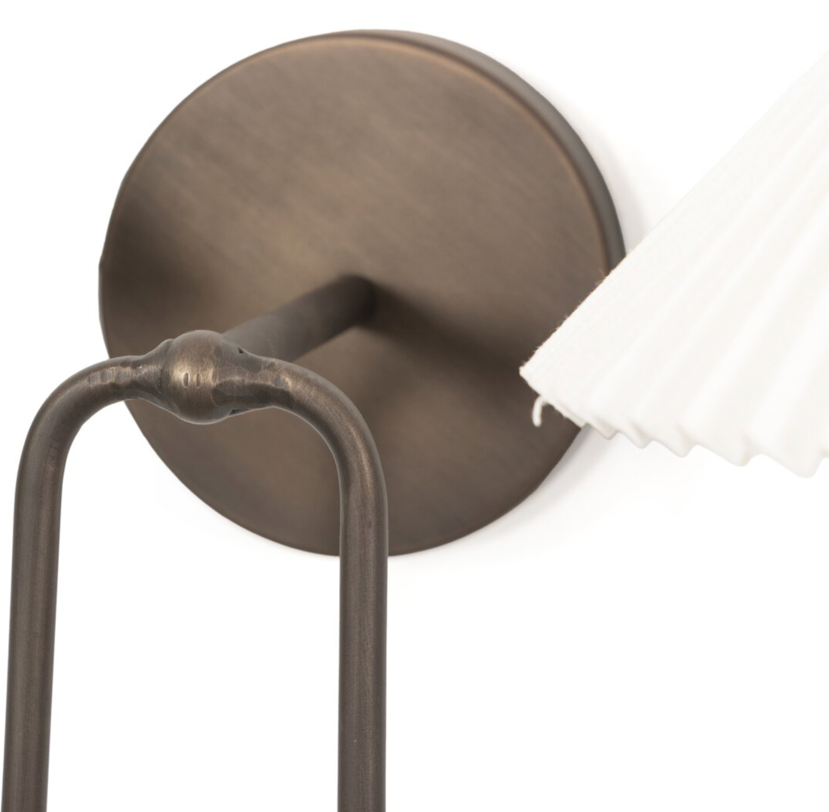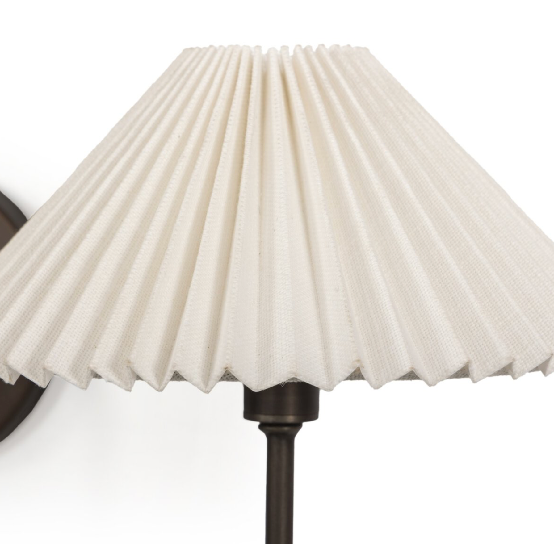 French inspiration courses this slim double sconce, as two curved bronzed arm extend from an iron backplate. Cream, accordion-pleated linen shades allow for a softened, more ambient light. T6 bulb recommended.