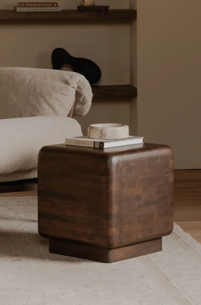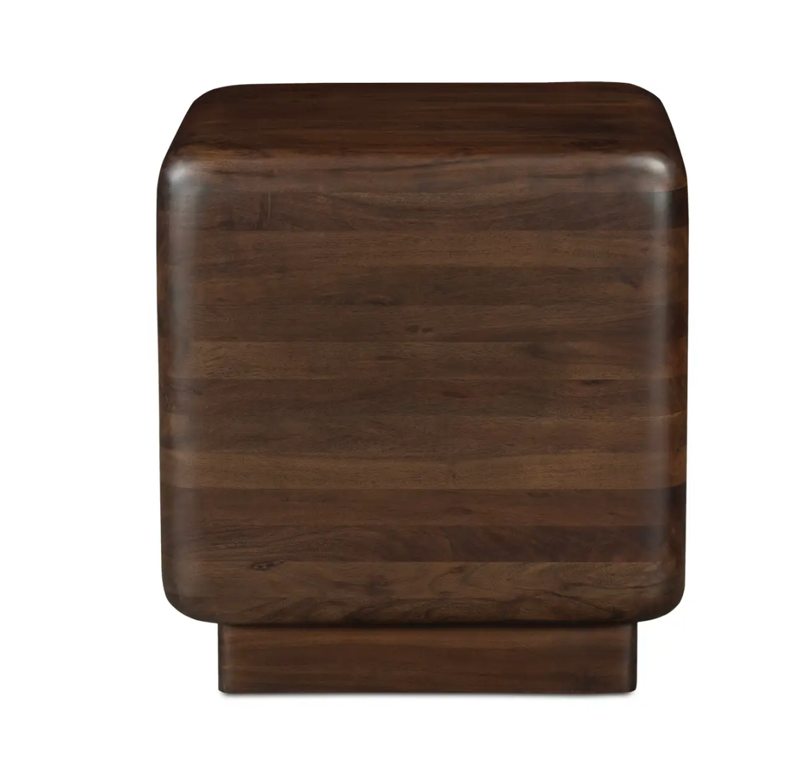 The Eton side table is a study in contrasts, marrying bold geometry with gentle curves. Crafted from rich Acacia wood, the substantial top appears to float above a recessed base, creating visual intrigue. Each piece showcases unique grain patterns through its thoughtful design and natural beauty as its dark brown finish matures the overall look.