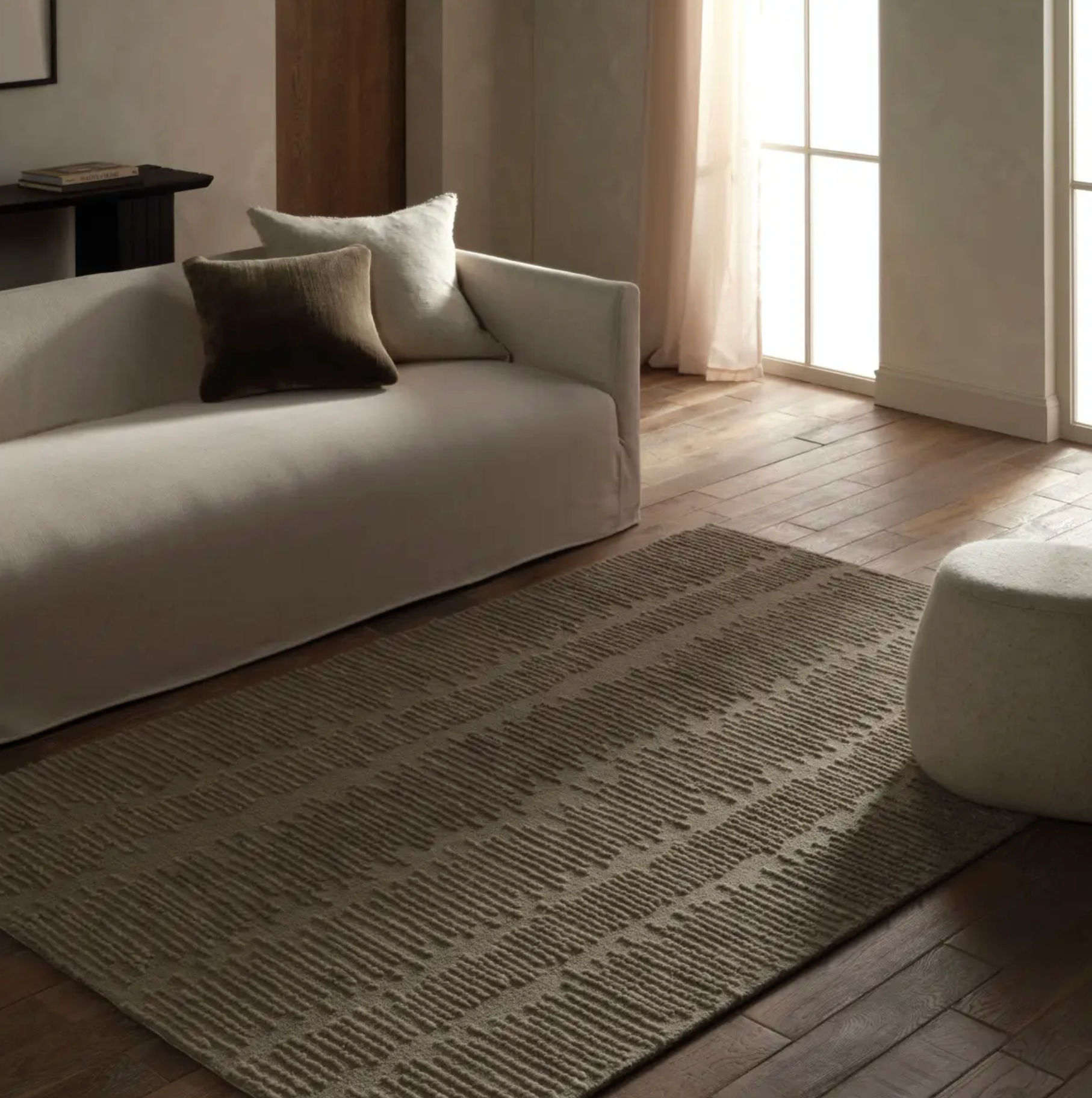 100% hand-crafted wool yarns in a harmonious blend of elevated neutrals artfully mingle in the Finnigan collection. The Radha design’s relaxed, laissez-faire modern lines pattern encourages the eye to wander across the faintly global-inspired pattern. An over-tufted finish adds a dynamic high-low texture, elevating the design.