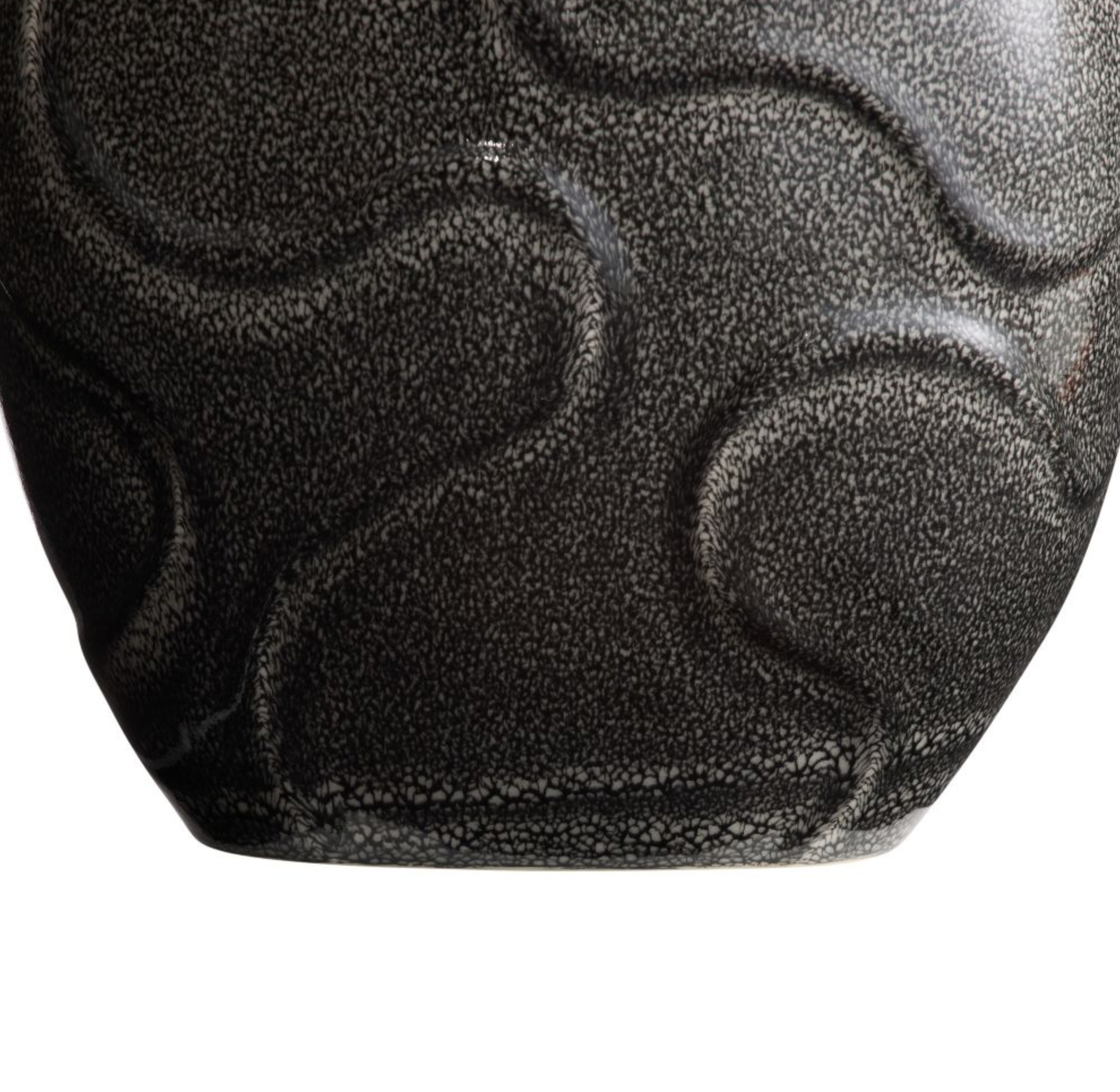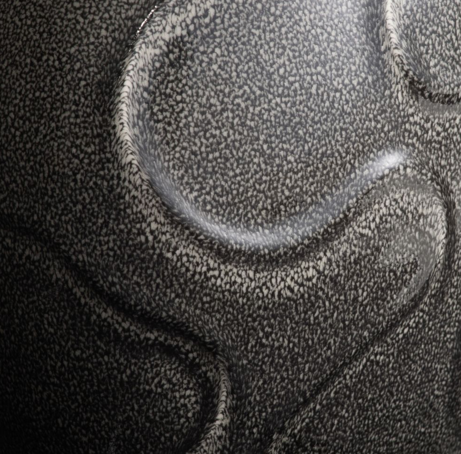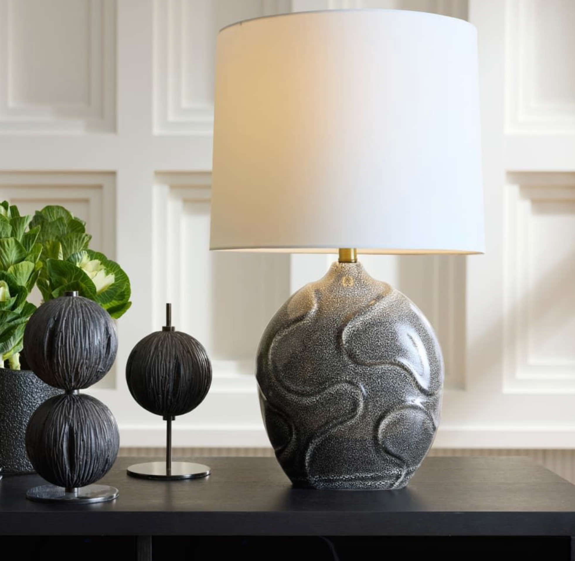 The porcelain lamp's reinvented organic silhouette is reminiscent of free-form brain coral or river rocks. The obsidian reactive glaze possesses a shagreen-inspired pattern to add an extra layer of texture. We designed the Isla on a smaller, shallower scale to suit a narrow console or side table. Finished with antique brass hardware and finial and an off-white microfiber drum shade lined in off-white cotton. Finish will vary.