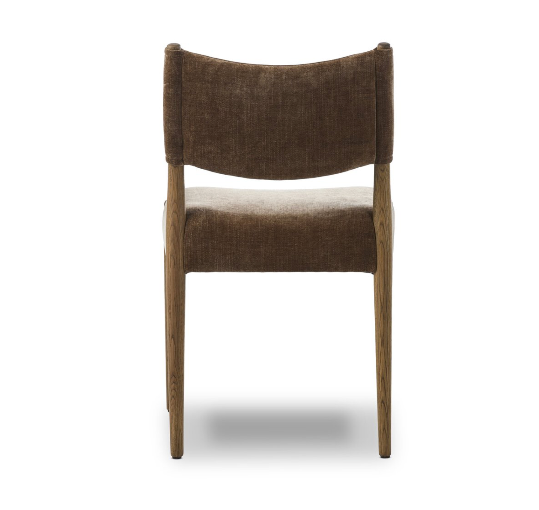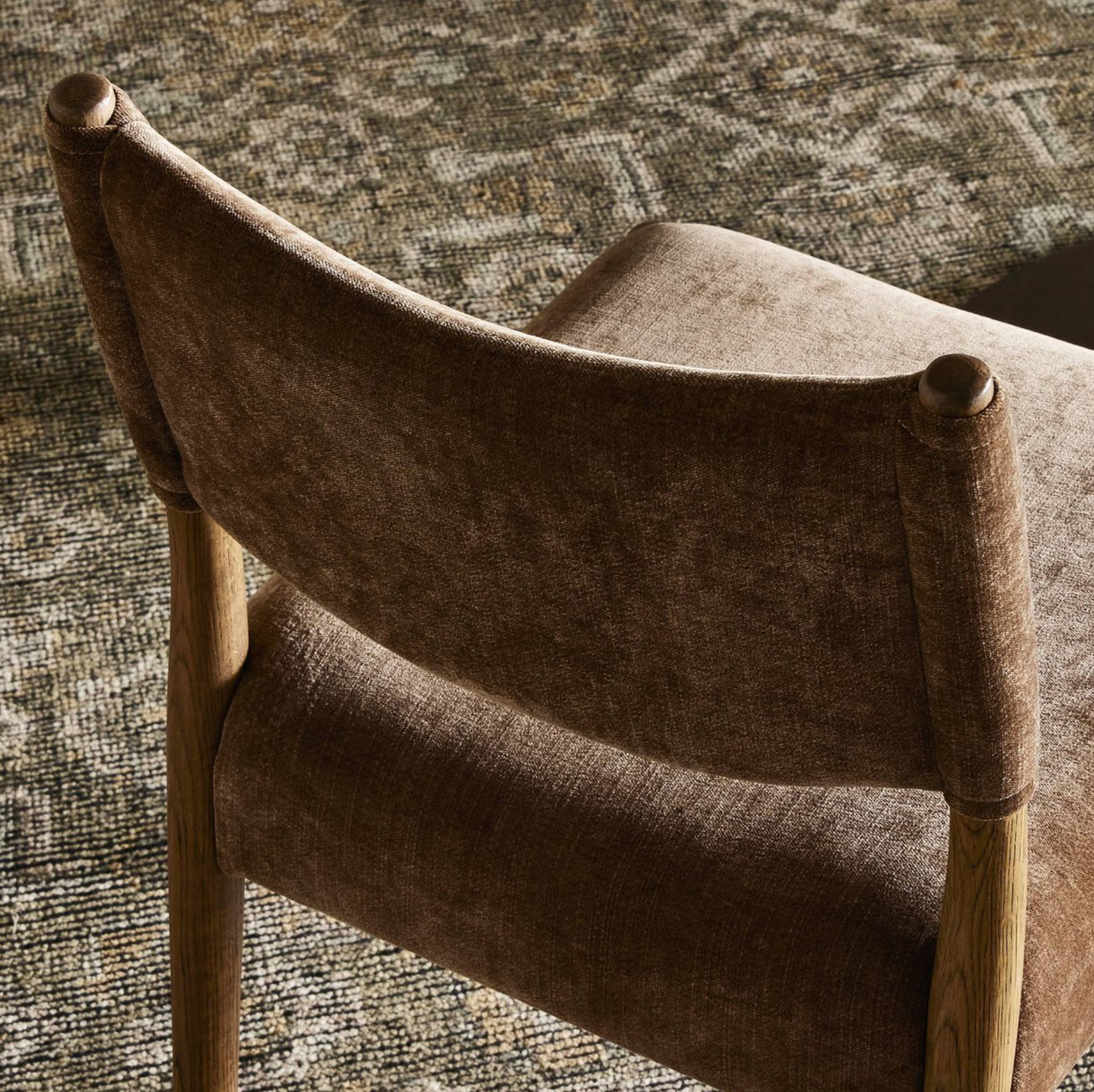 A midcentury-inspired piece brought to modern times. A supportive, sling-style back and seat cushion are upholstered in a soft, velvety fabric, with toasted oak armless framing.