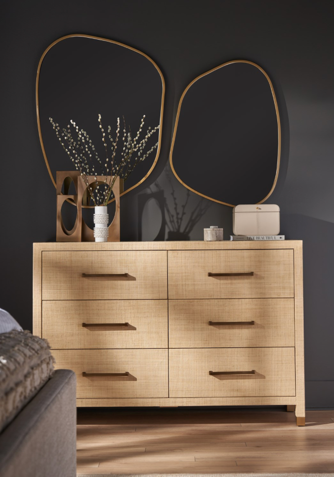 The Lea Dresser, featuring six drawers, is elegantly wrapped in raffia, presenting a textured and sophisticated appearance. Completed with bronzed bar hardware and leg accents, this piece elevates any space with its refined and distinctive charm, blending seamlessly into both modern and classic interiors.