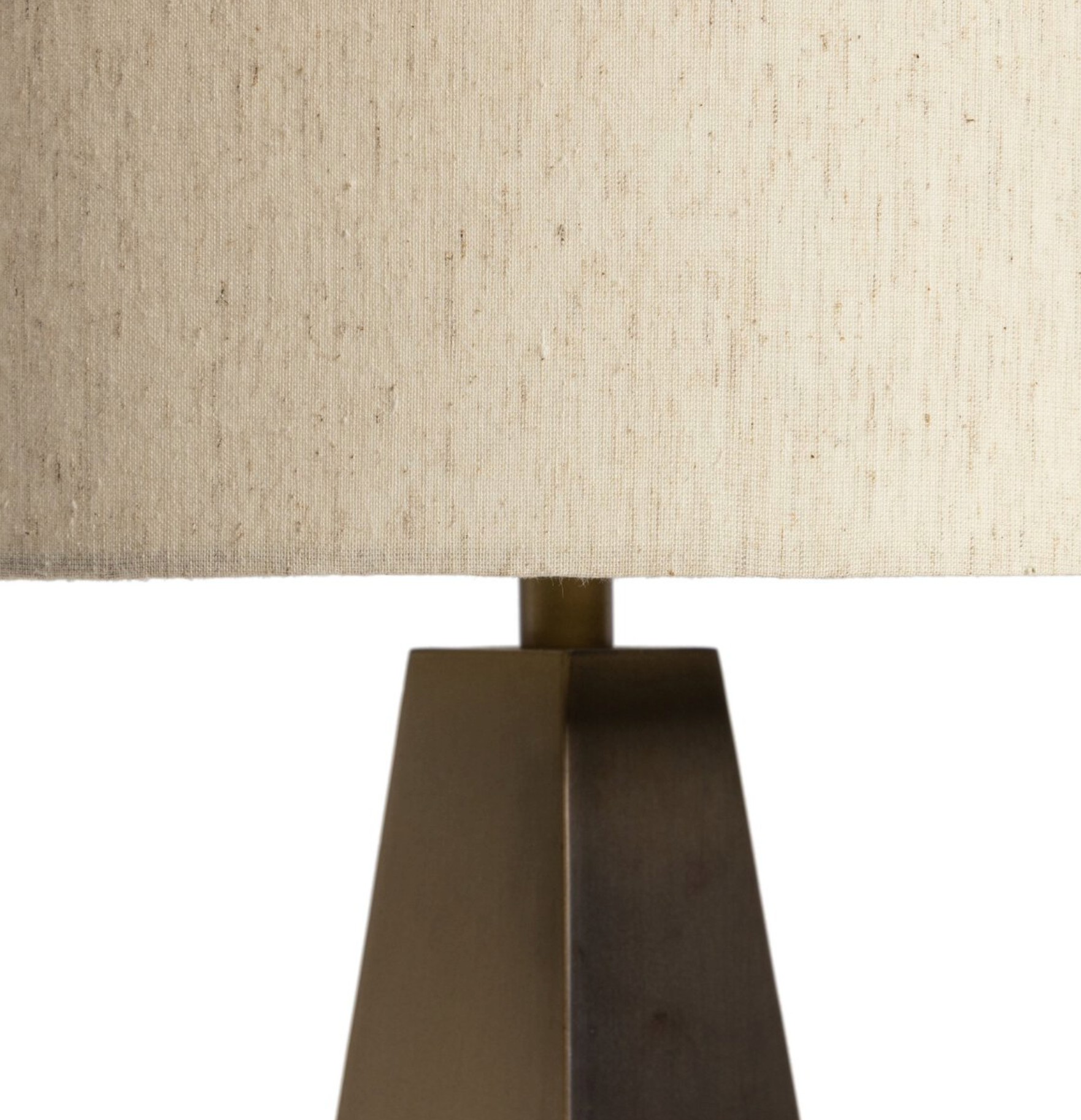 Bring a tonal touch to the desktop or bedside, with a pyramid-style base finished in light antique brass then paired with a beige cotton shade.