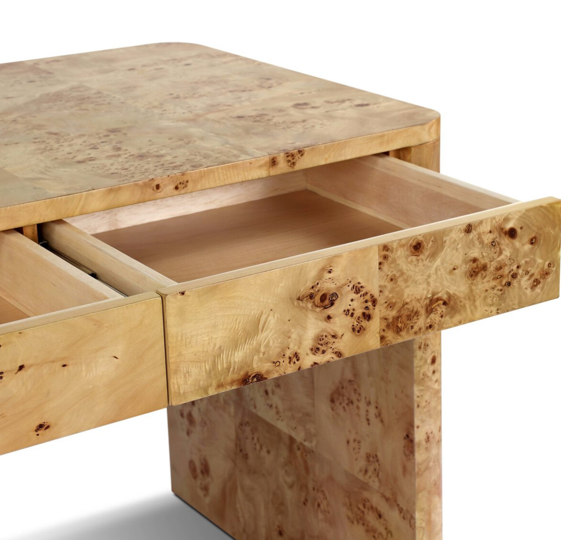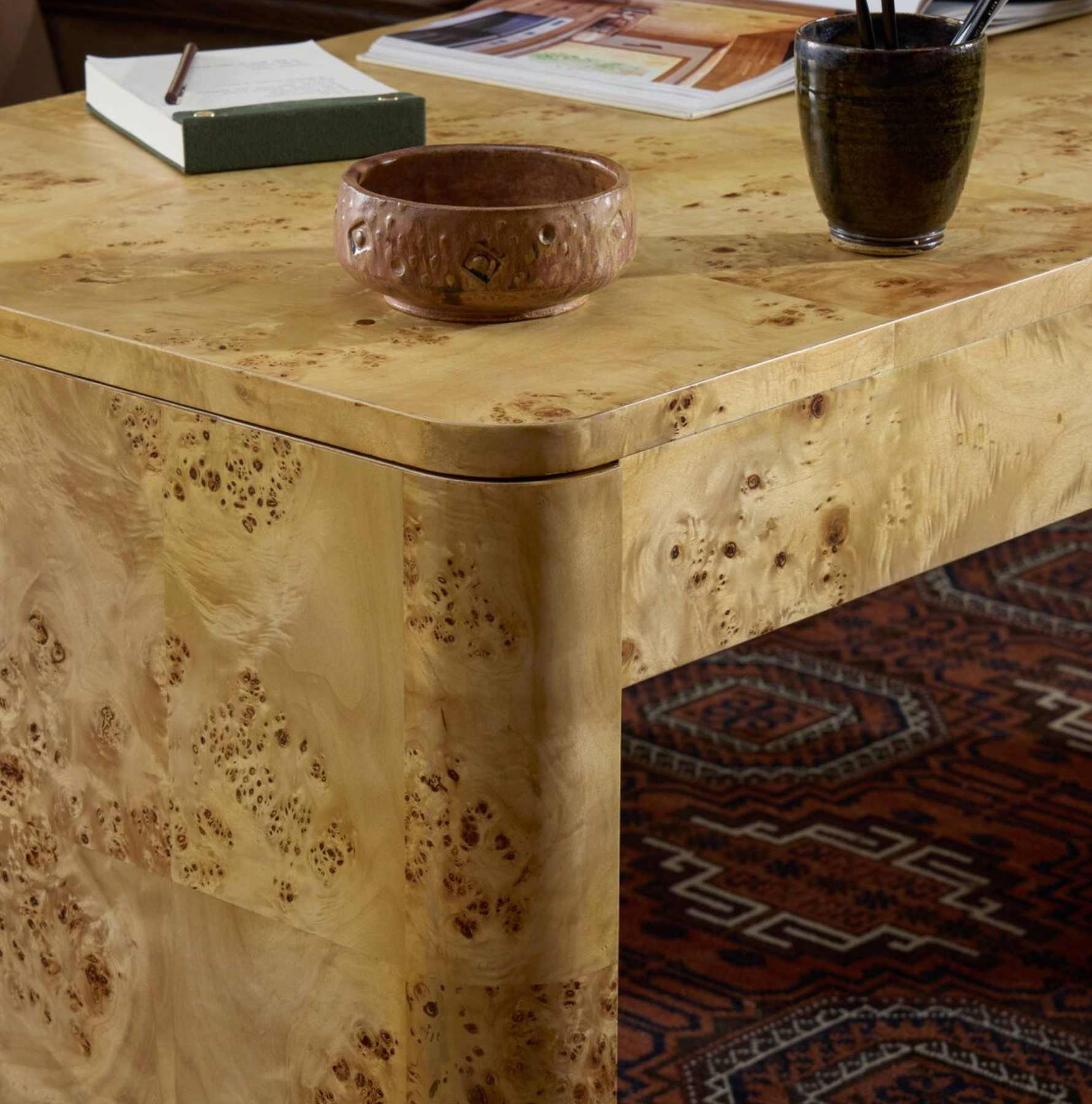 A simple, understated shape keeps this piece's spotlight on its unique swirling burl pattern. All-natural poplar is beautifully finished to amplify the organic shading with all its highs and lows. Each desk is completely unique with variations in color and pattern inherent to the wood.