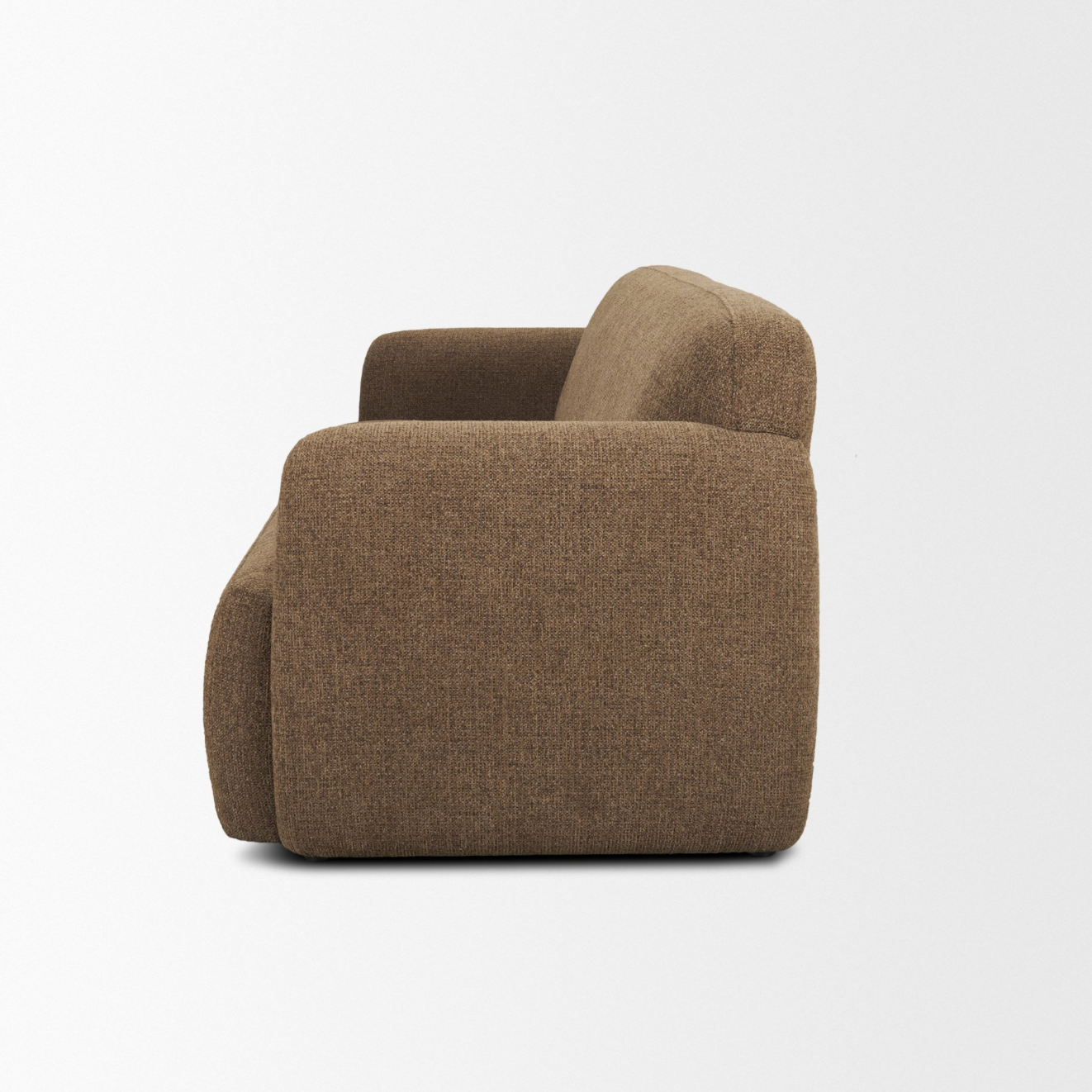 The Sage Sofa is upholstered in soft, thick textured mocha brown fabric that lends an heirloom appeal, featuring soft curves and an inviting, relaxed silhouette.
