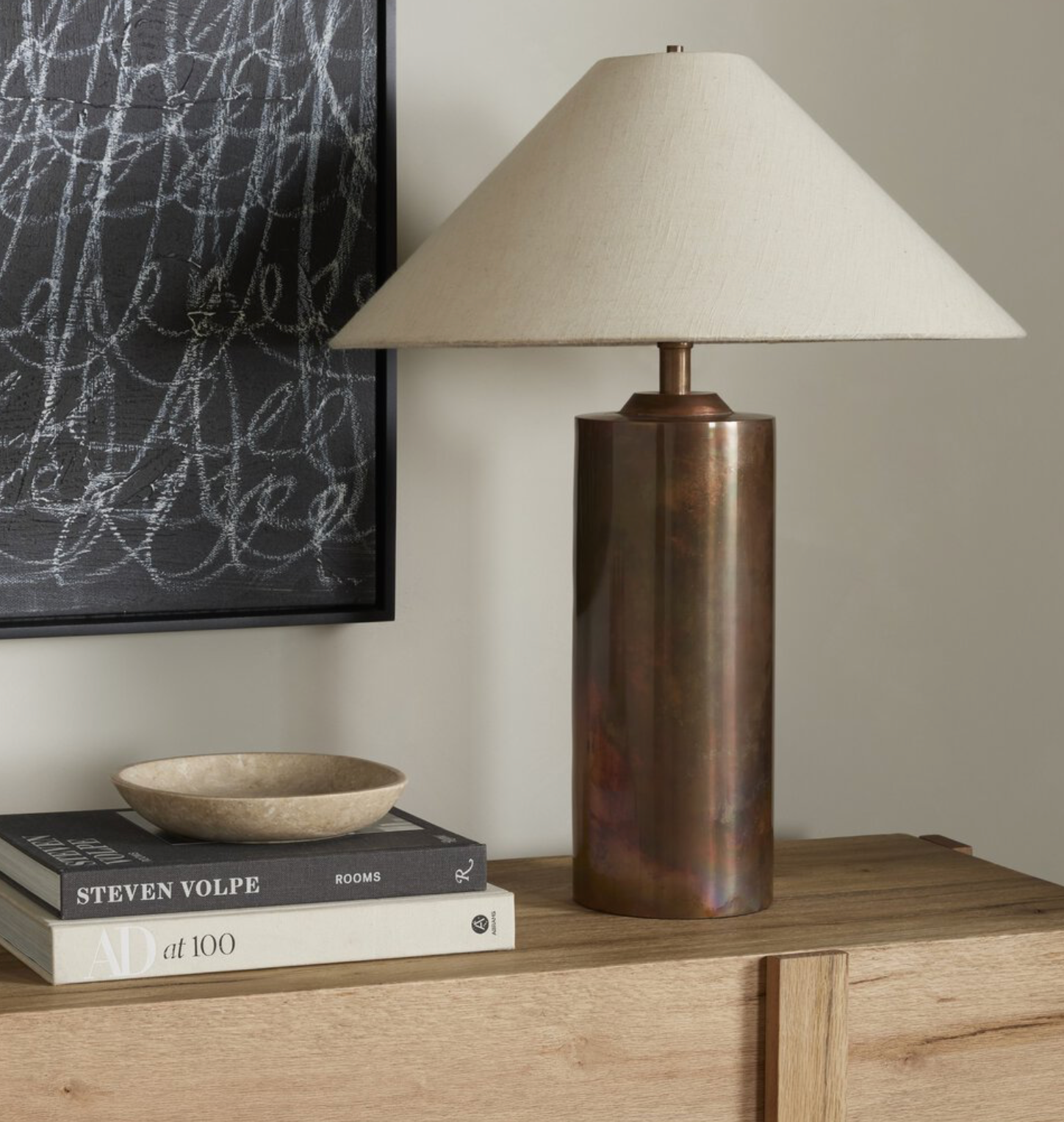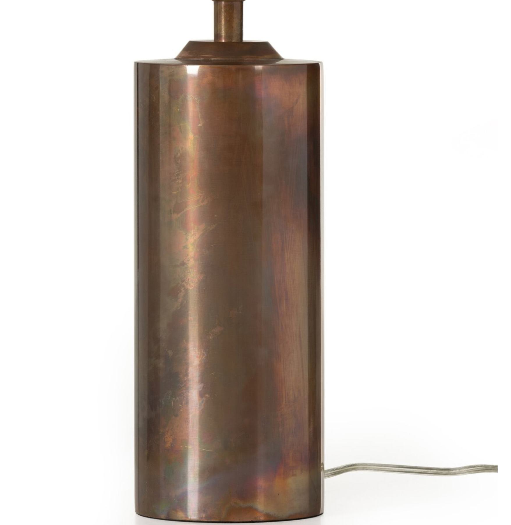 All-metal table lamp finished with a unique process to accomplish its iridescent acid wash look. The metal is first polished, then oxidized. It's finished with a heating process and lacquer seal for an antiqued look, complemented by a simple linen shade.