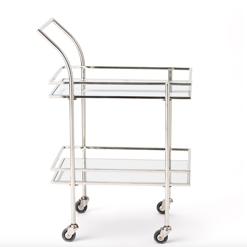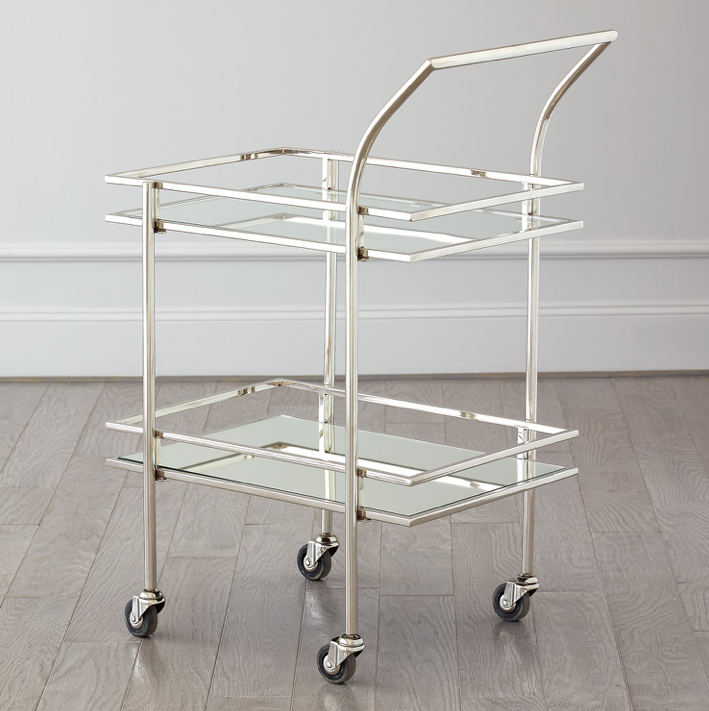 Entertaining is made easy with this versatile Rectangular Mirrored Bar Cart. The bar cart has 2 mirrored shelves which provide a worry free surface to place liquor, mixers, glasses, ice and all the accoutrements necessary for a successful soiree. Finished in polished nickel with casters of ease of movement.