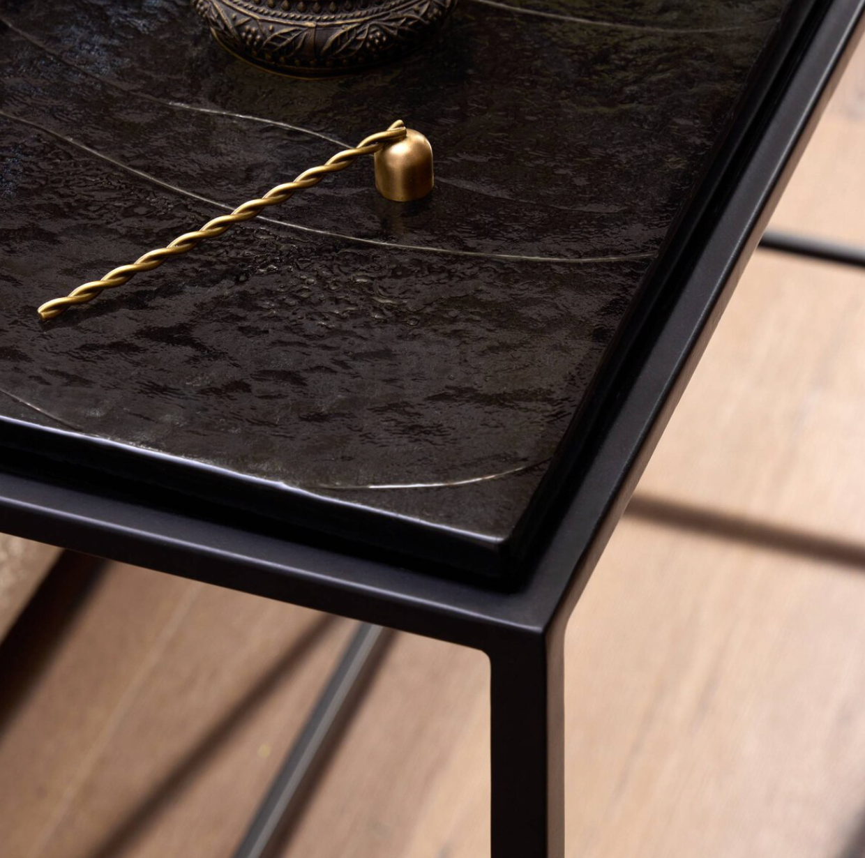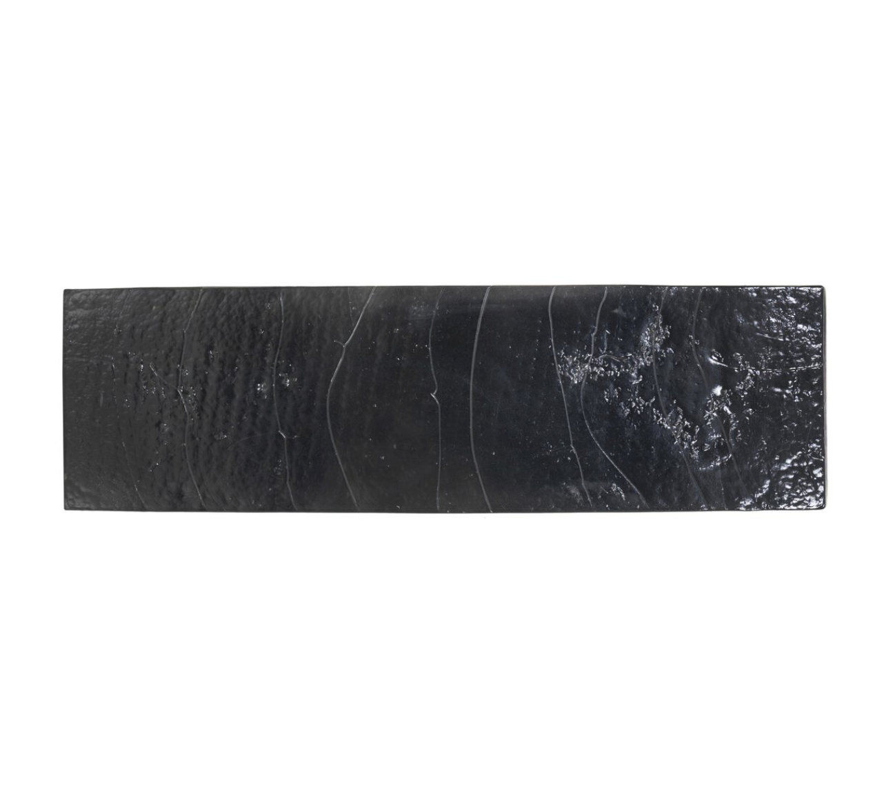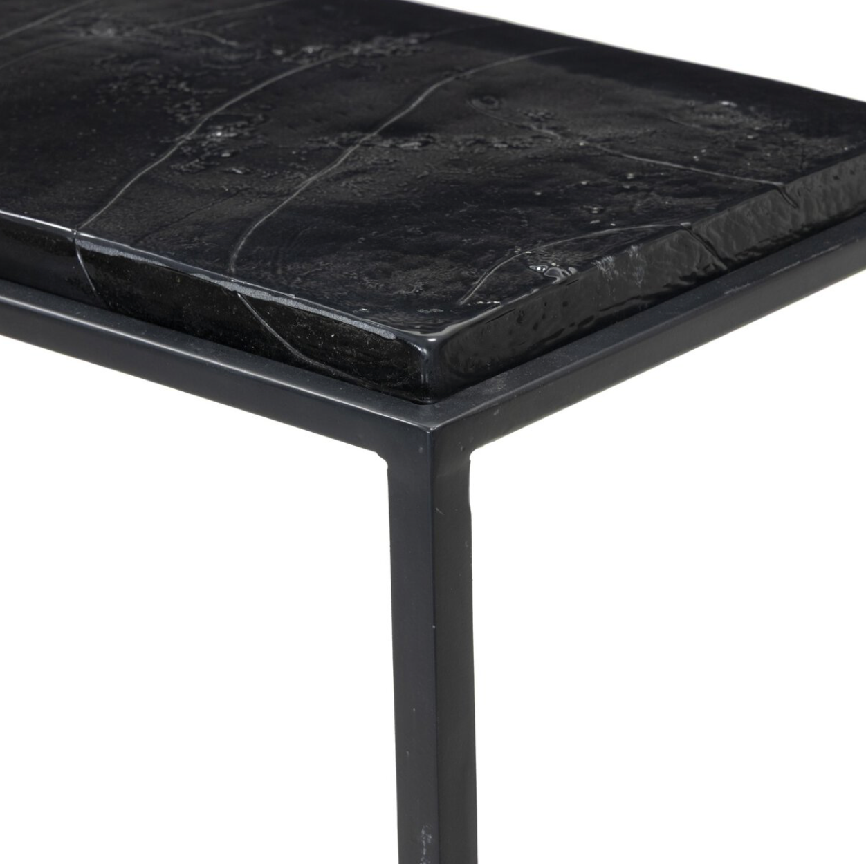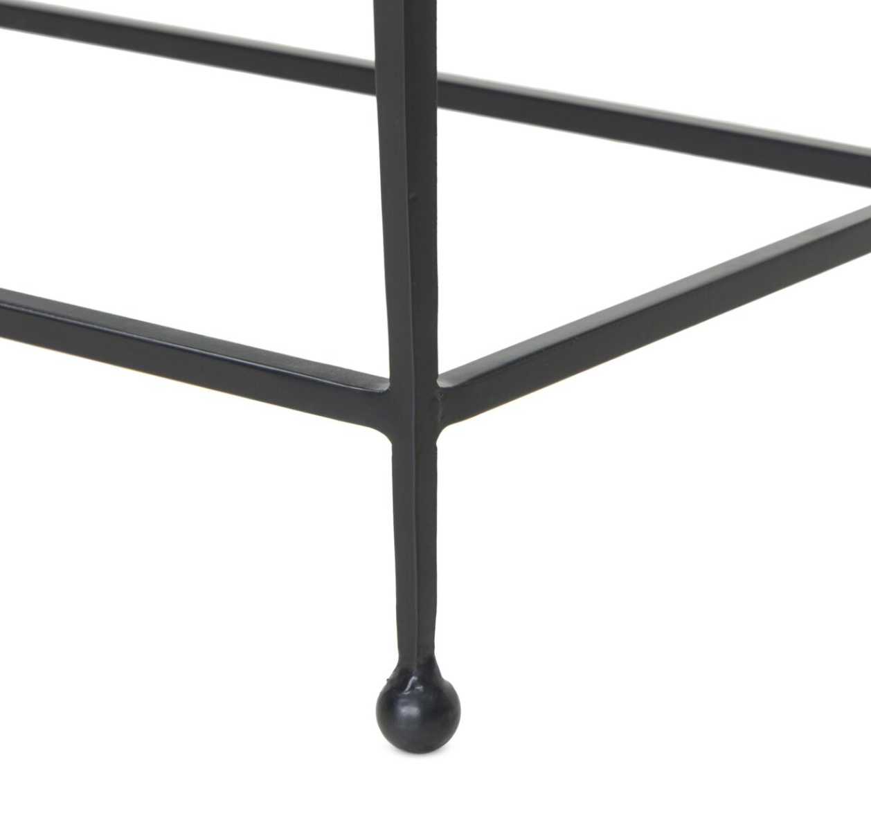 A slim, airy base of black-finished iron supports this console table of smoked black glass.