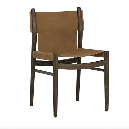 Crafted from a single piece of supple nubuck leather, the seat and back of the Argus Dining Chair are elegantly suspended within a solid oak frame. Inspired by the relaxed form of a director's chair, it features stitched leather side panels highlighting its artisanal finish. With its clean profile and sling-style silhouette, it channels a refined mid century-modern aesthetic.